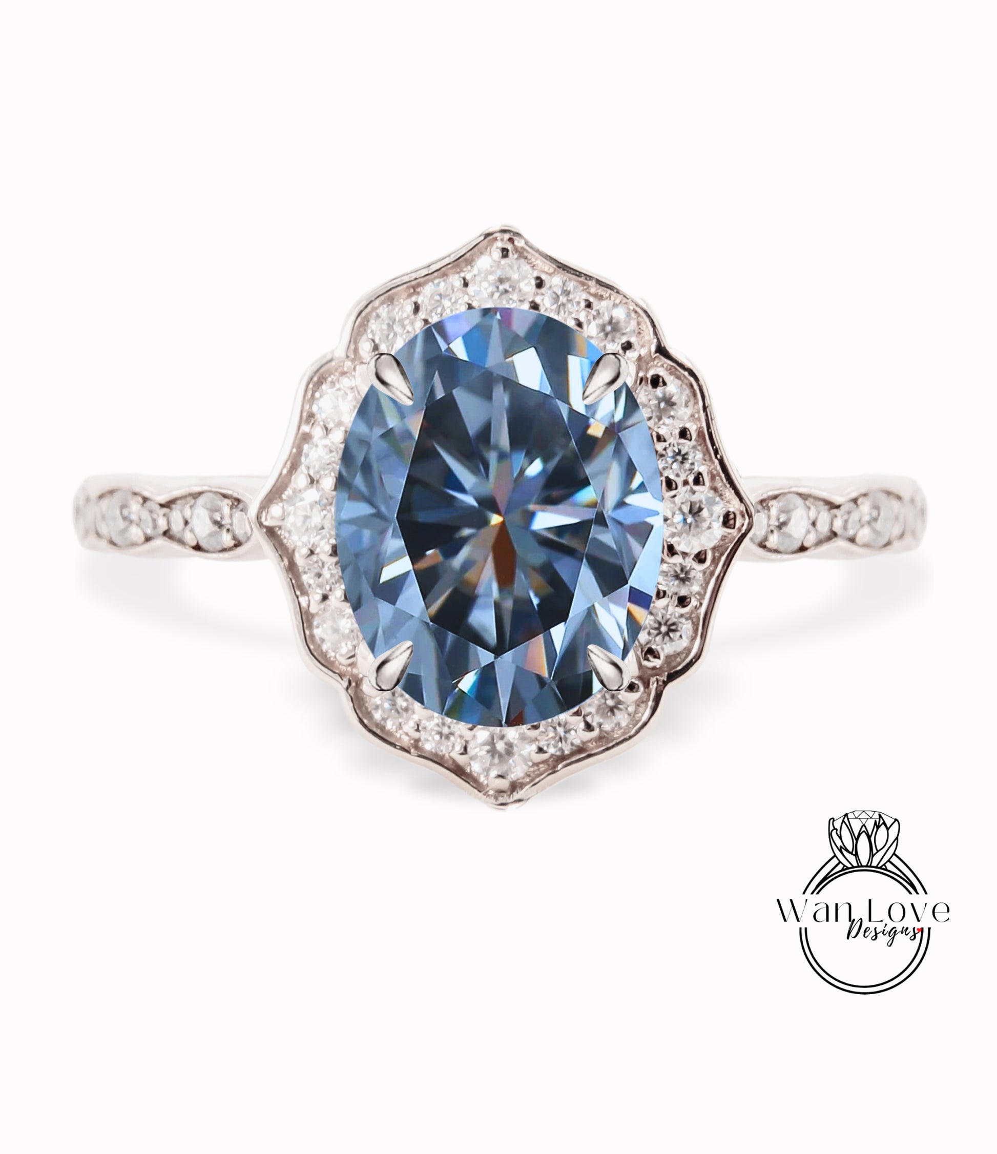 Grey Moissanite & Diamond halo scalloped engagement ring unique vintage ring rose gold bridal wedding ring anniversary gift