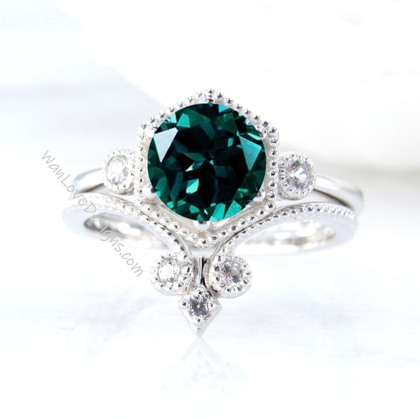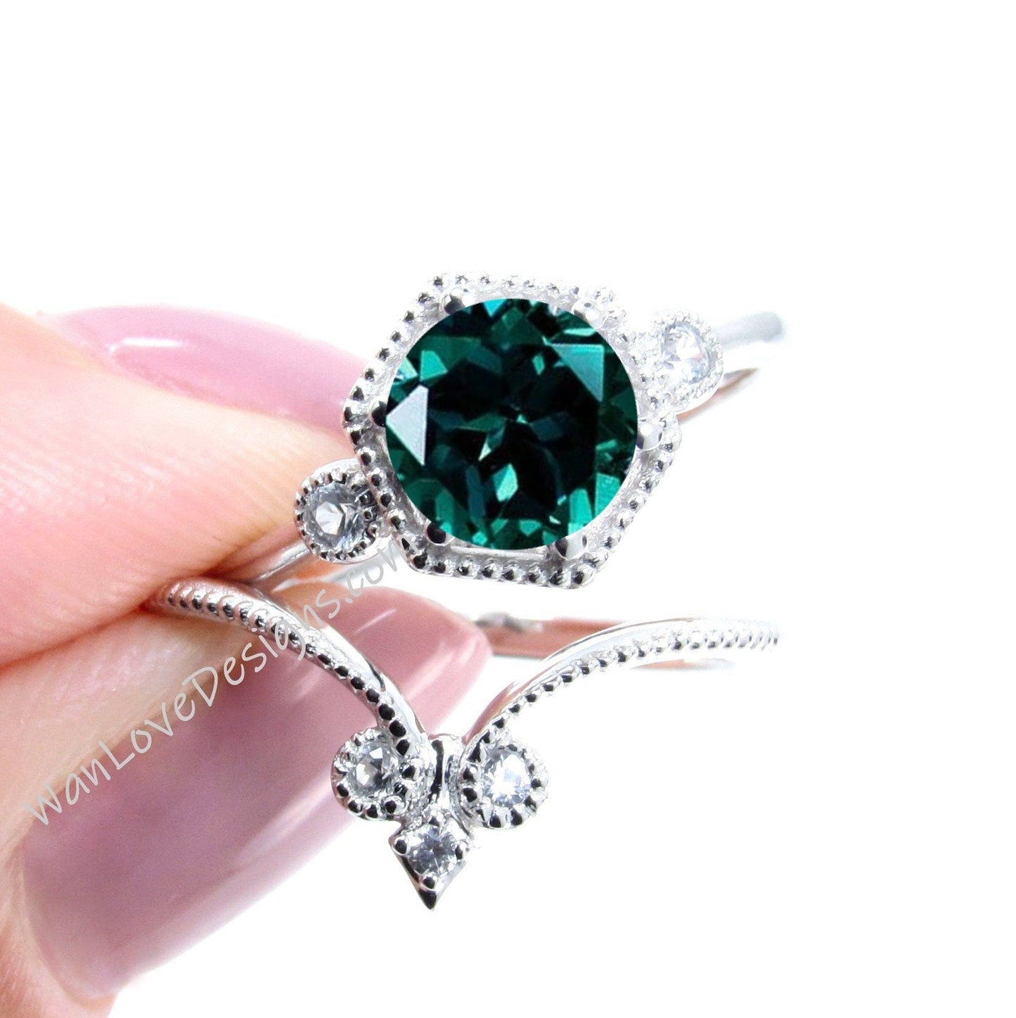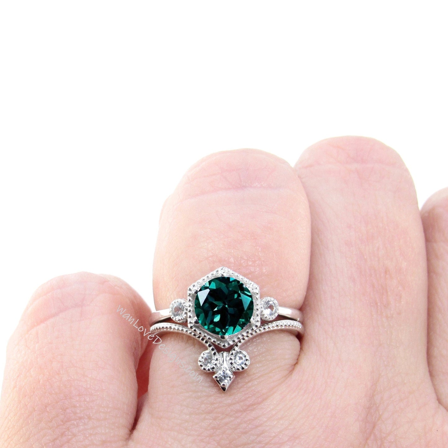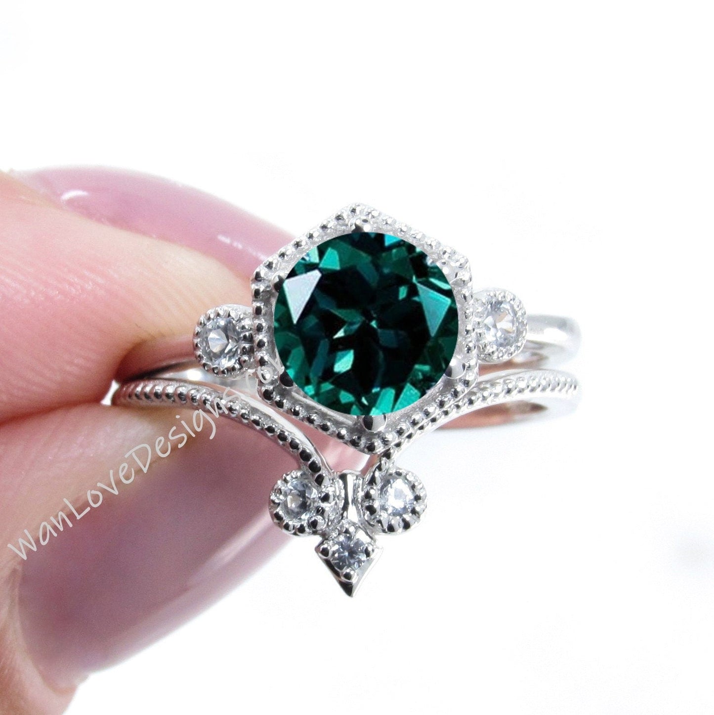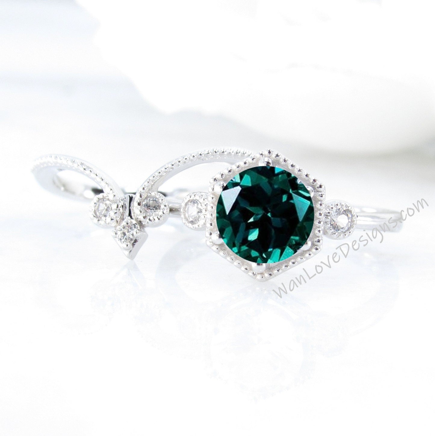 Hexagon shaped Emerald engagement ring 3 gem stone moissanite diamond ring chevron fleur de lis wedding band promise bridal ring set
