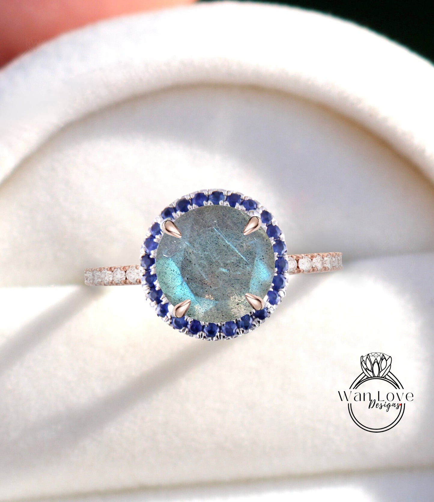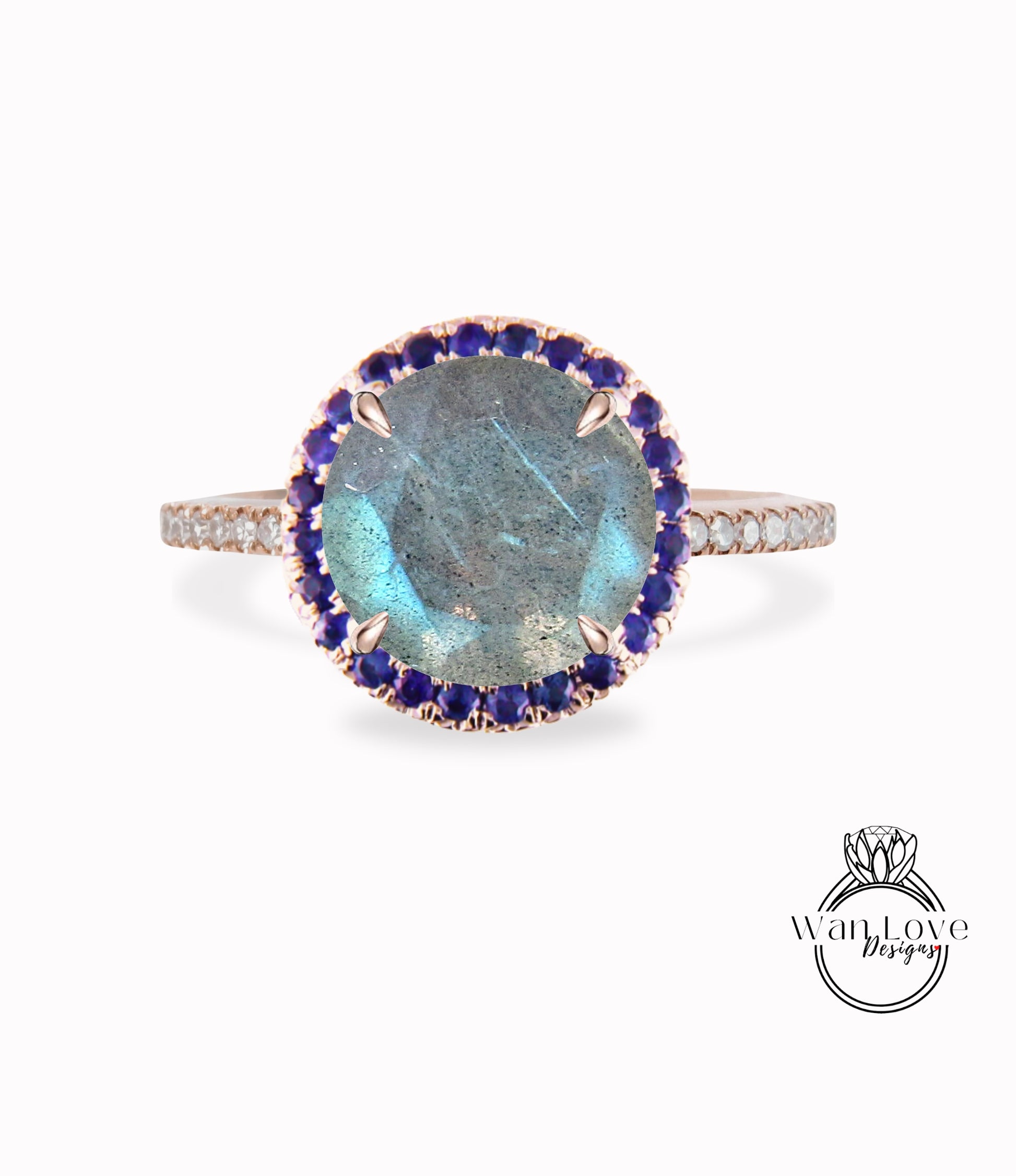 Labradorite Blue Sapphire & Diamond Round Halo Engagement Ring, Custom, Wedding,Anniversary Gift, 14k 18k White Rose Yellow Gold, Platinum