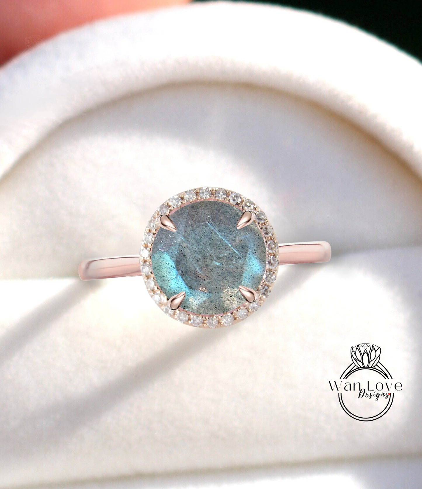 Labradorite & Diamond Round Halo Plain band Engagement Ring, Custom Wedding Anniversary Gift, Basket, Commitment, Proposal,Promise,Bridal