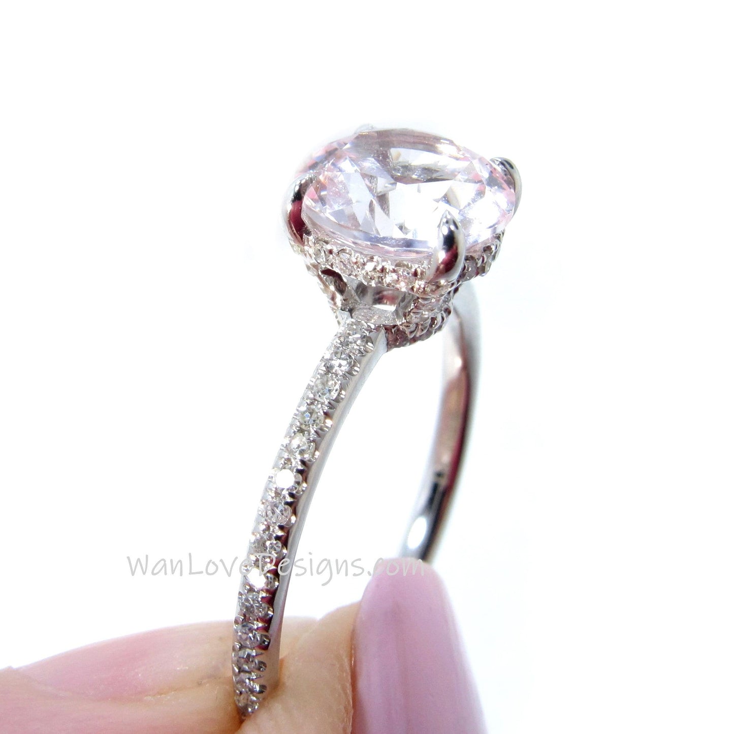 Light Pink Sapphire & Diamond Elongated Cushion Side Halo 3/4 almost eternity Engagement Ring Diamond prongs basket ring, Custom, Wedding Bridal Anniversary Gift