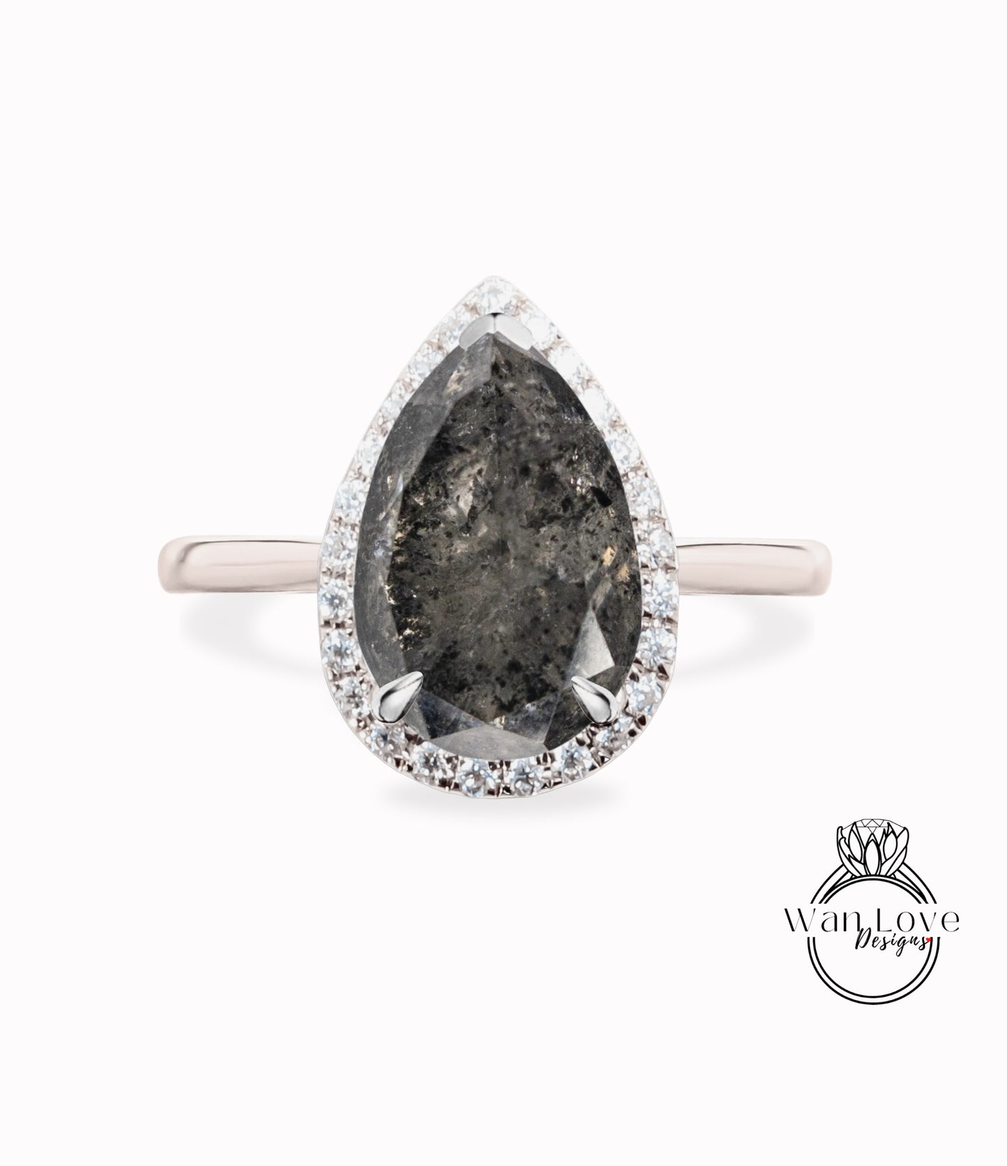 Salt & Pepper Diamond Halo Pear Engagement Ring plain band, Wedding pear halo salt and pepper diamond dainty minimal solid gold bridal ring