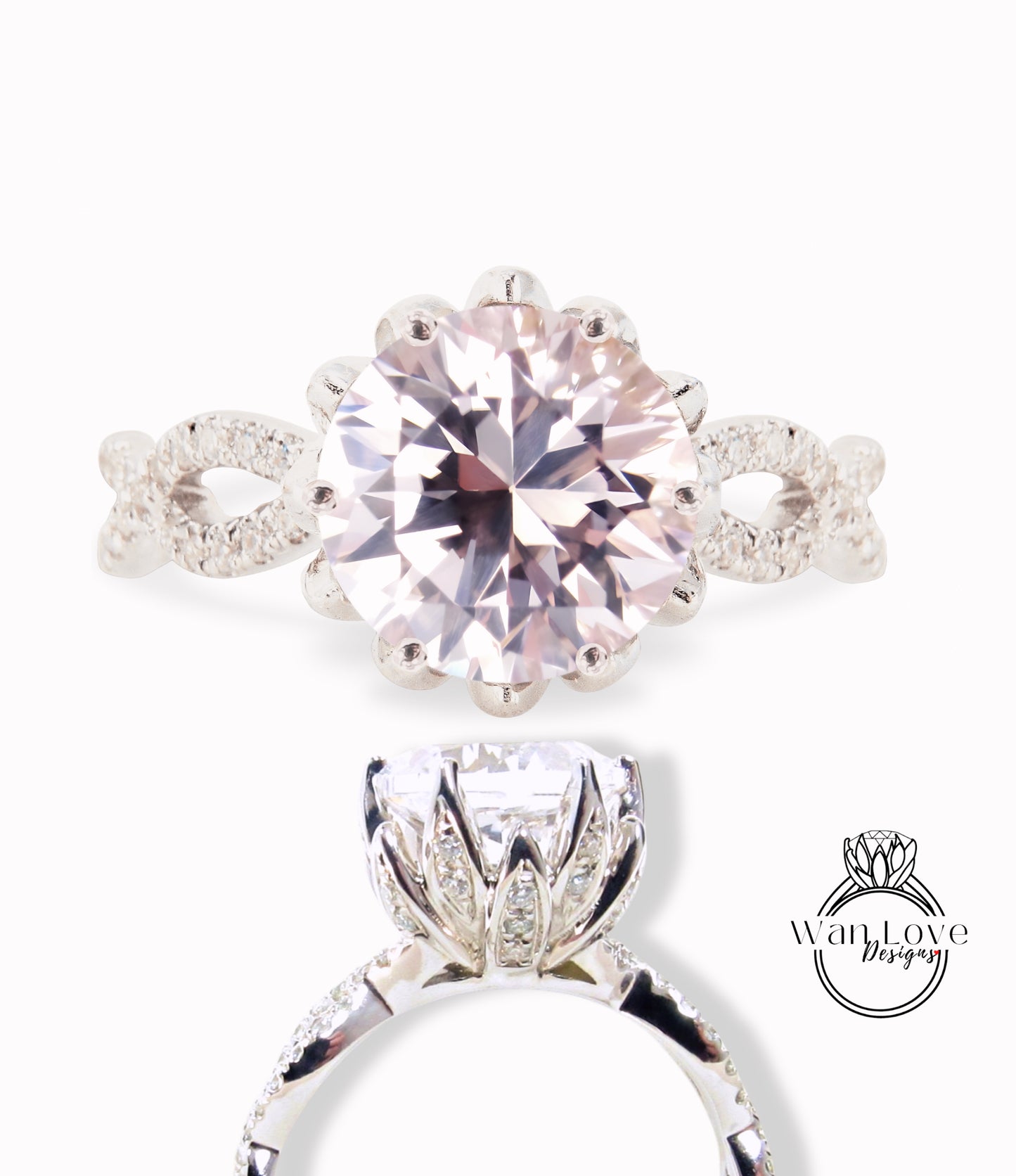 Light Pink Sapphire engagement ring vintage Lotus flower two row ring Diamond twisted ring unique floral Bridal Promise Anniversary ring