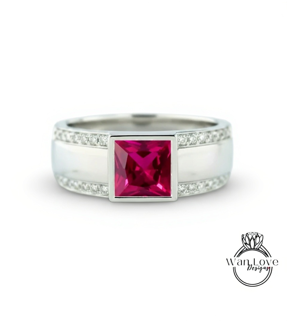 Men's Black Spinel Wedding Band | Square White Gold Men Band | Princess Cut Black Diamond Wedding Ring | Unique Men's Wedding Band
