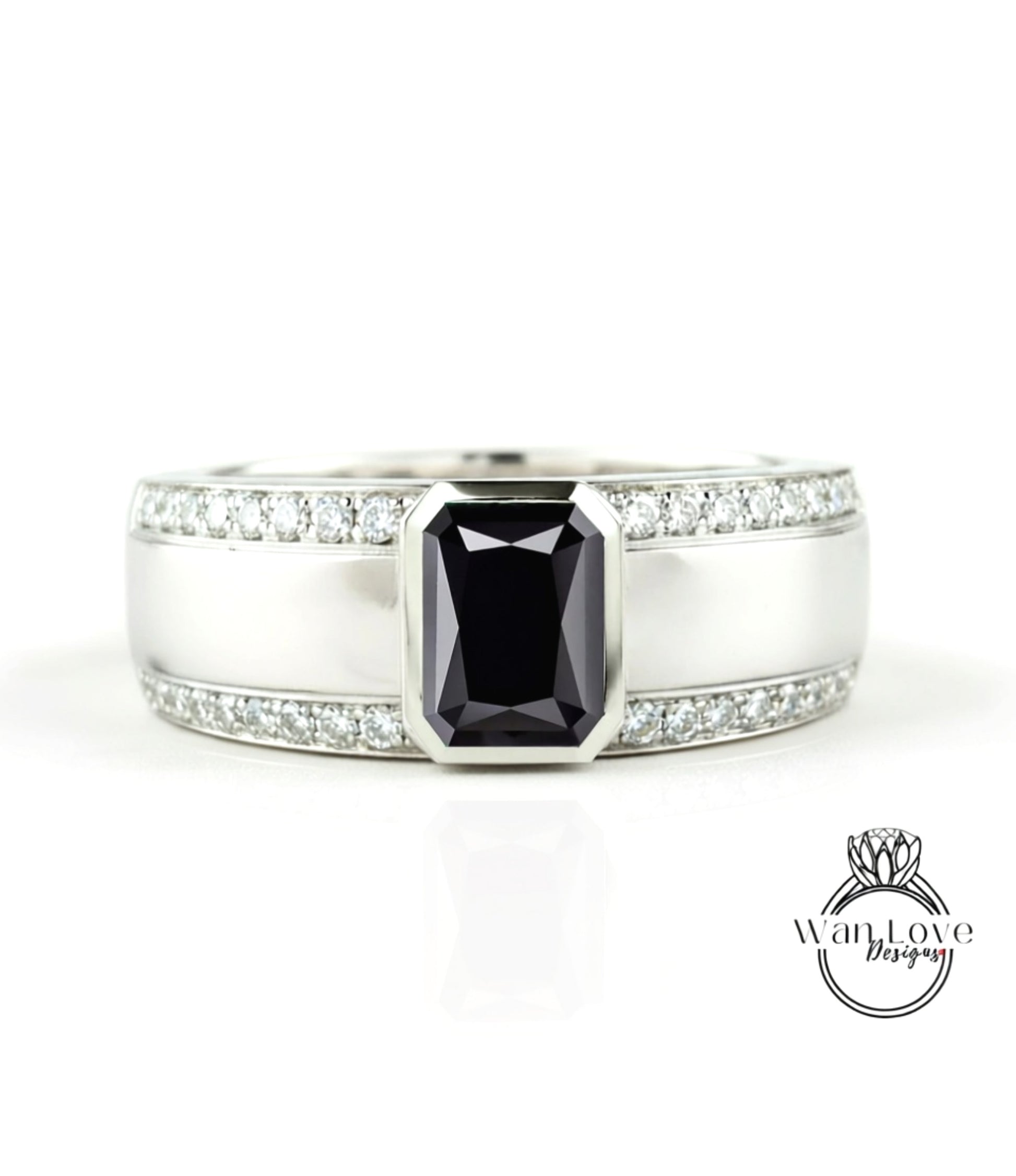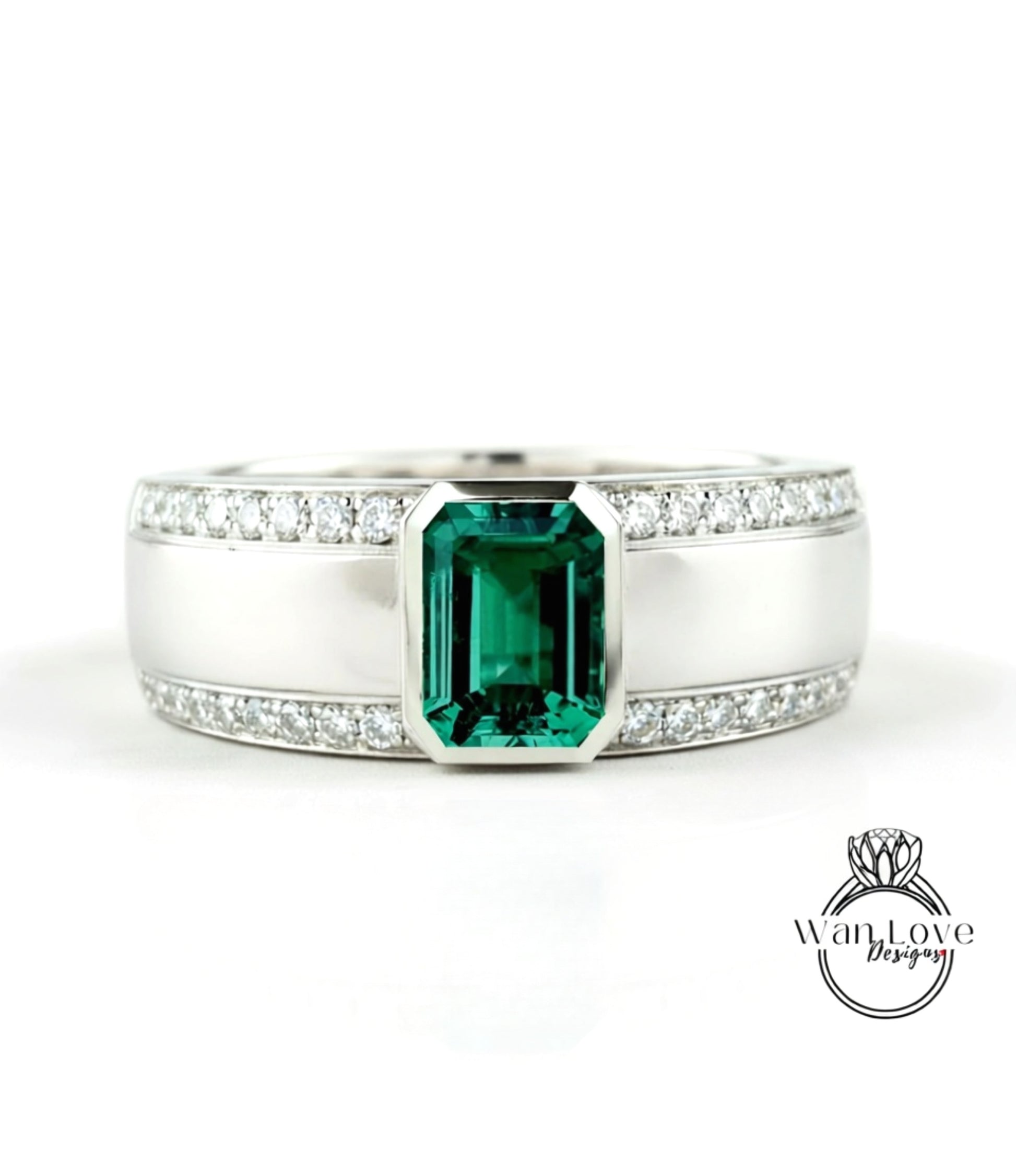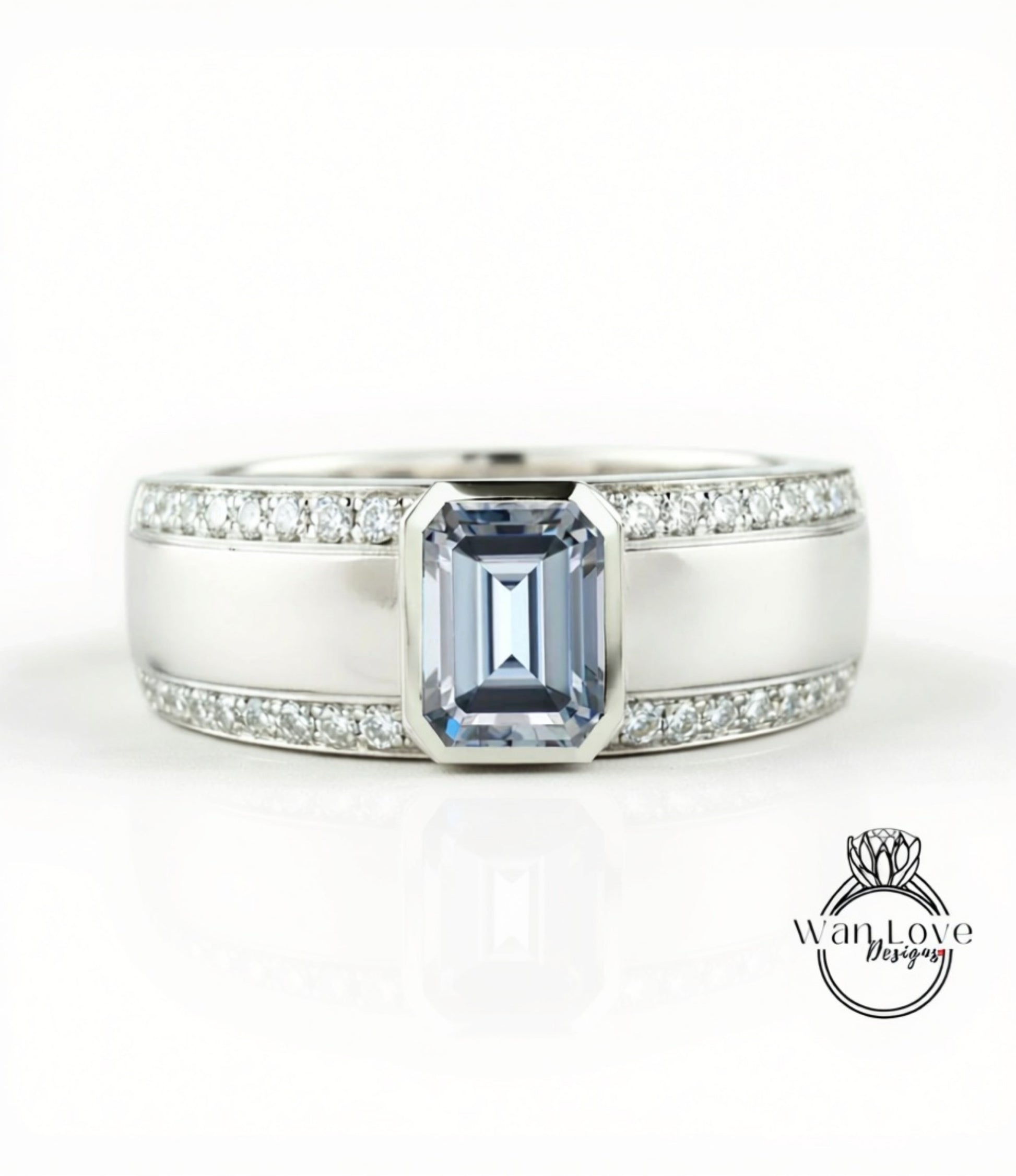 Emerald cut Sapphire and Diamond Men Ring in 14k White Gold | Blue Sapphire Ring | Mans Wedding Ring | Gifts For Him | Birthstone Mens Ring
