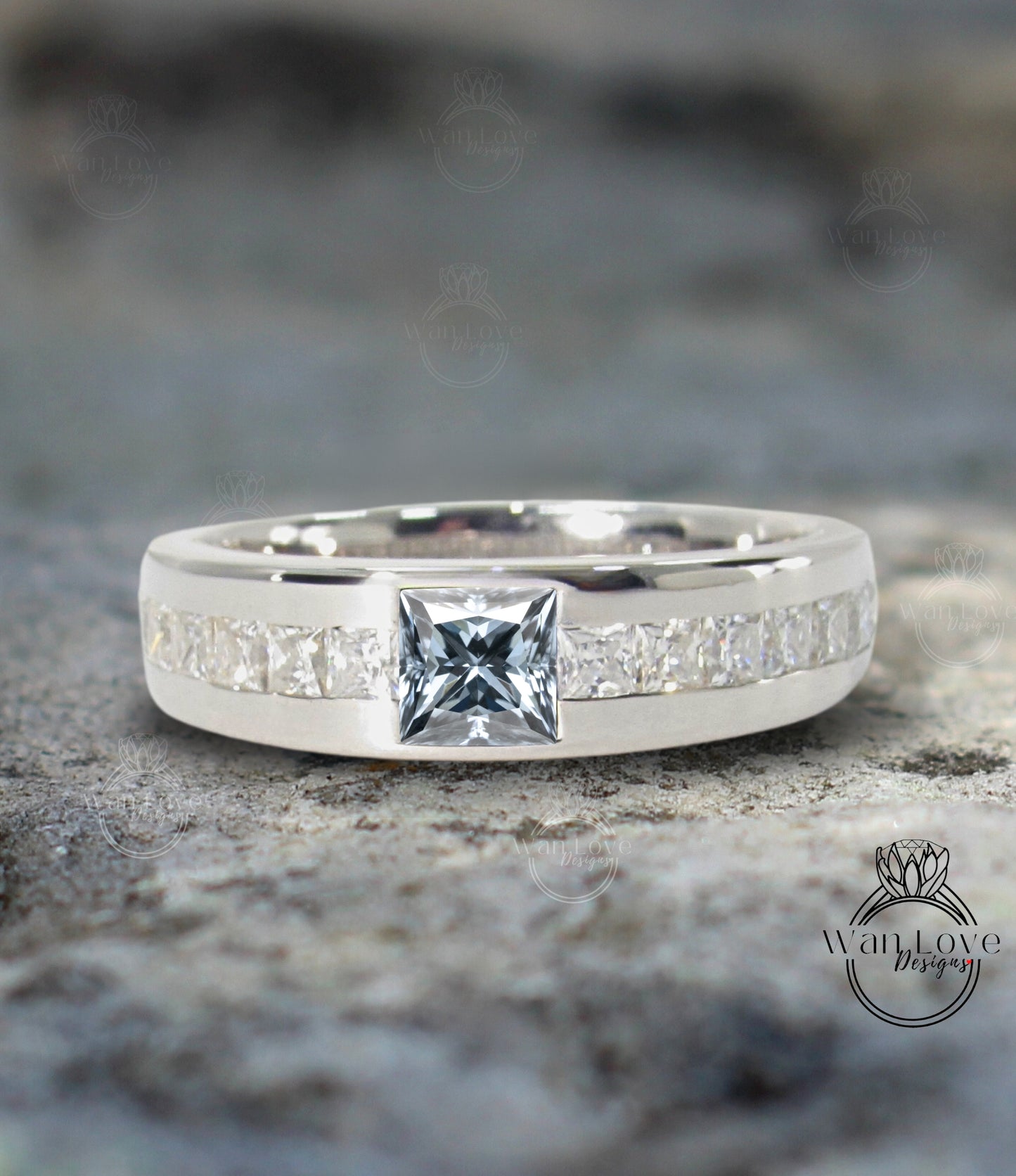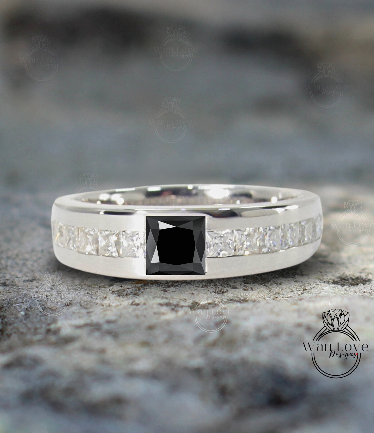 Mens Emerald Diamond Wedding Band | Princess Cut Green Emerald Band | Solid Gold Mens Ring | Mens Princess Cut Green Emerald Birthstone Ring