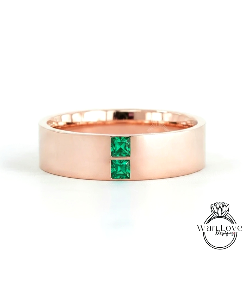 Mens Emerald Wedding Ring | Solid Rose Gold Mens Wedding Band | Princess Cut Diamond Band | Green Emerald Square Ring | His Birthstone Band