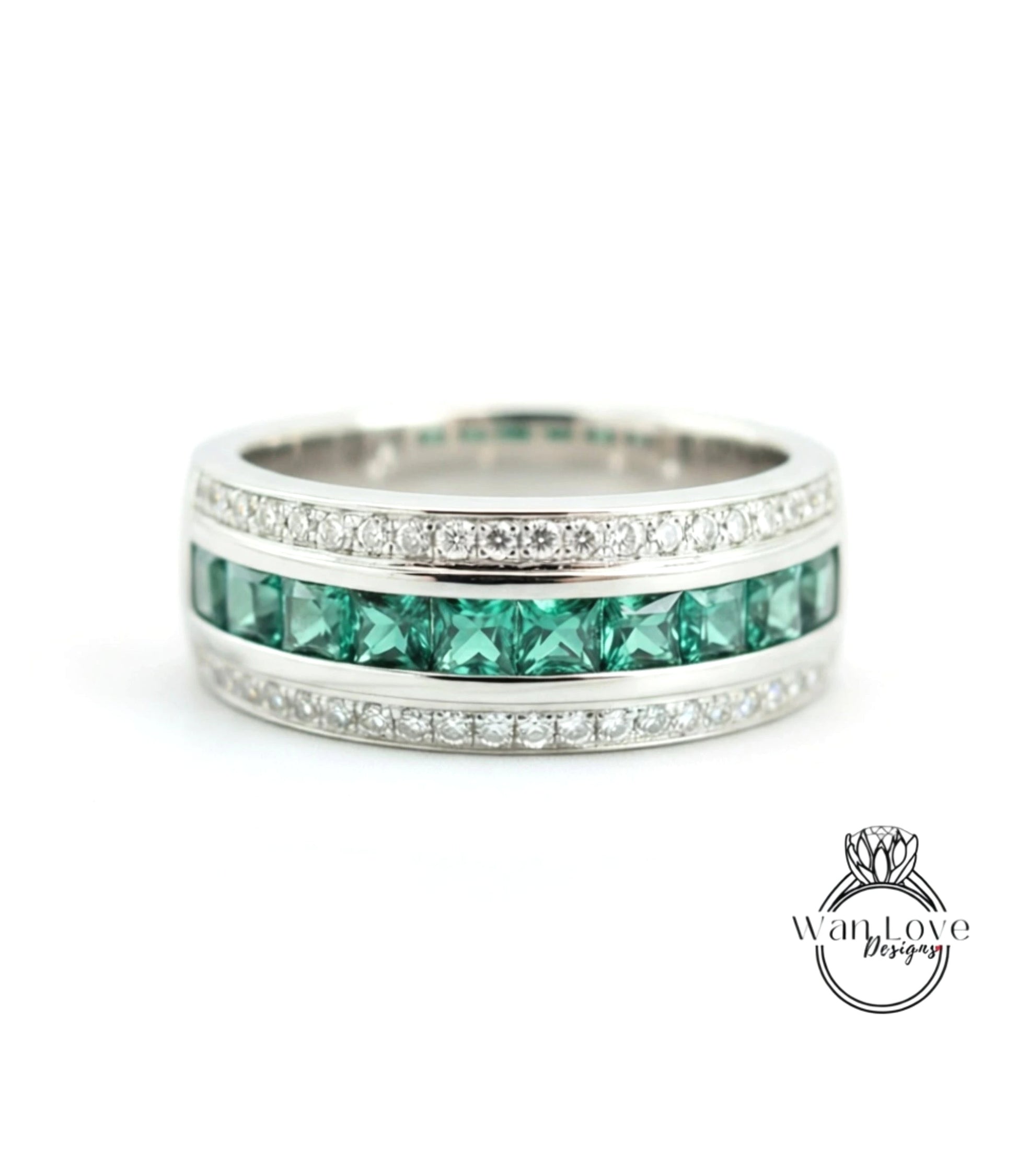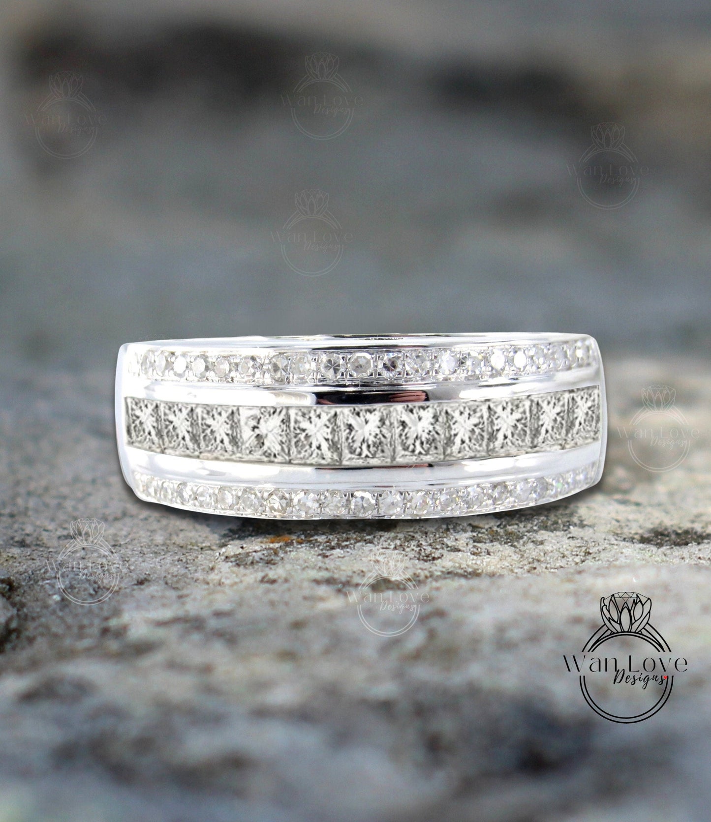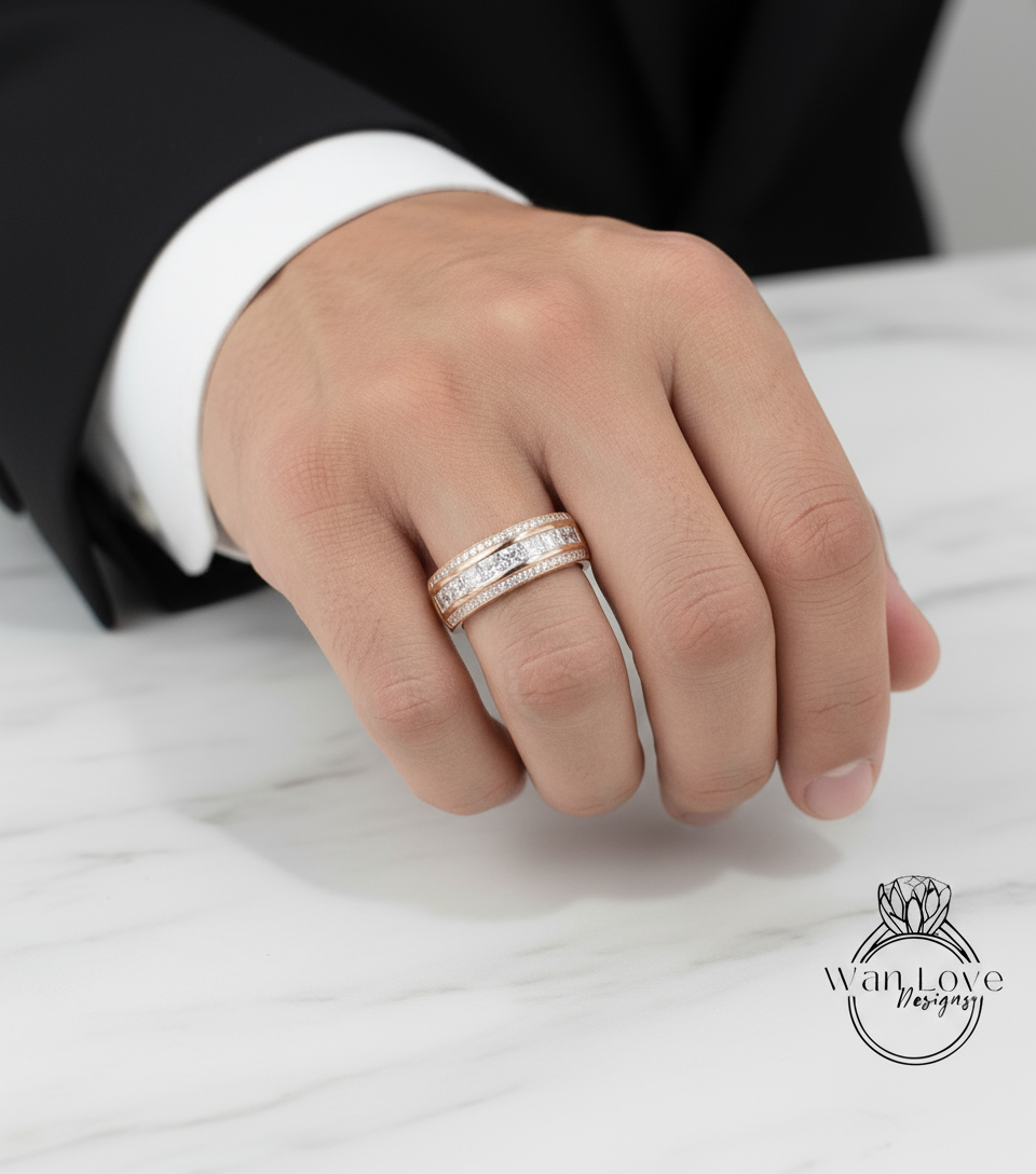 Mens Ruby Wedding Band, Princess Round Cut Red Ruby Mens Wedding Band, Solid Gold 10k/14k/18k Wedding Ring, His Birthstone Wedding Band