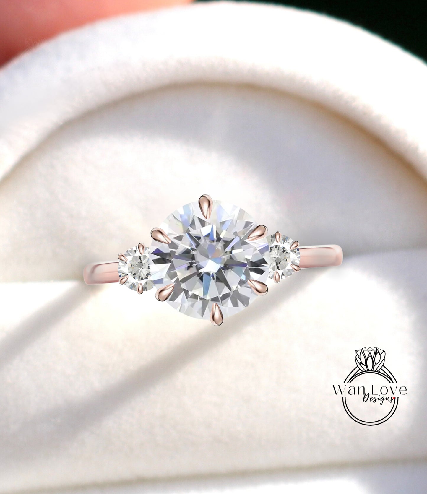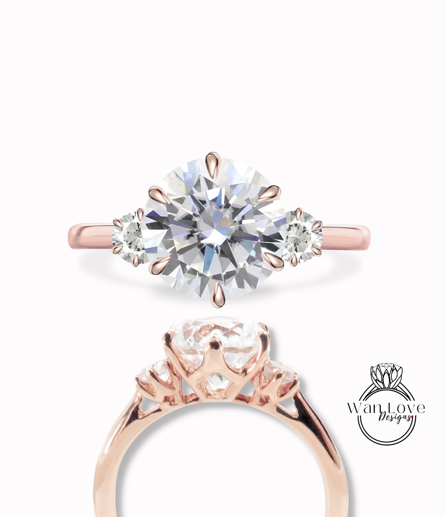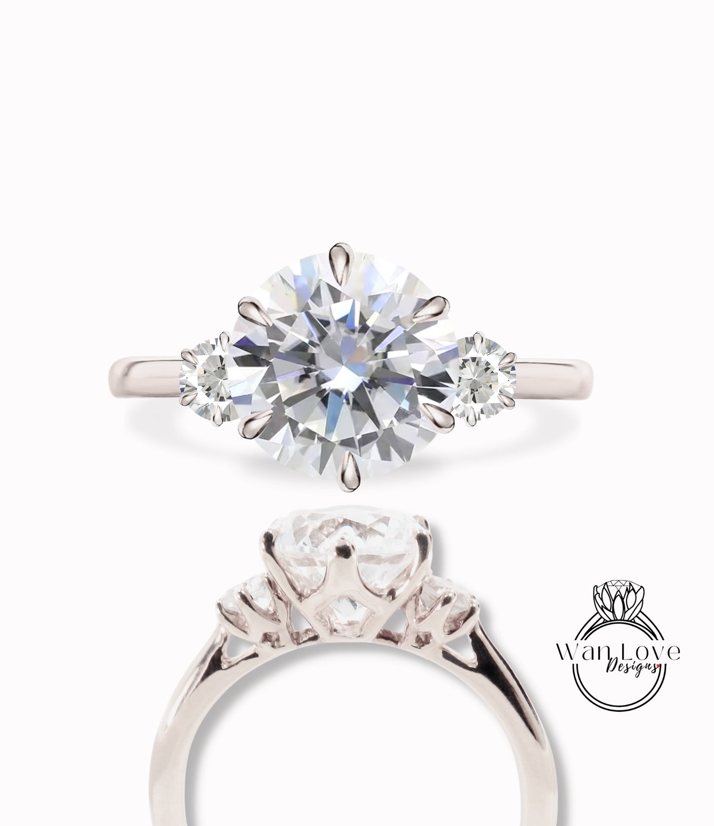 Moissanite & Diamond 3 gem Stone Engagement Ring 6 prong trellis Round three gemstone ring 14k 18k White Yellow Rose Gold Platinum-Custom-Wedding Anniversary Gift