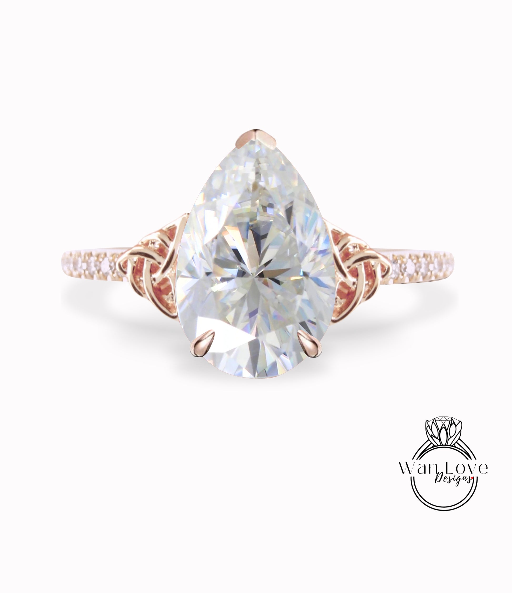 Moissanite & Diamond Celtic Knot Pear Engagement Ring, Custom, Wedding, Double,14k 18k White Yellow Rose Gold,Platinum, Anniversary Gift