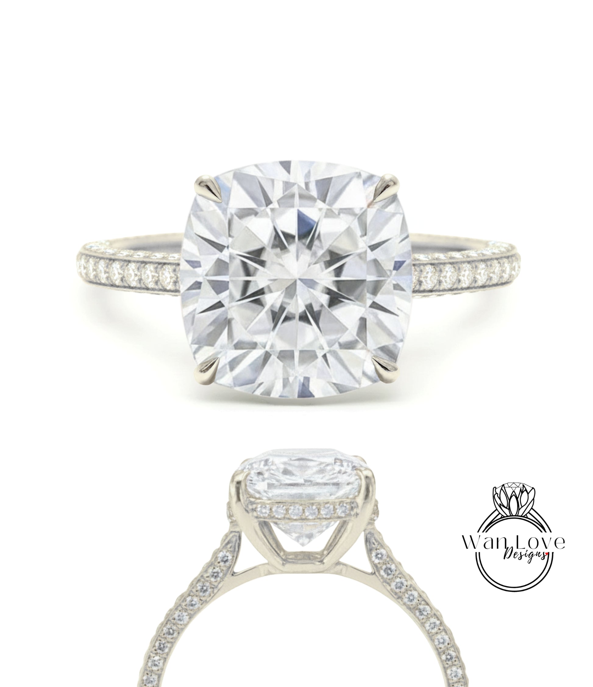 Moissanite & Diamond Cushion 3 sided Band Celebrity Style Engagement Ring Custom 14k 18k White Yellow Rose Gold Platinum Wedding Anniversary Bridal Gift