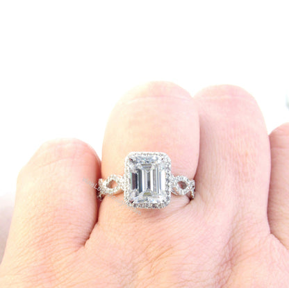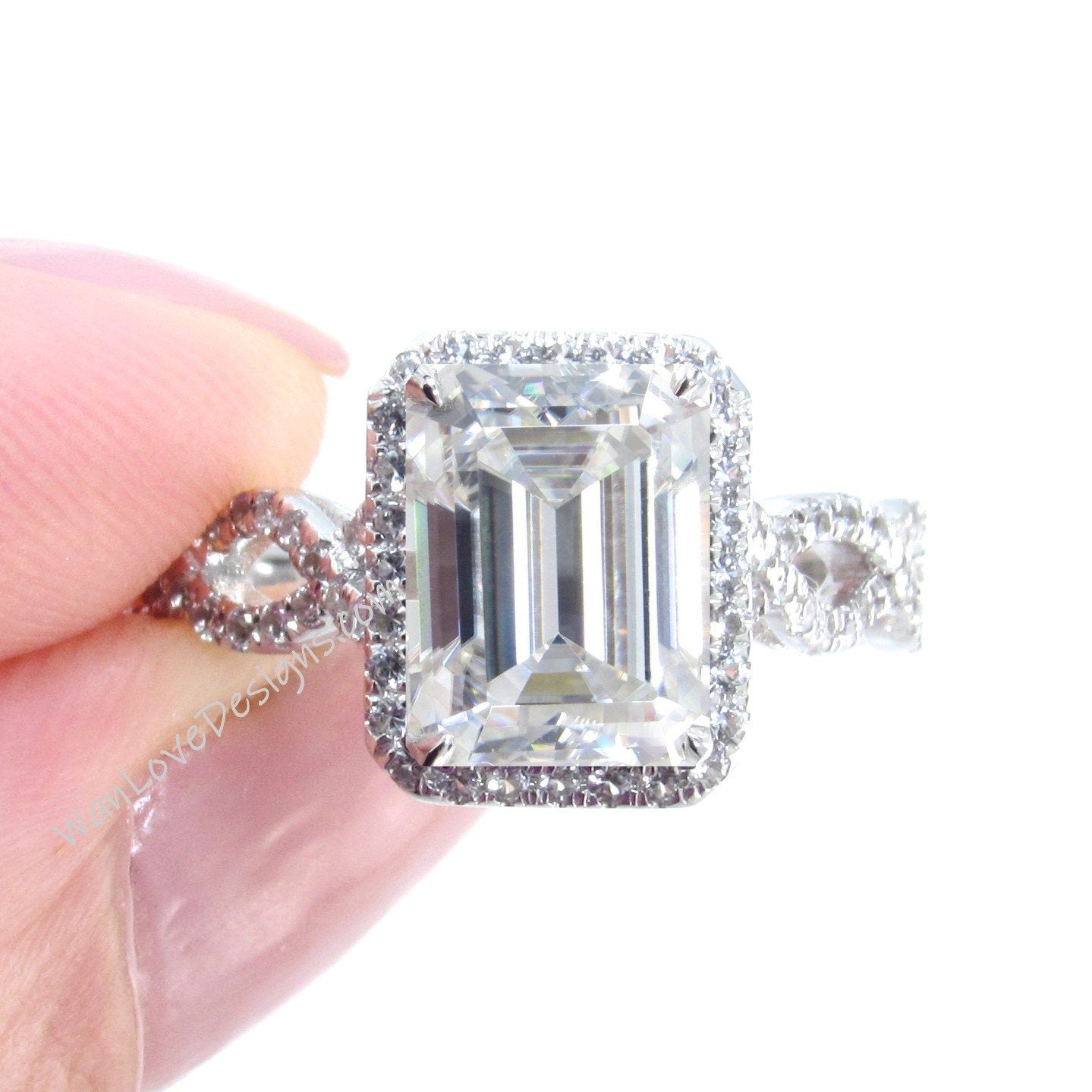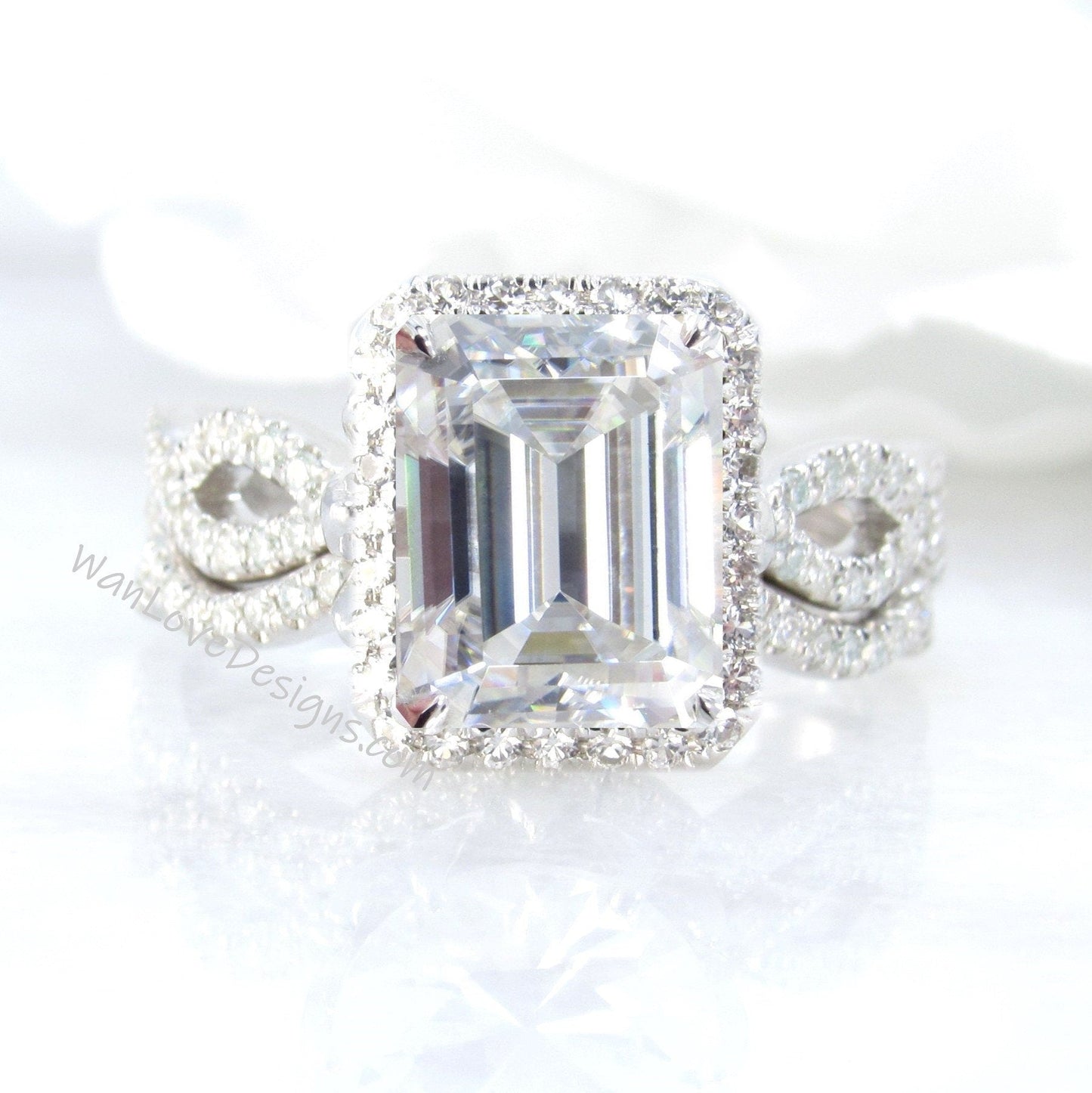 Moissanite Diamond Emerald Halo Engagement Ring, 3/4 Eternity Infinity Twist Shank Band Set, Custom, 14k 18k White Rose Yellow Gold