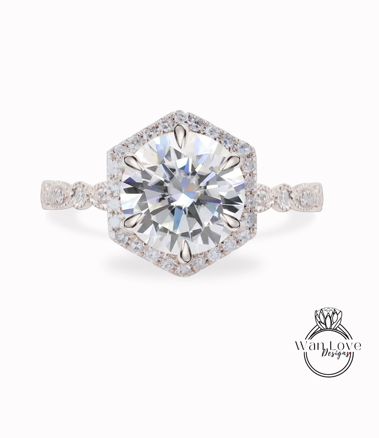 Moissanite & Diamond Hexagon Halo Scalloped Engagement Ring, Round cut Ring, Milgrain Vintage leaf wedding Bridal Ring, Anniversary Gift