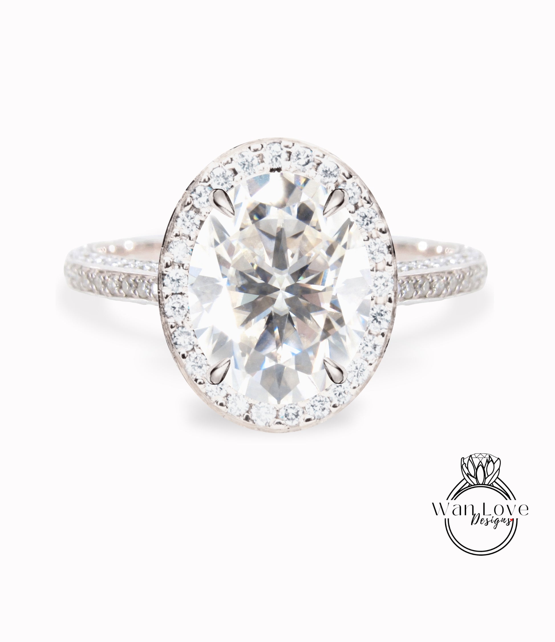 Moissanite & Diamond Oval Halo 3 sided Engagement Ring, 14k 18k White Yellow Rose Gold, Platinum, Wedding, Anniversary Gift
