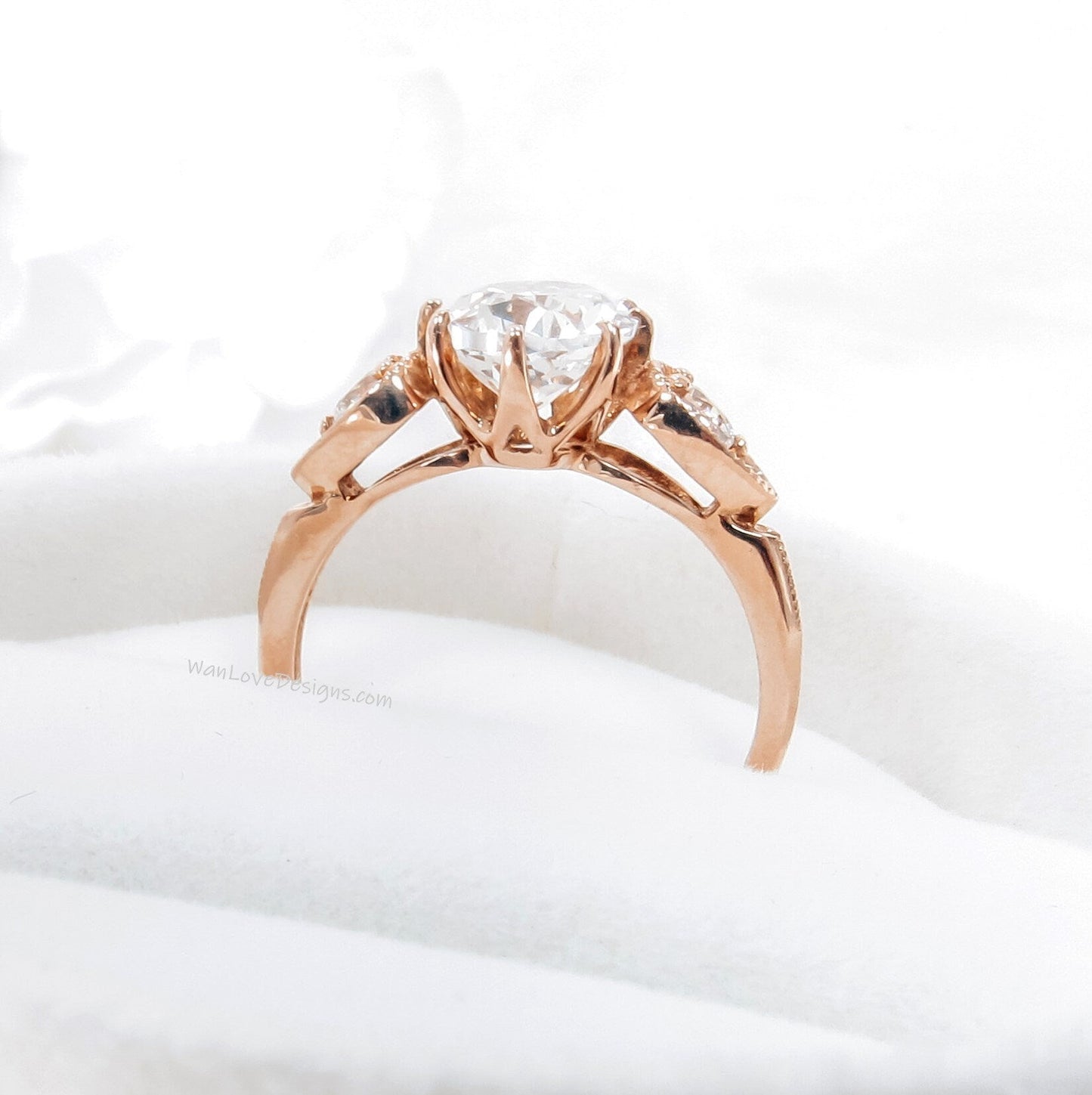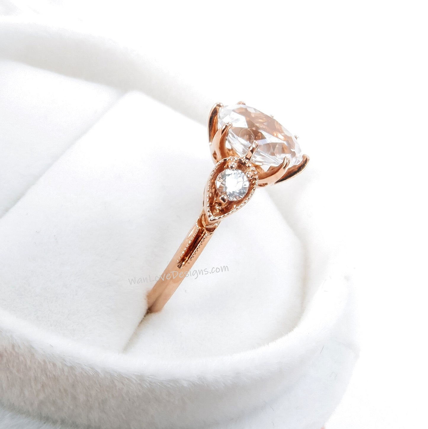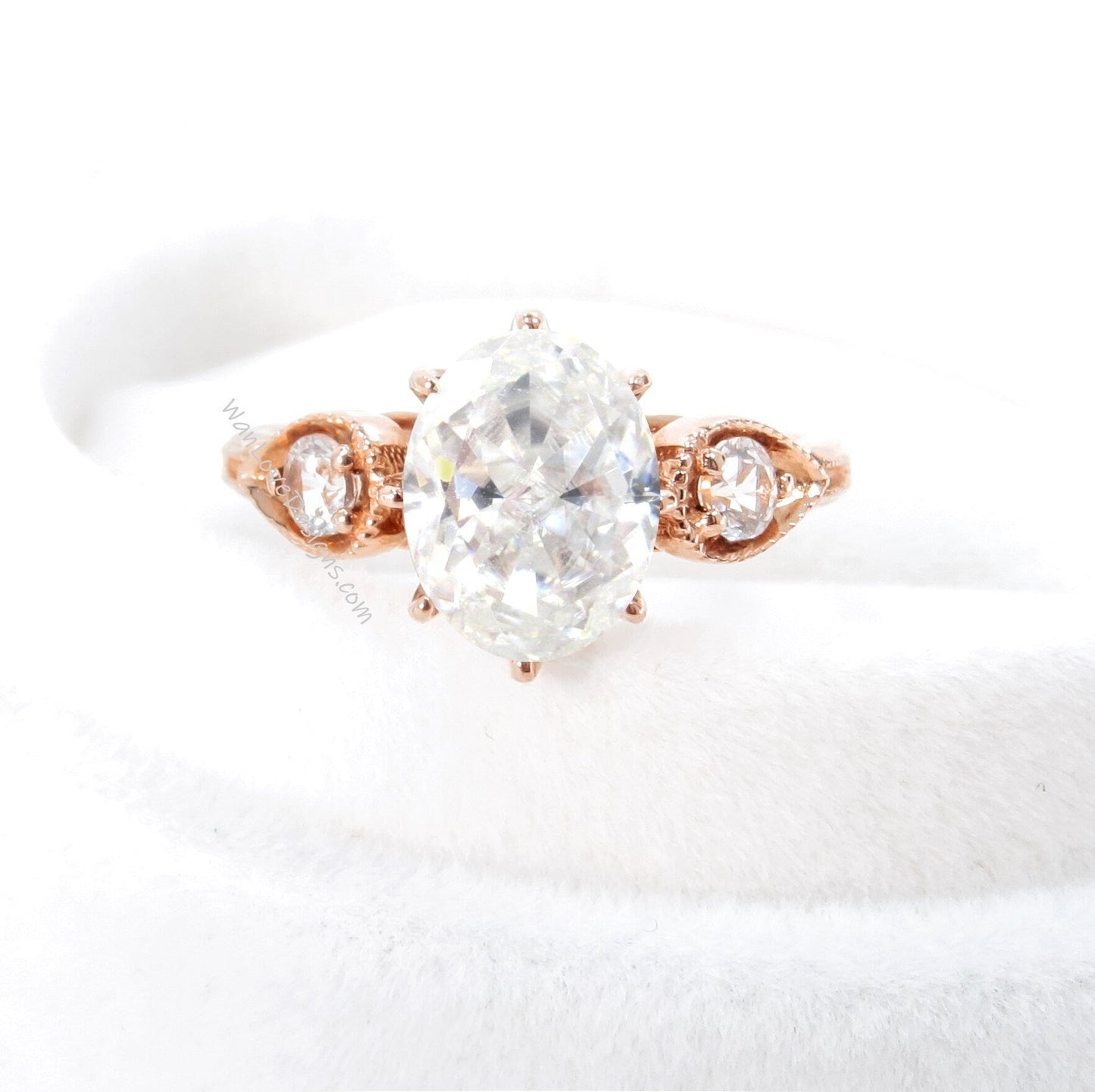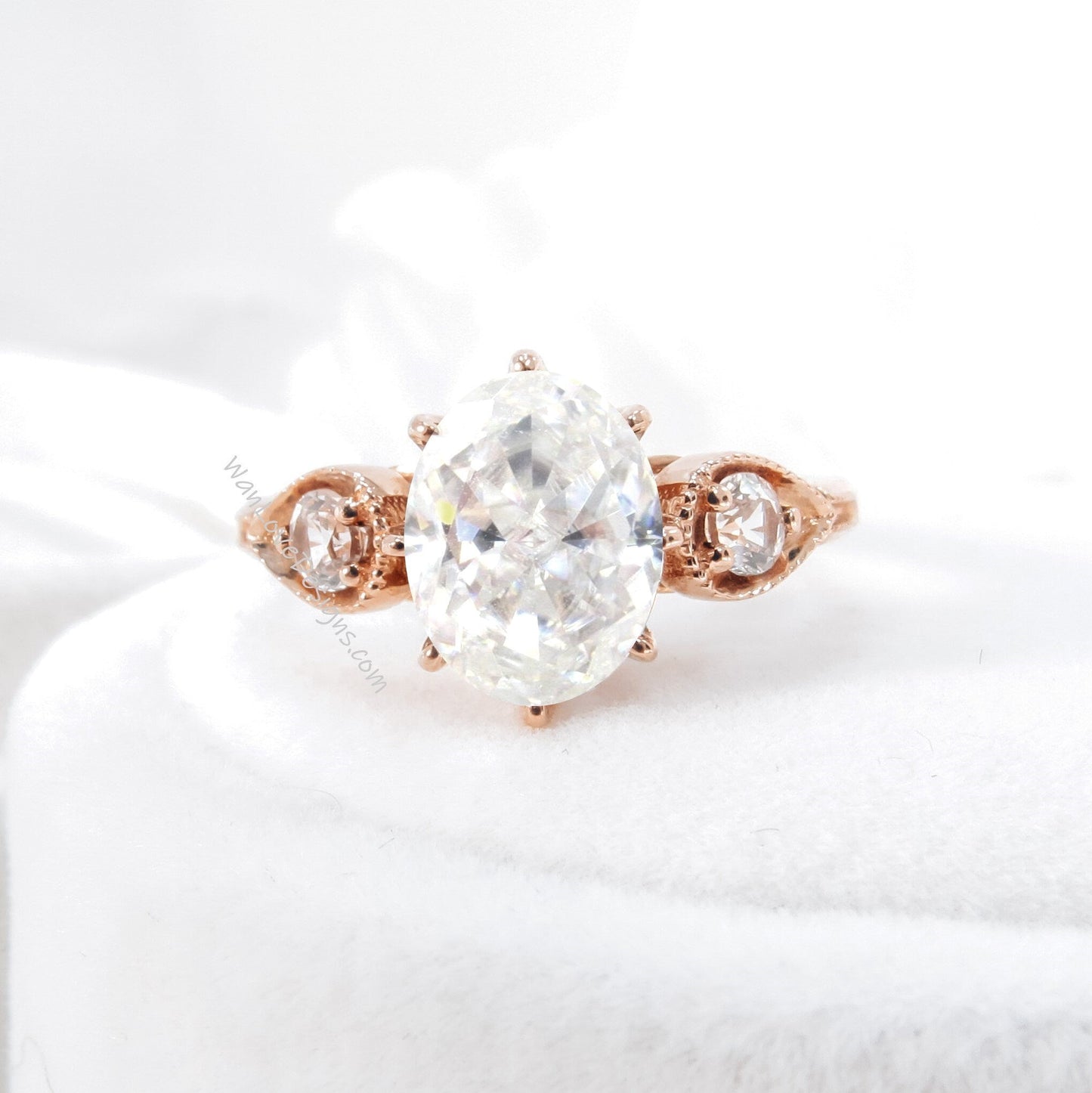 Moissanite Diamonds 3 GemStone Milgrain Oval 8 prong Engagement Ring Round Custom Wedding Anniversary Gift
