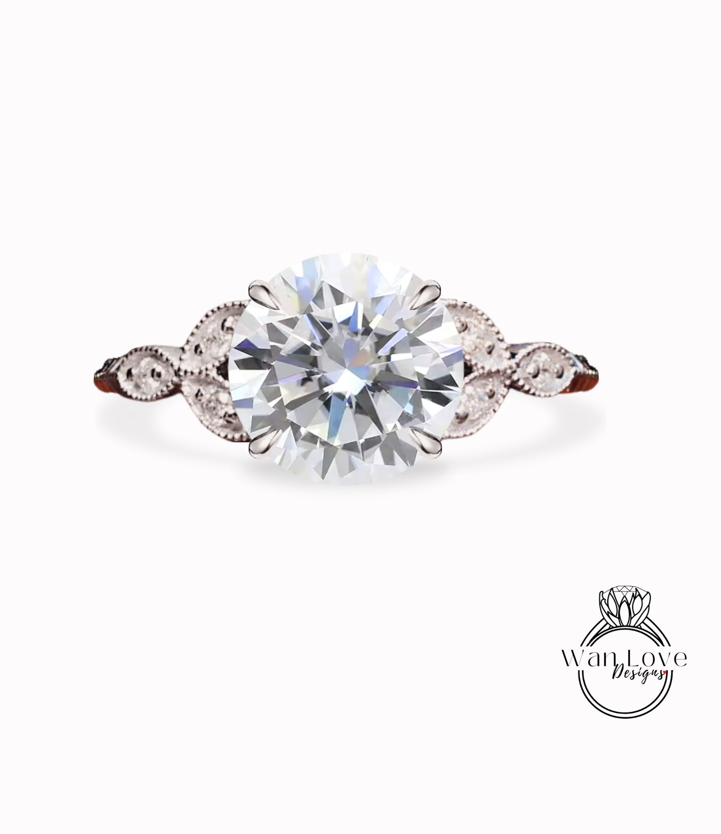 Round cut leaf Moissanite Diamond Engagement Ring Nature Antique leaf Milgrain Wedding ring Vintage style Ring wedding bridal antique ring