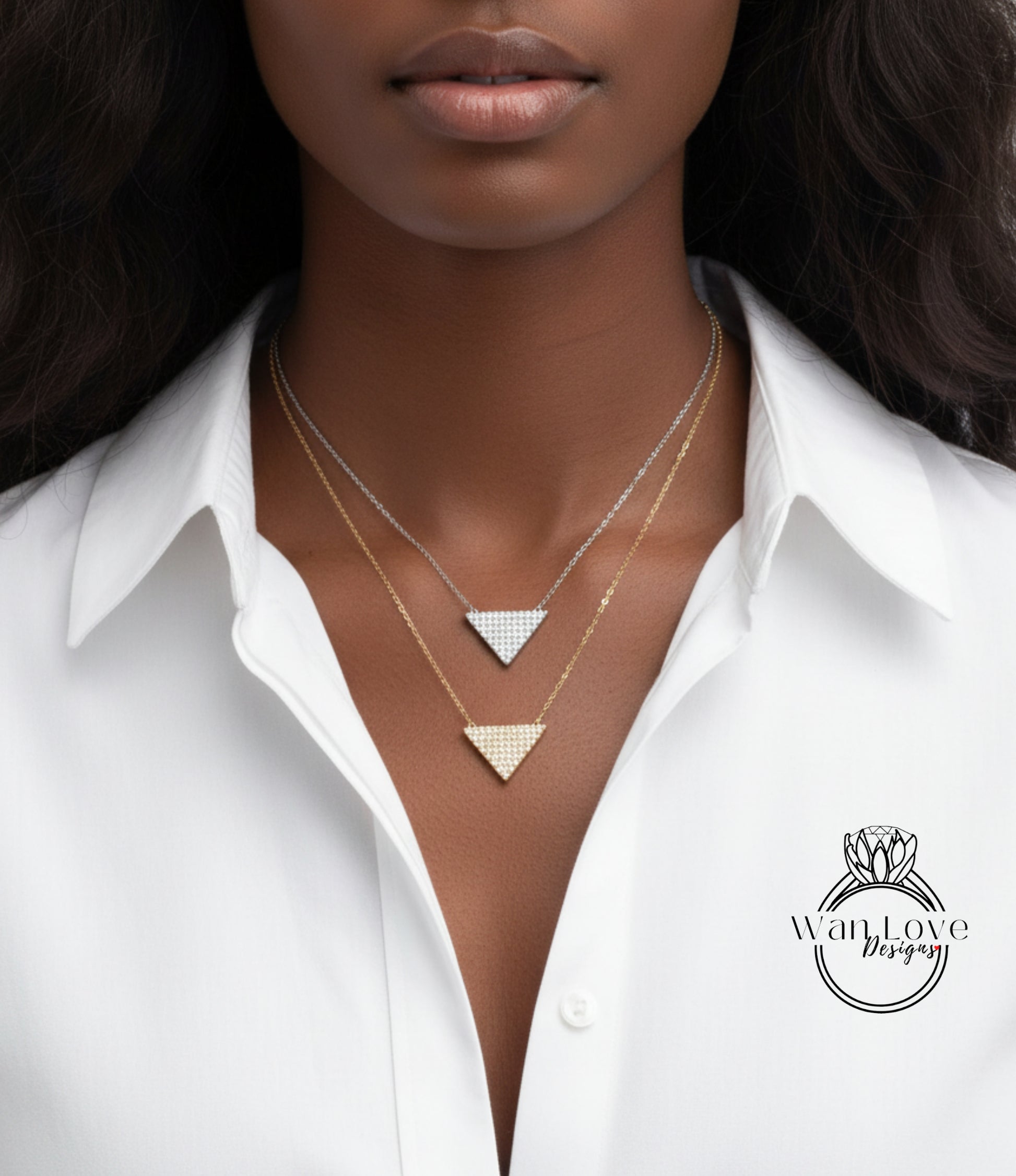 Moissanite Pave Triangle Layering Necklace Charm Art Deco round cut pave moissanite Charm necklace White or Rose Gold dainty chain, Ready