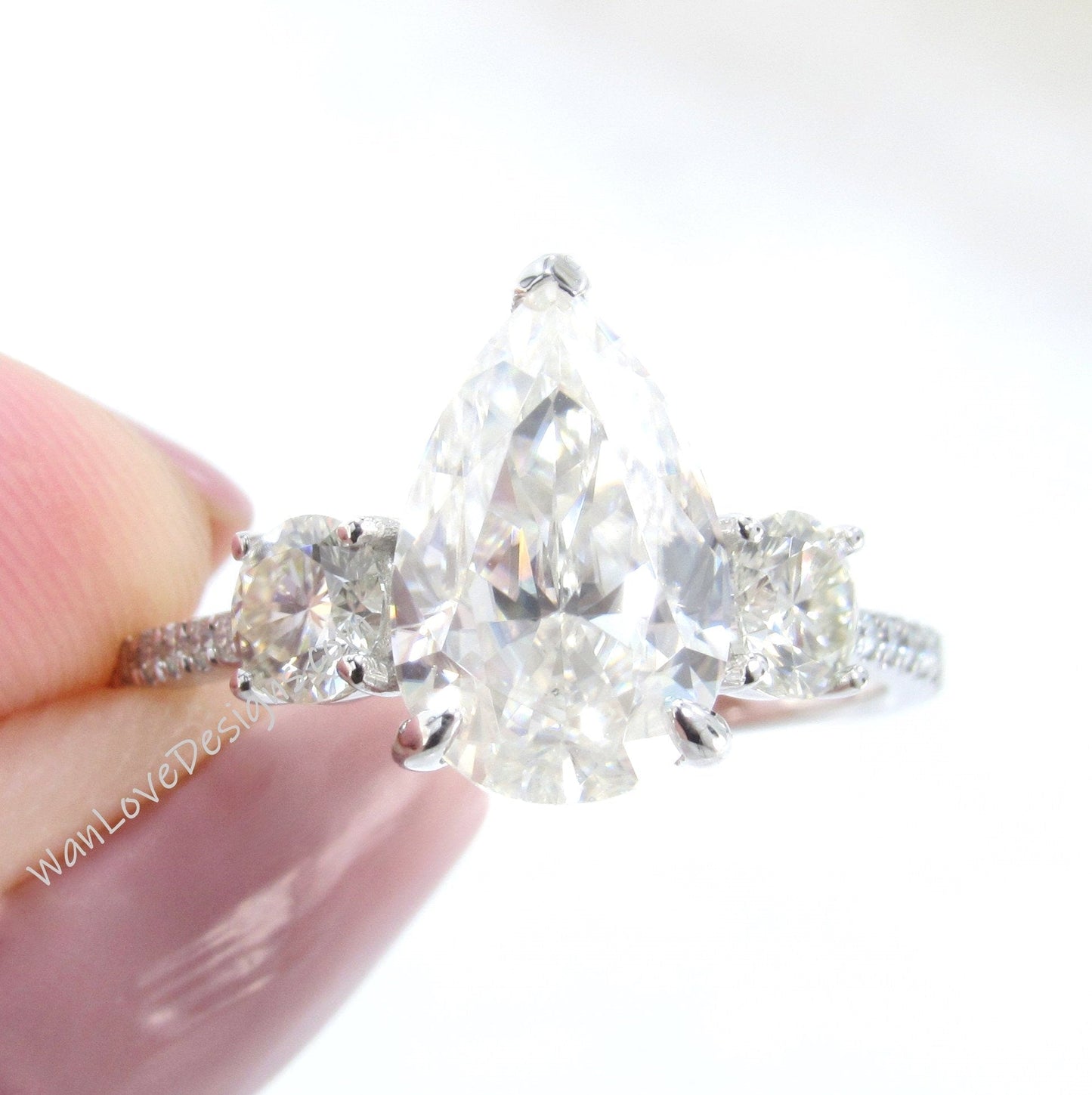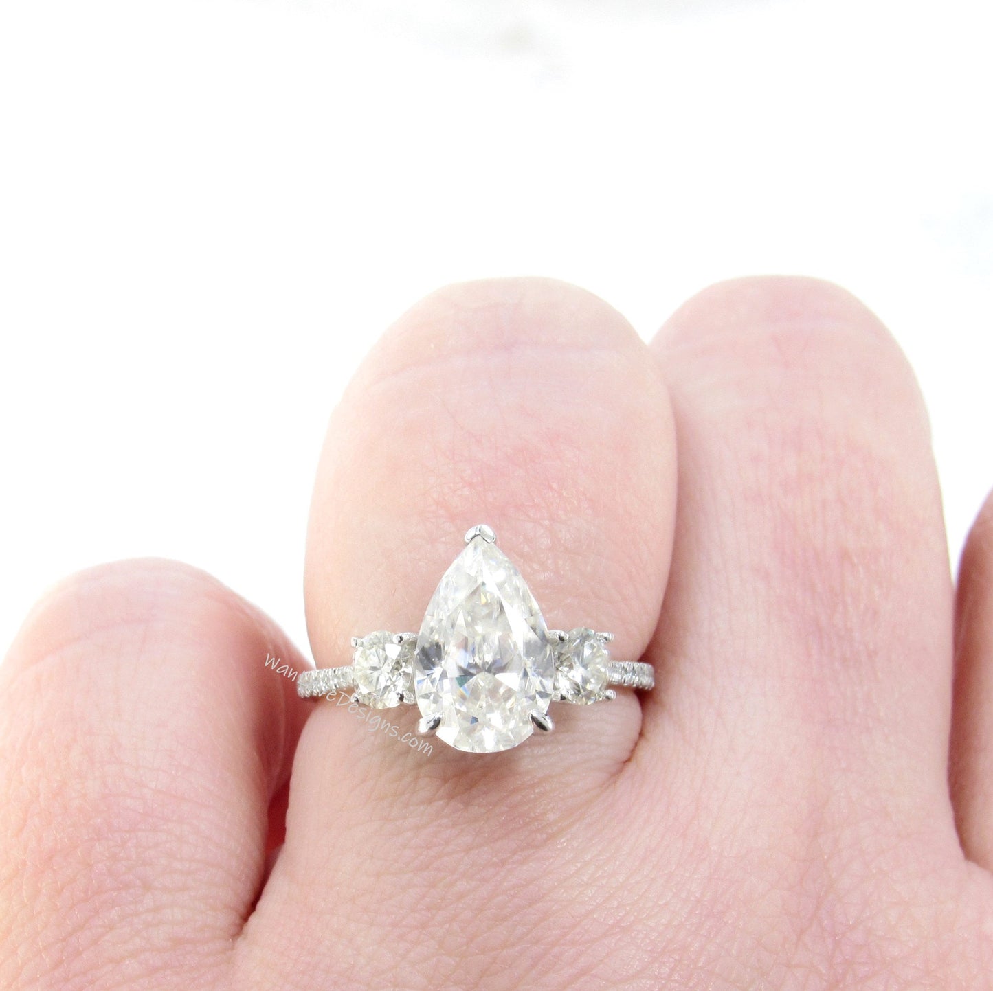 Moissanite Pear Round 3 gemstone Engagement Ring, Custom, 14k 18k White Yellow Rose Gold, Platinum, Wedding,Anniversary Gift