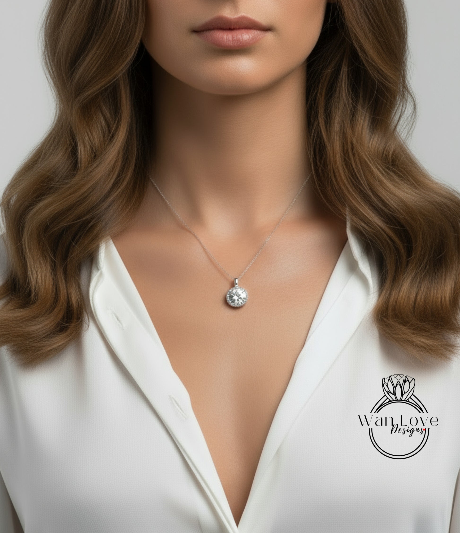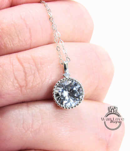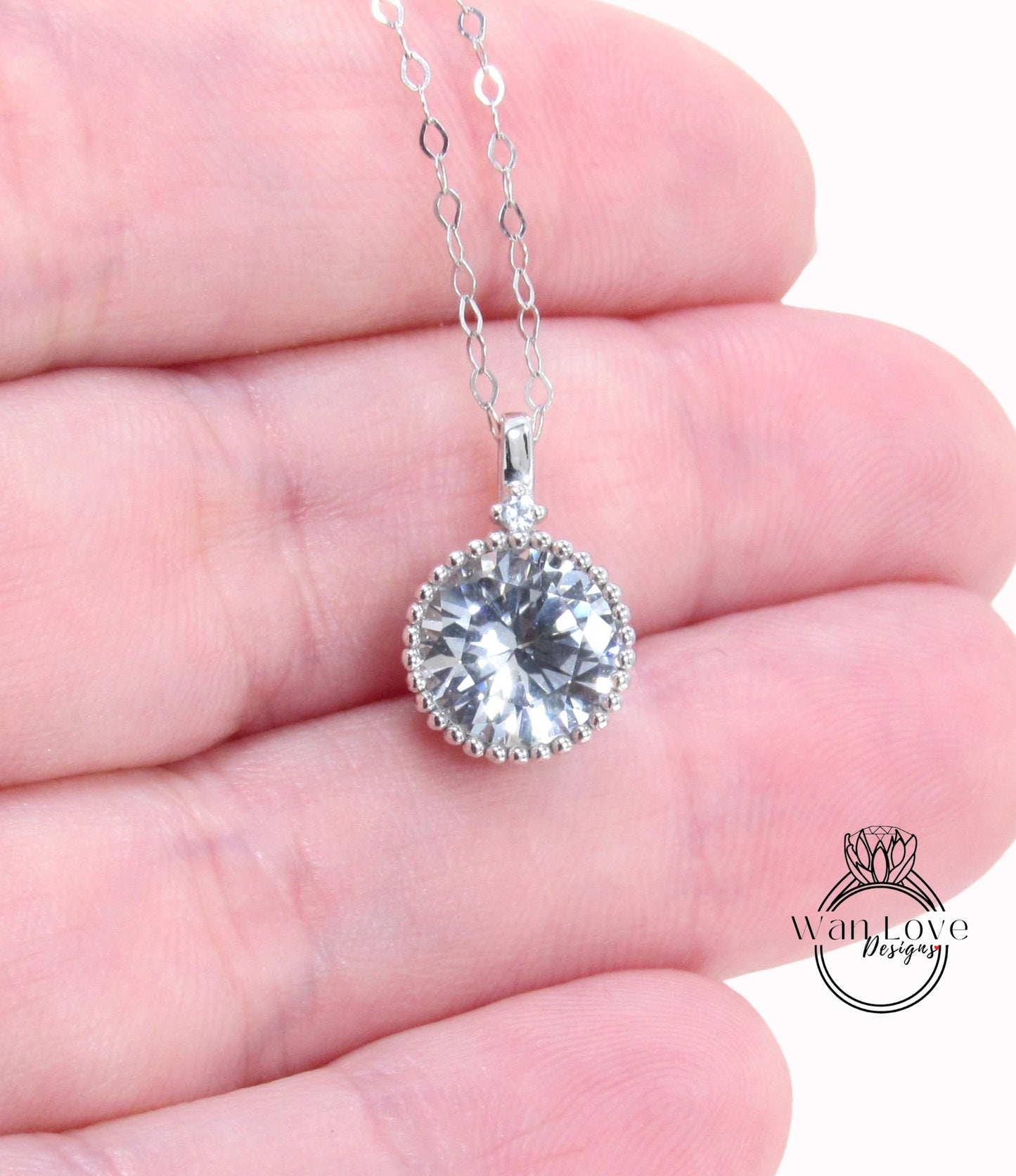 Moissanite White Blue Pink Sapphire Emerald Diamond Round Milgrain Bezel Charm Necklace Thin Chain Custom Wedding Anniversary Gift