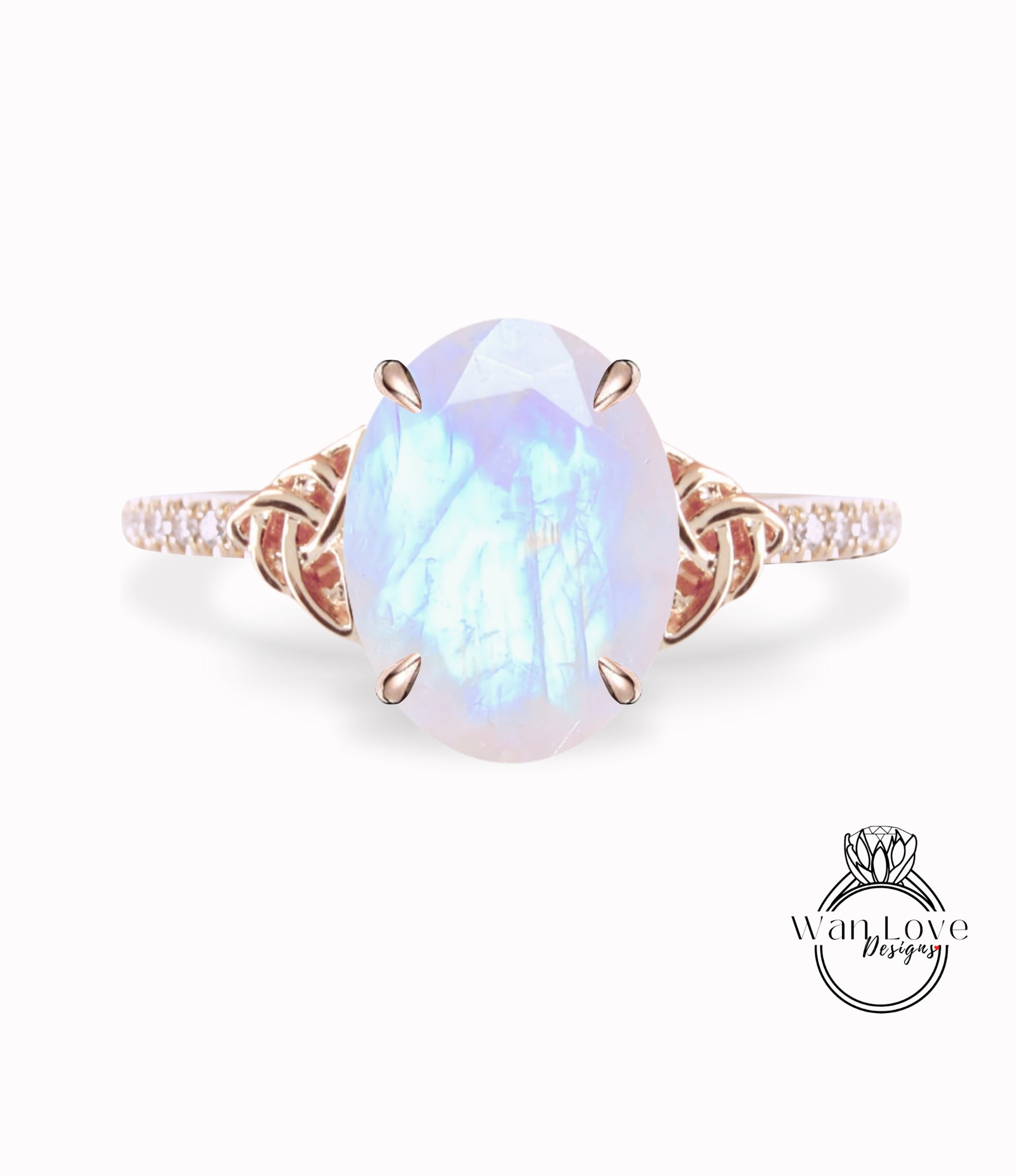 Moonstone & Diamond Celtic Knot Oval Engagement Ring, Custom, Wedding, Double,14k 18k White Yellow Rose Gold,Platinum, Anniversary Gift
