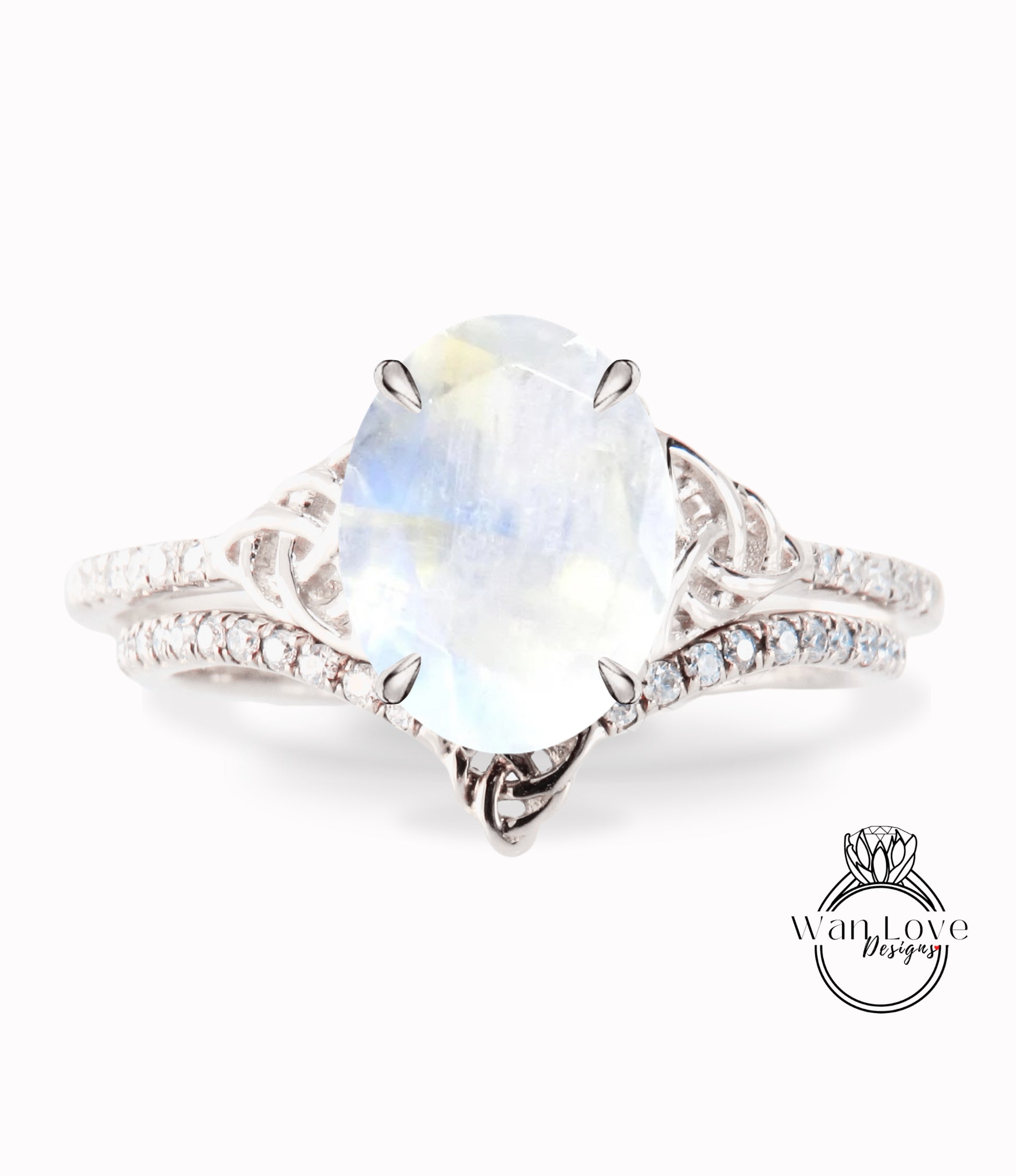 Moonstone & Diamond Celtic Love Knot Oval cut Triquetra Engagement Ring Bridal Curved Nesting Wedding Band Set, Anniversary Gift