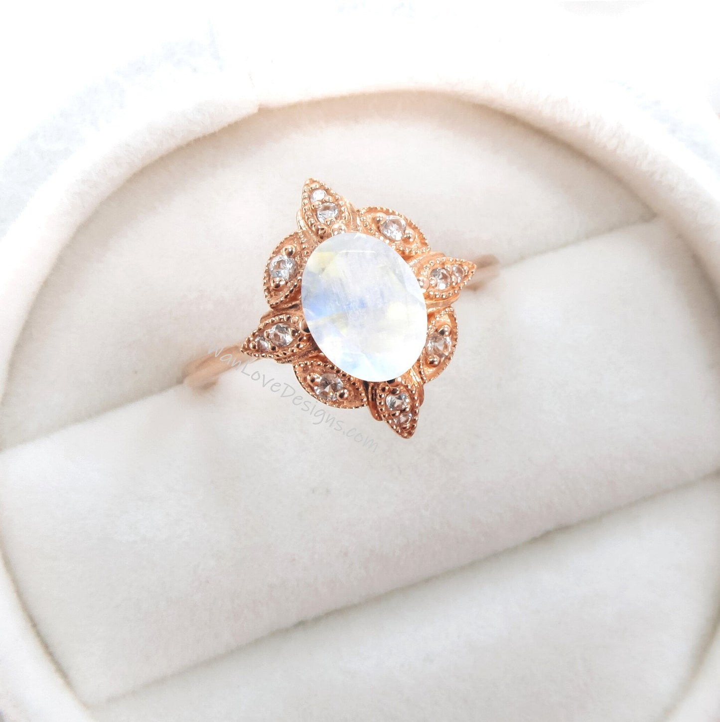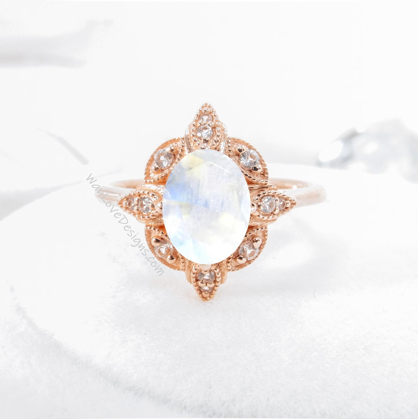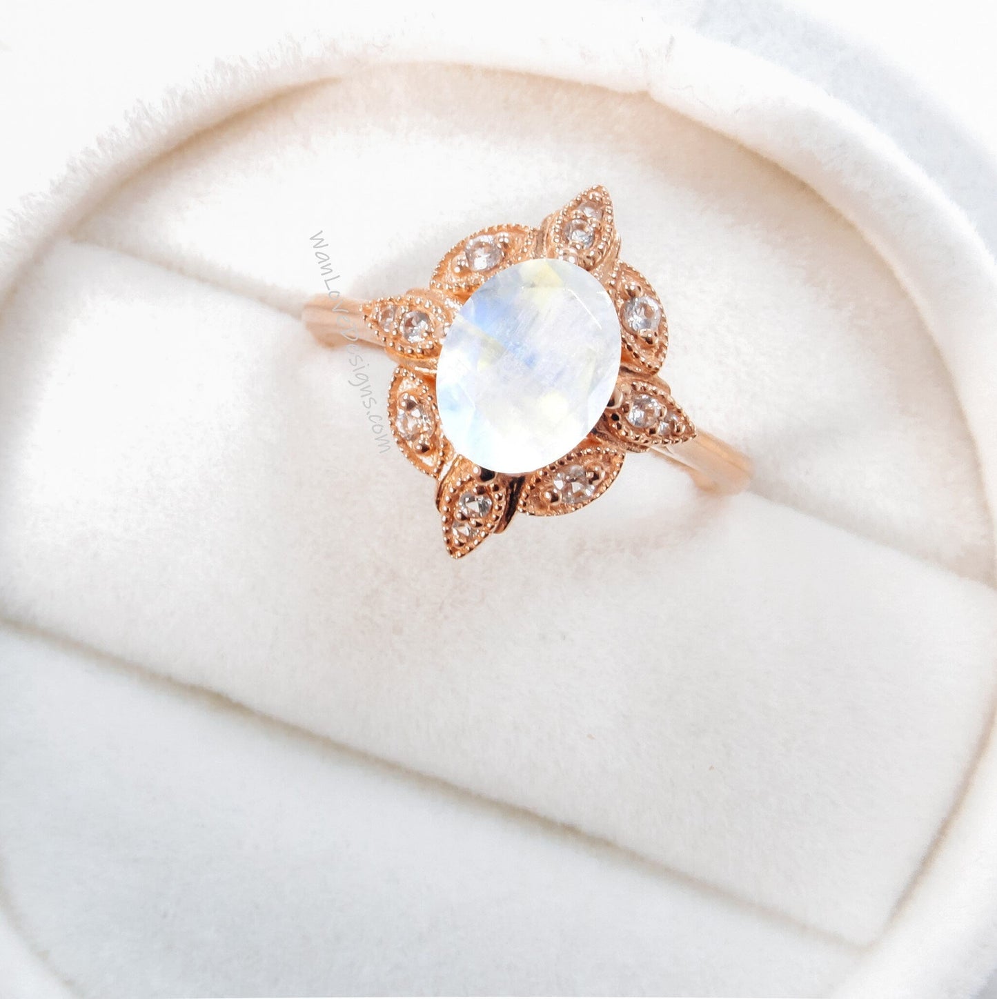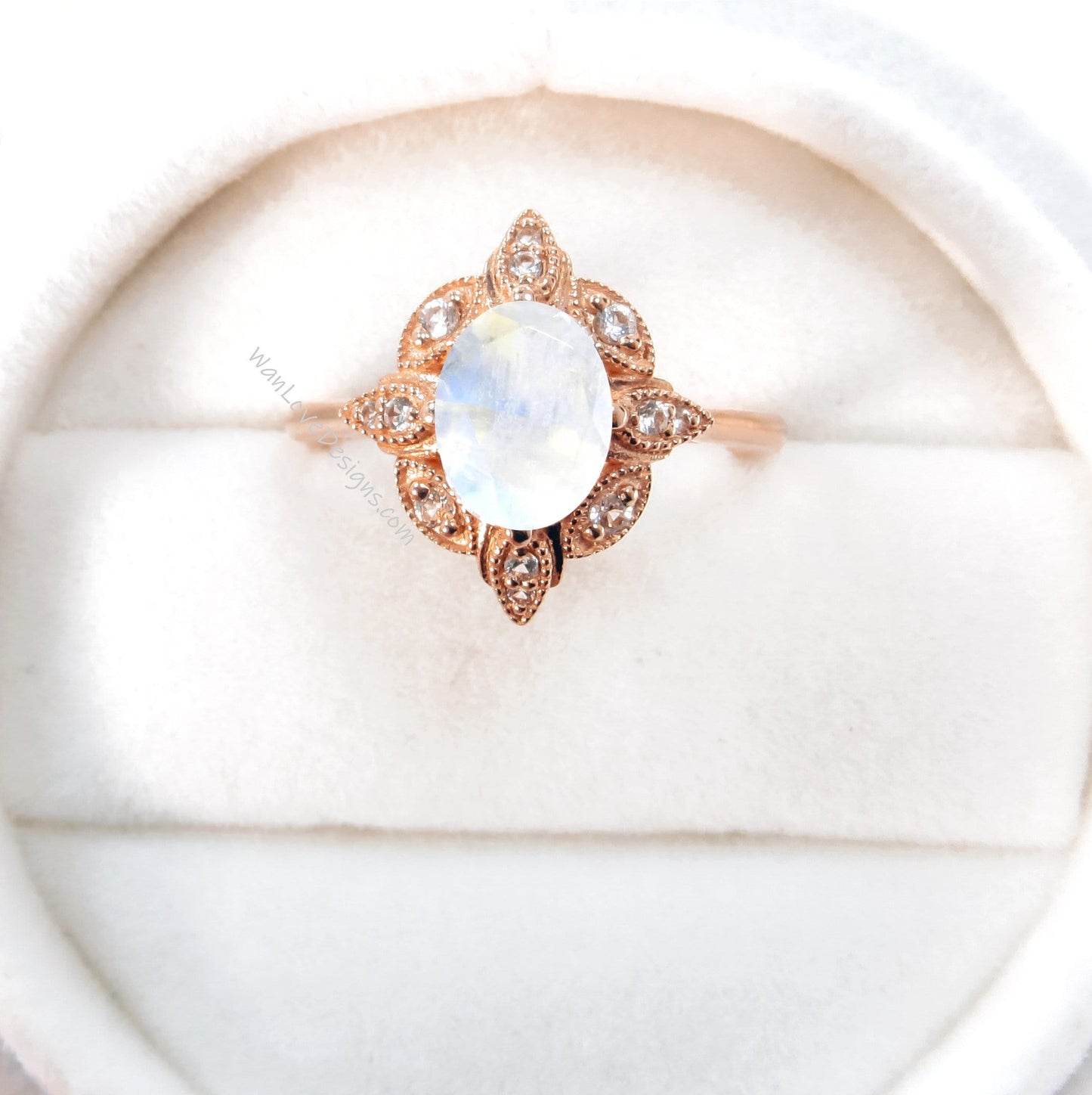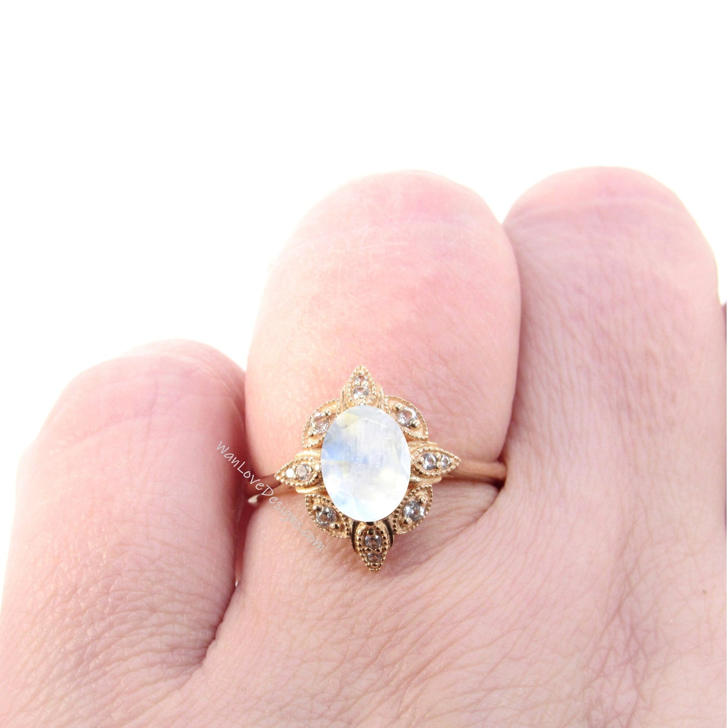 Moonstone Diamond Oval Milgrain Halo Engagement Ring, plain shank, 14k White Yellow Rose Gold,Platinum,Custom,Wedding, WanLoveDesigns