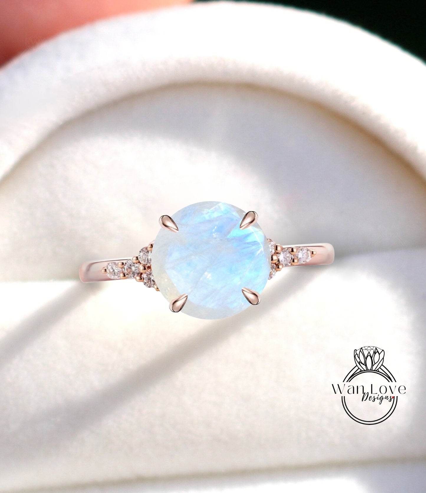 Art Deco Round Moonstone Engagement Ring/ Three Stone Diamonds Ring/ Diamond Cluster Ring/ Birthday Gift/ Bridal Ring/ Wedding Jewelry Gift