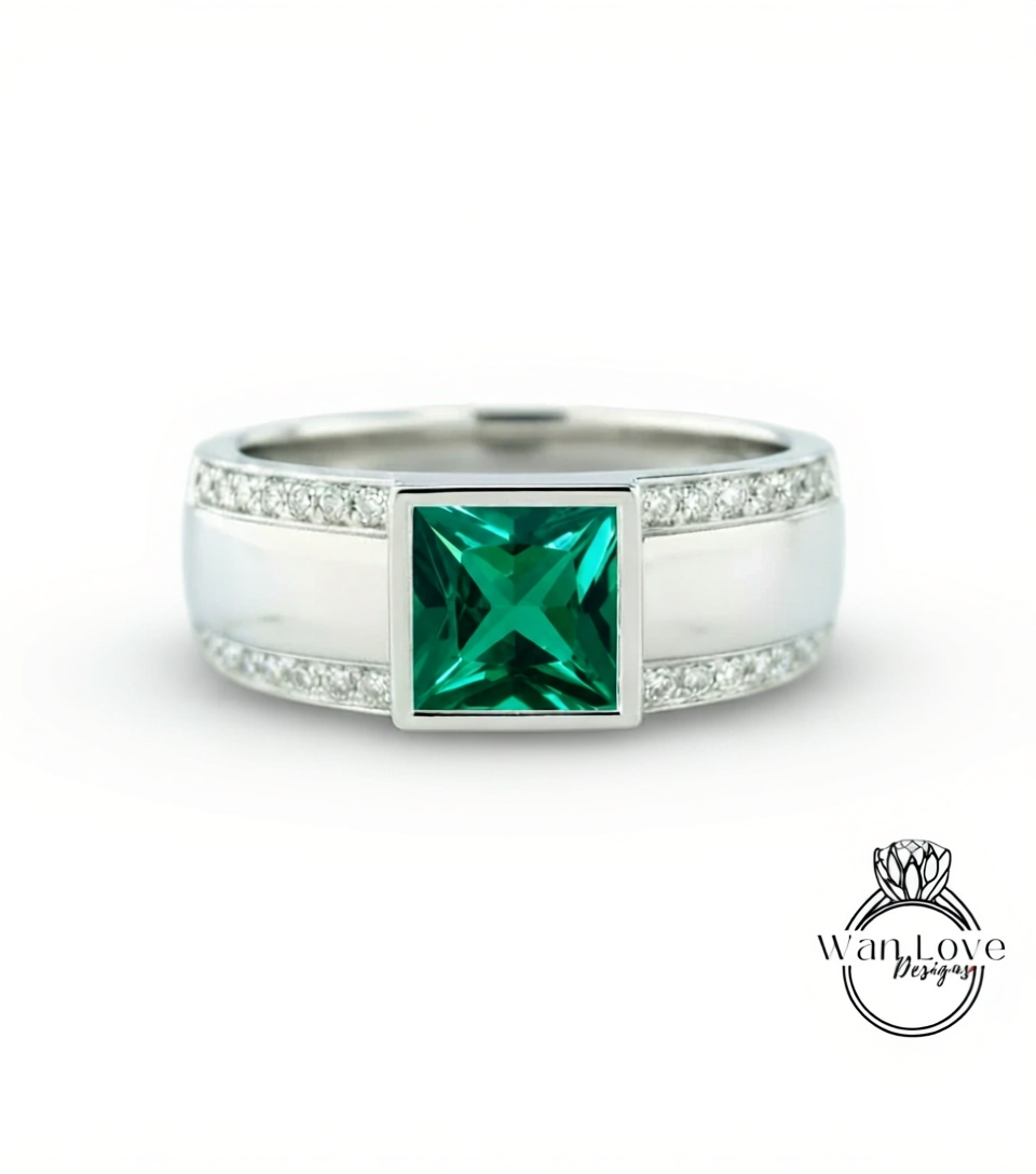 Moissanite Diamond Mens Ring, 14k white gold diamond men's ring, 2 row mans diamond ring, Modern gemstone ring, 14K White Gold, Wedding Band
