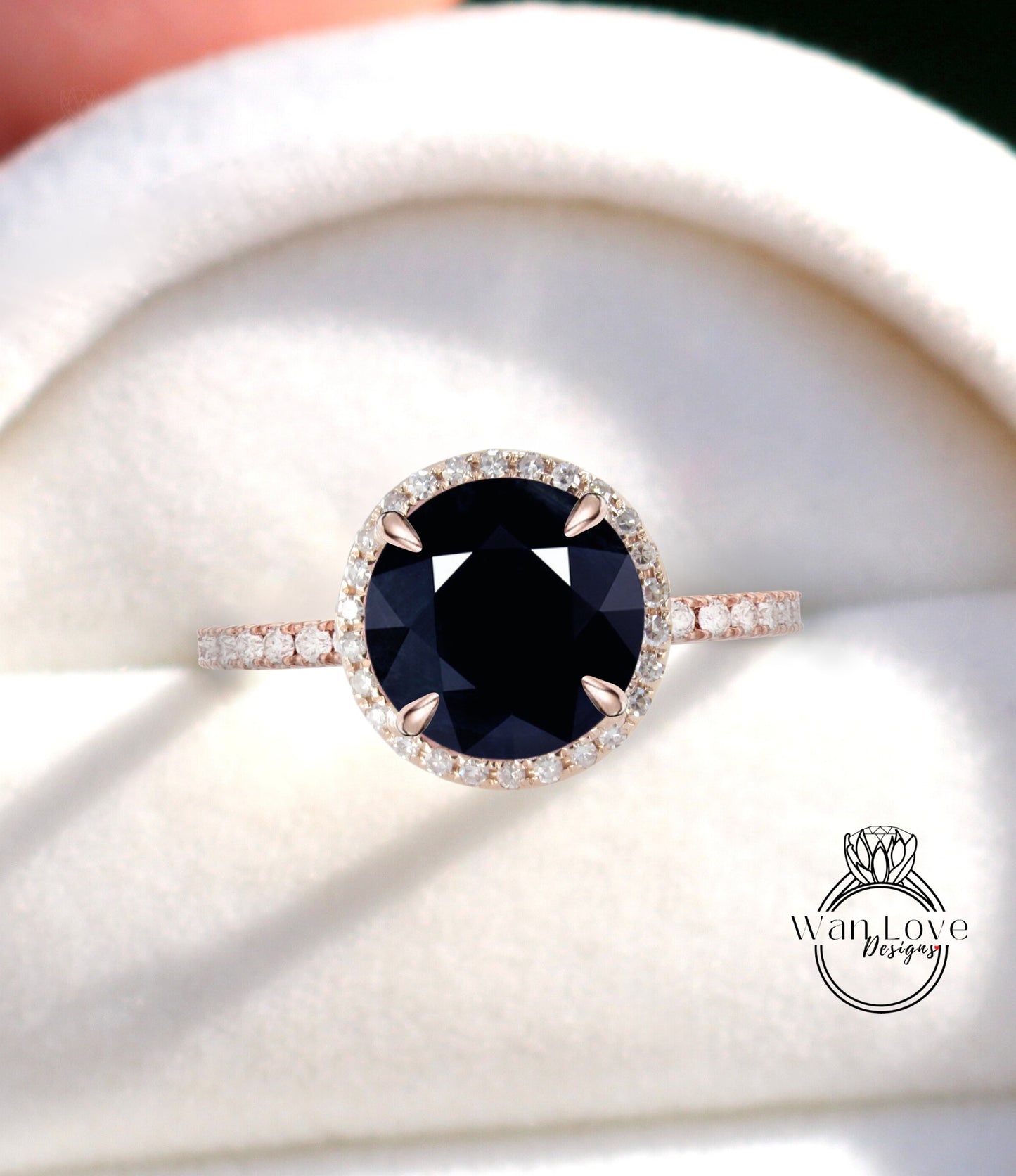 Natural Dark Blue Sapphire & Diamond Halo Engagement Ring Round 1.5ct 7mm 14k 18k White Yellow Rose Gold-Platinum-Custom-Wedding-Anniversary