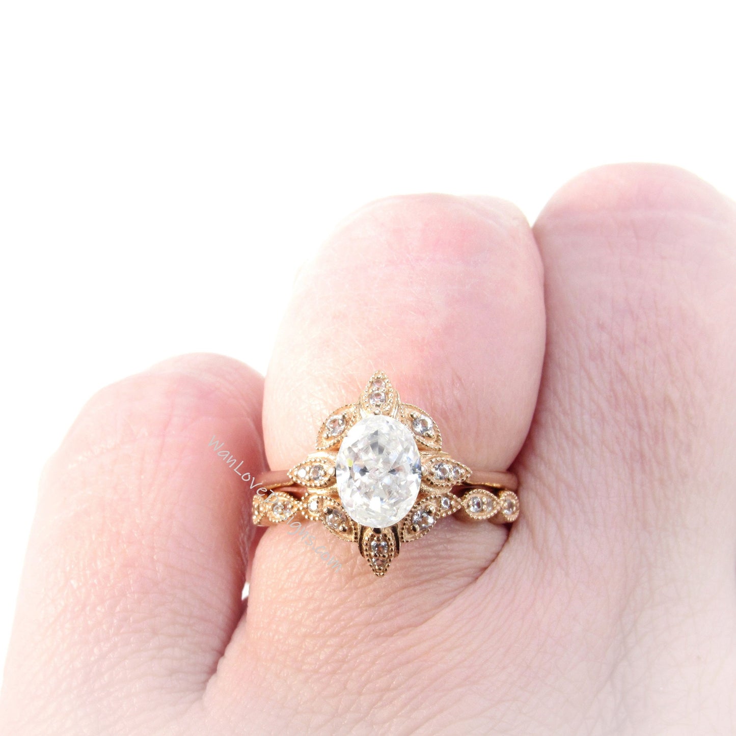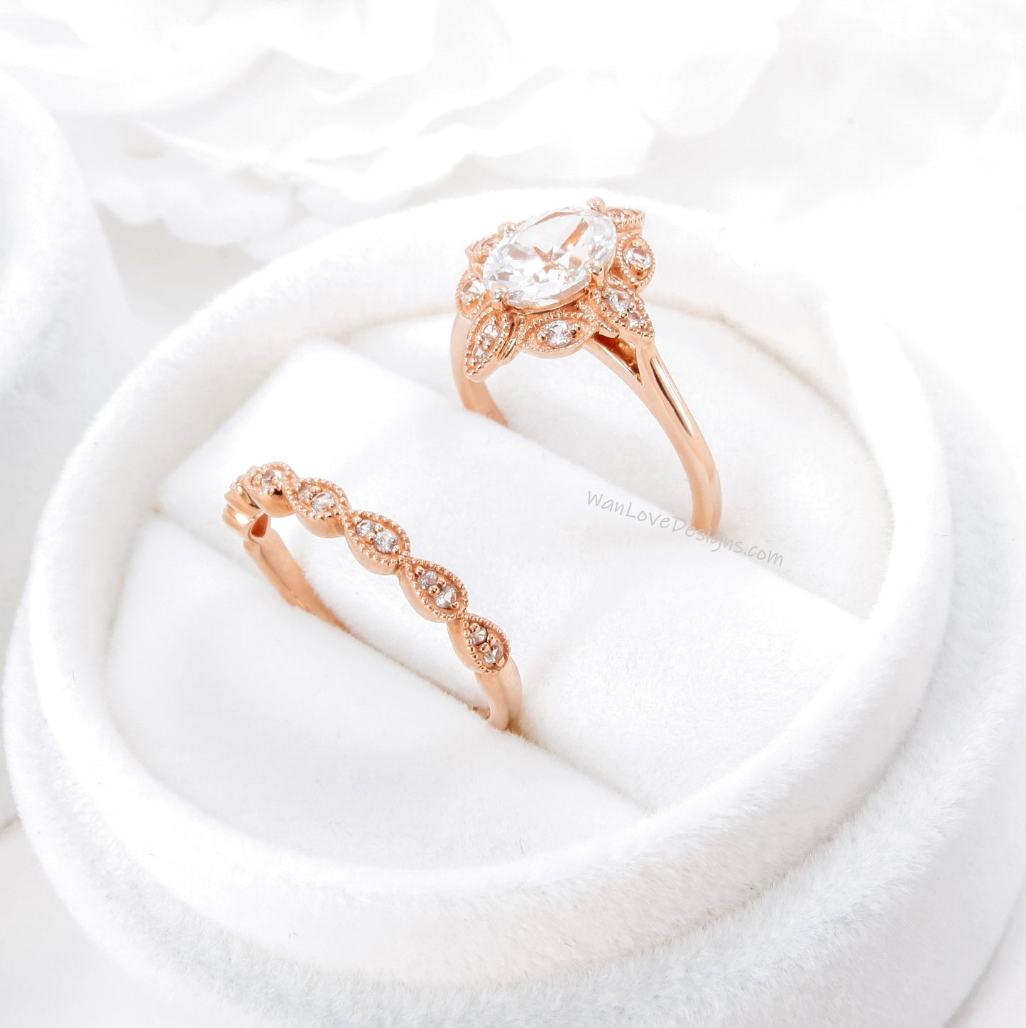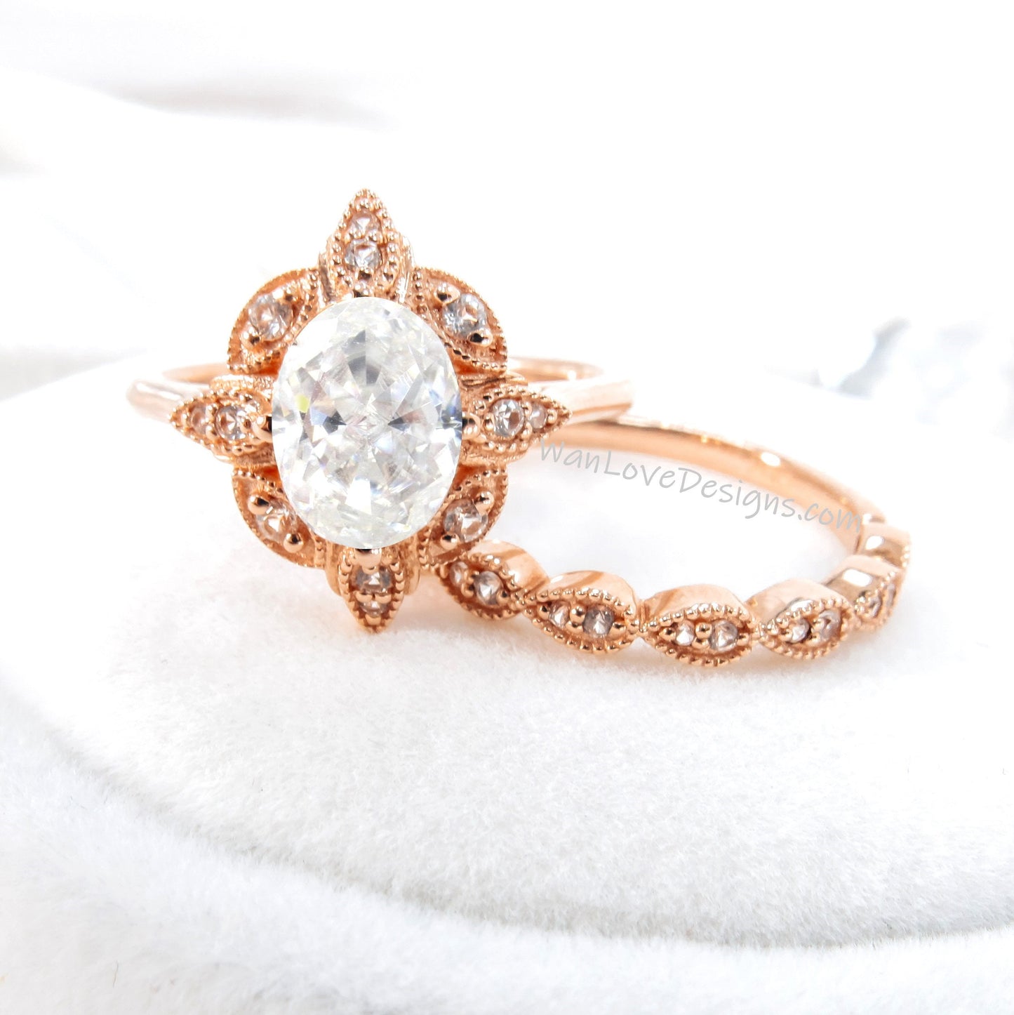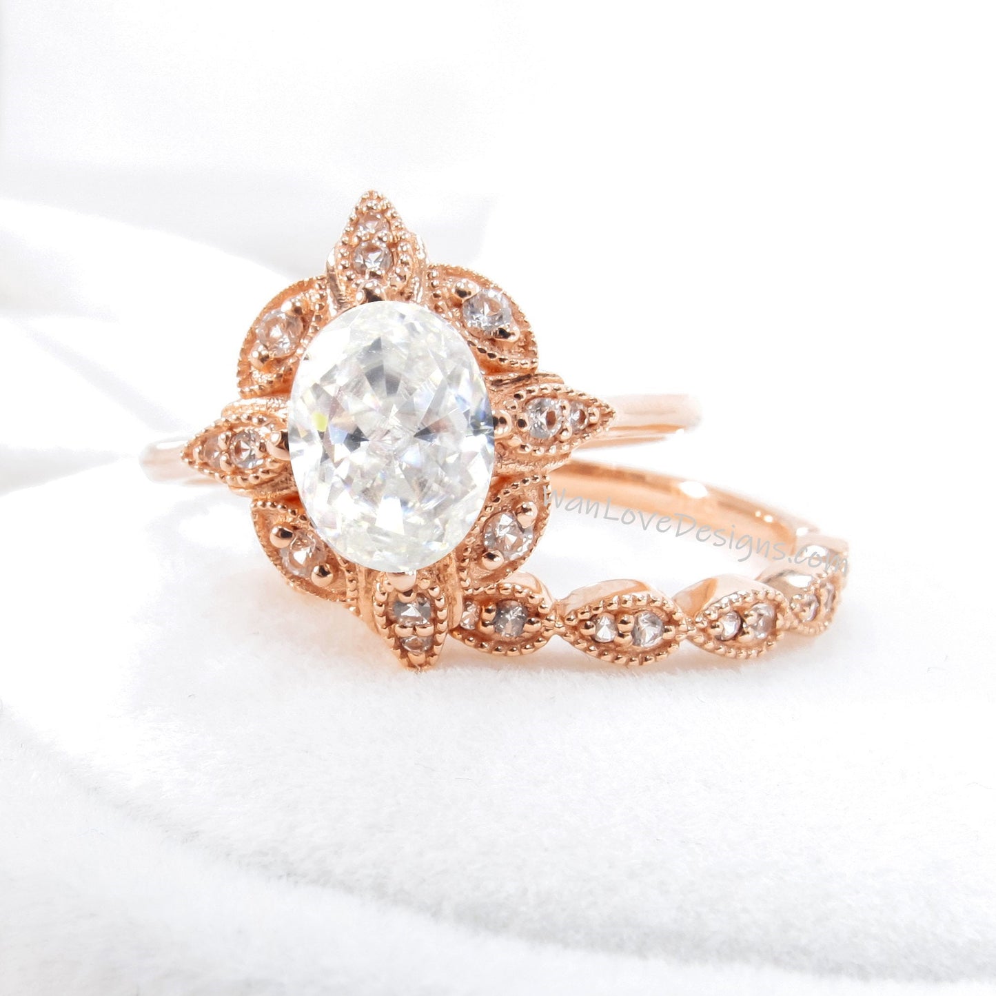 Oval Diamond engagement ring set Rose gold Halo vintage engagement ring Pear Half eternity Lab grown Diamond ring Bridal Anniversary gift