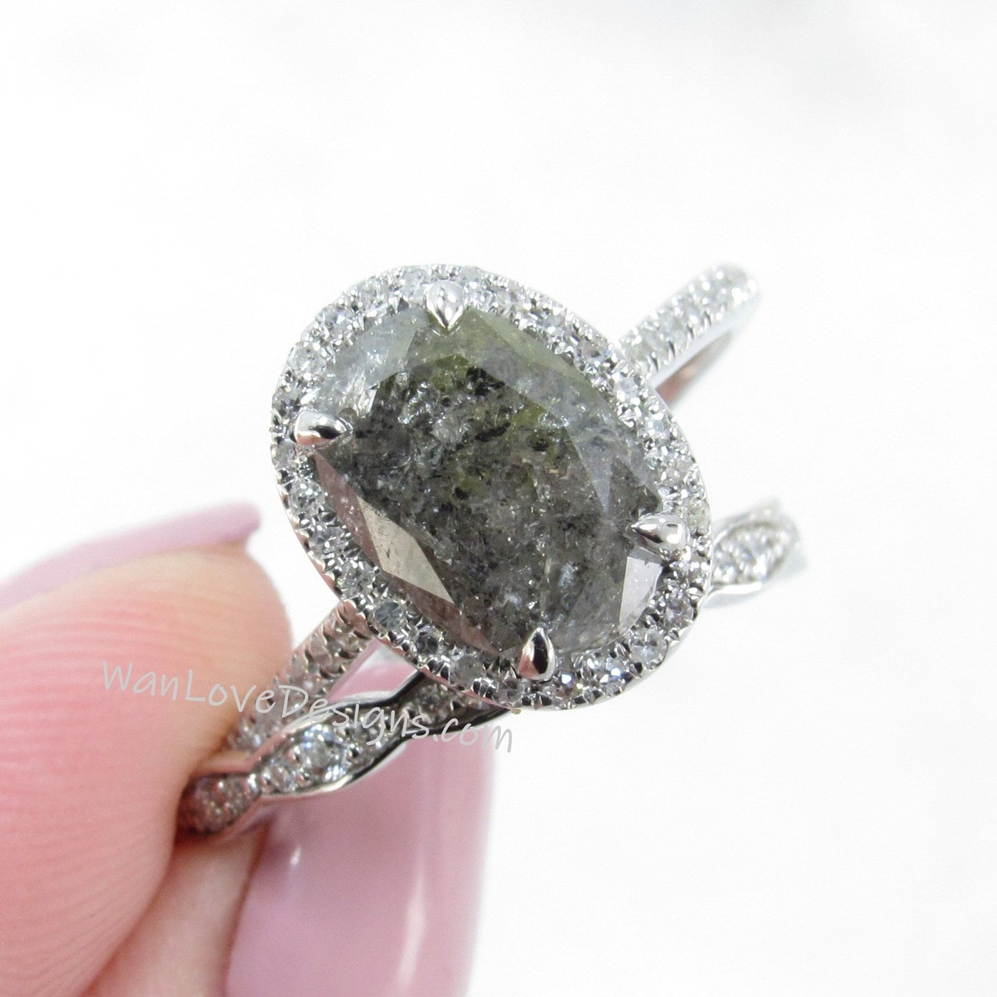 Each Custom Unique piece is Created just for you. All photos & videos are for Examples. We customize the size, center & side gems to your specifications chosen. We will send photos of available diamond options (depending on shape & weight chosen) for you to select from. Looking for a completely customized piece? Larger or smaller center gem, salt & pepper, round faceted, rose cut, etc. Lower & higher priced. Inquire with details for a customized quote.