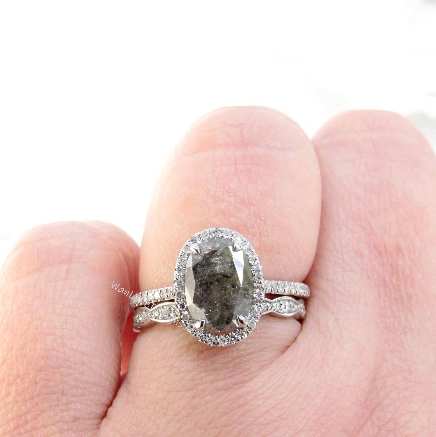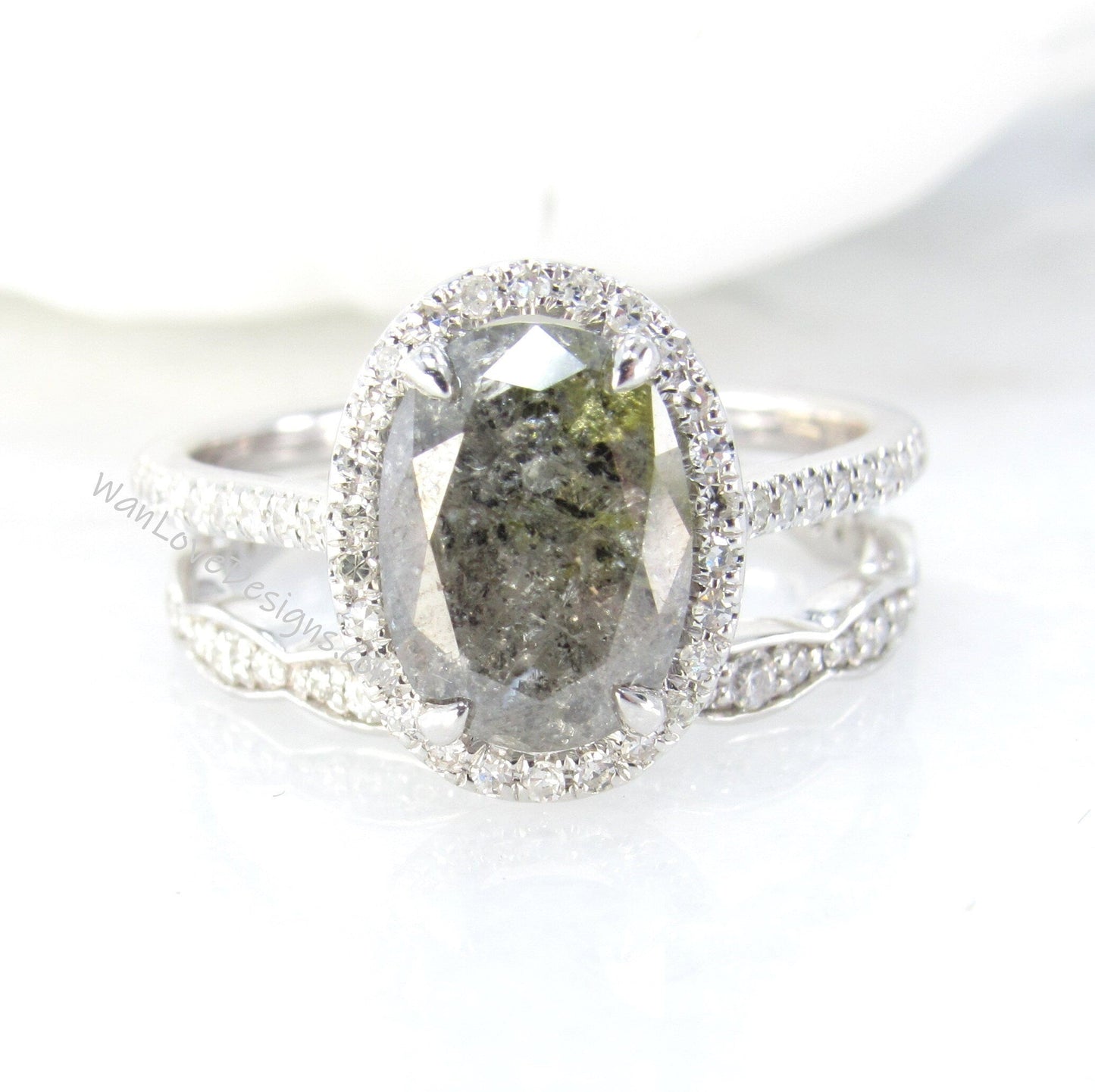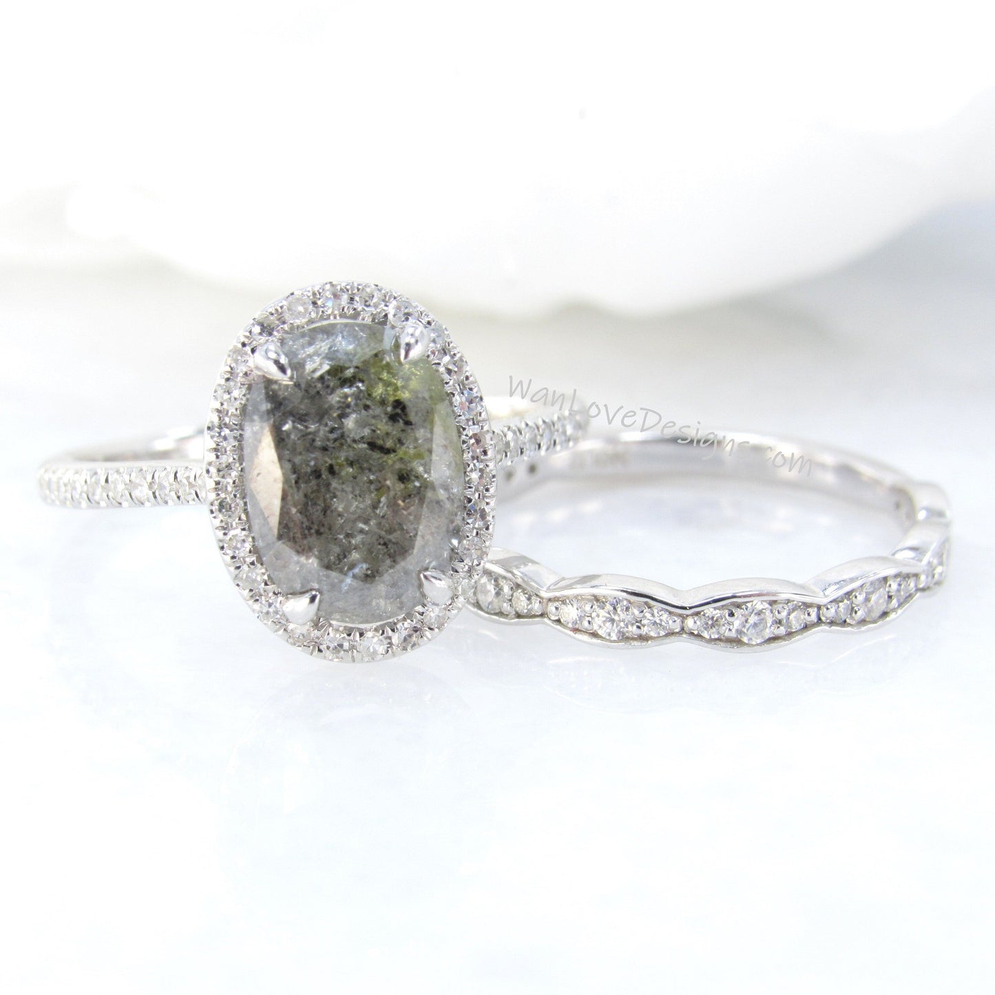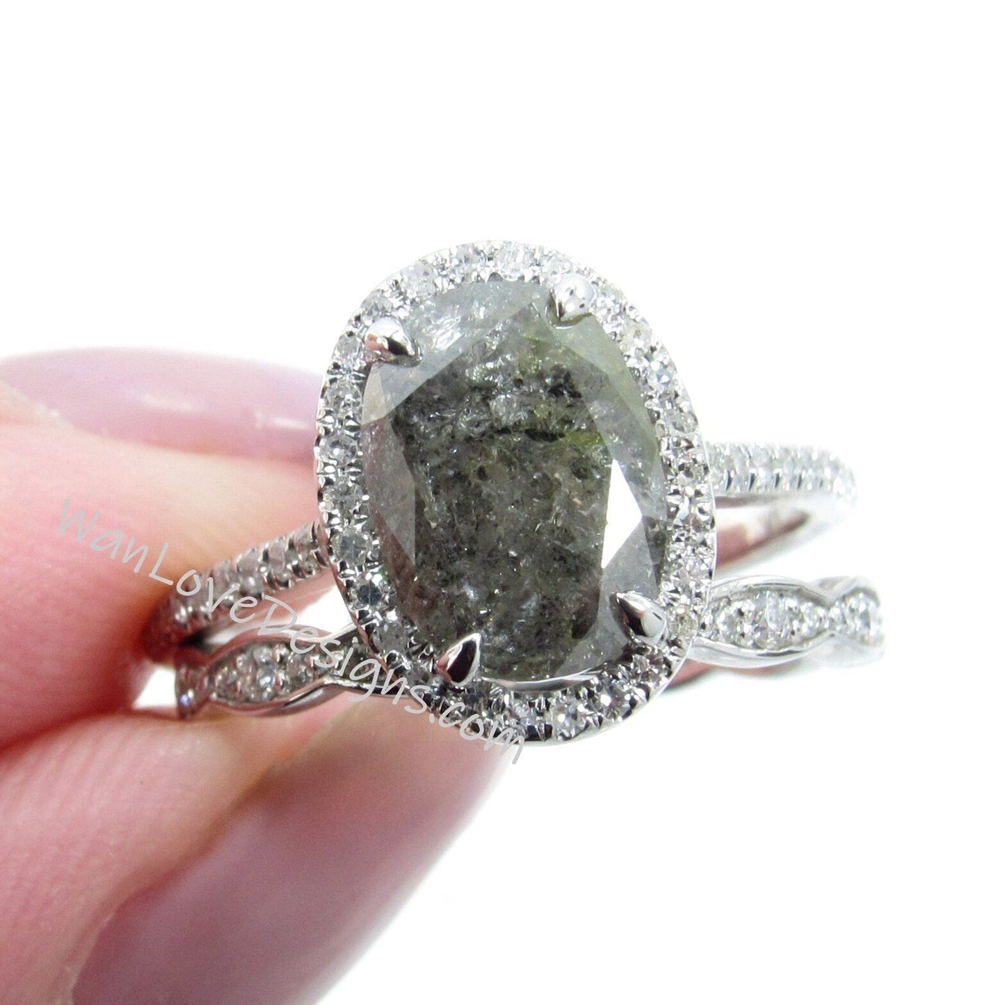 Oval Halo Bridal Set, Art Deco Bridal Rings, Salt & Pepper Diamon d Engagement Ring, Art Deco Wedding Band, Salt Pepper Diamond Gold Rings