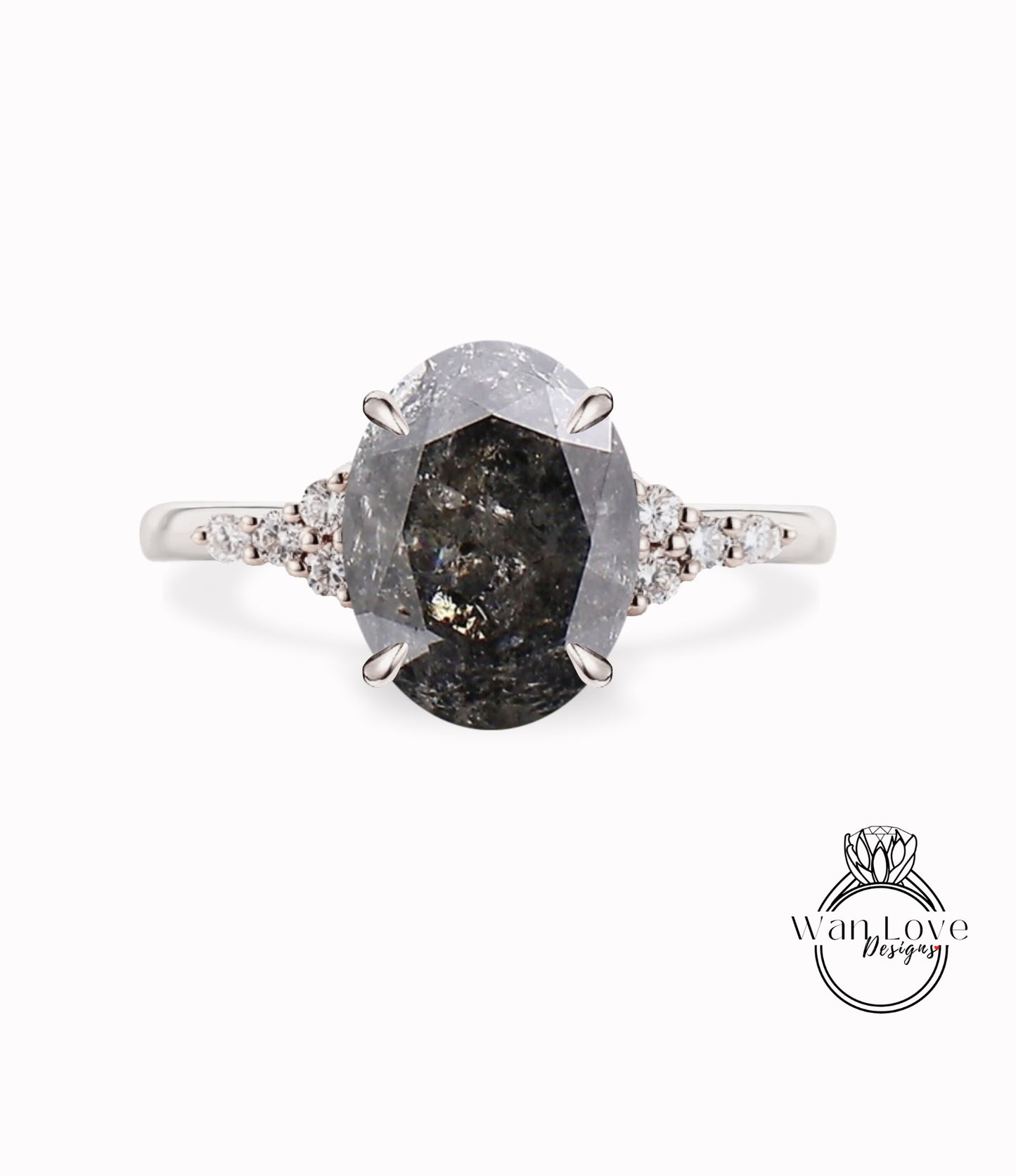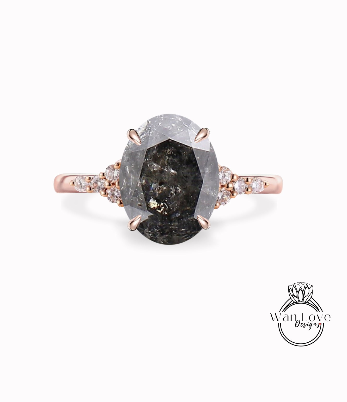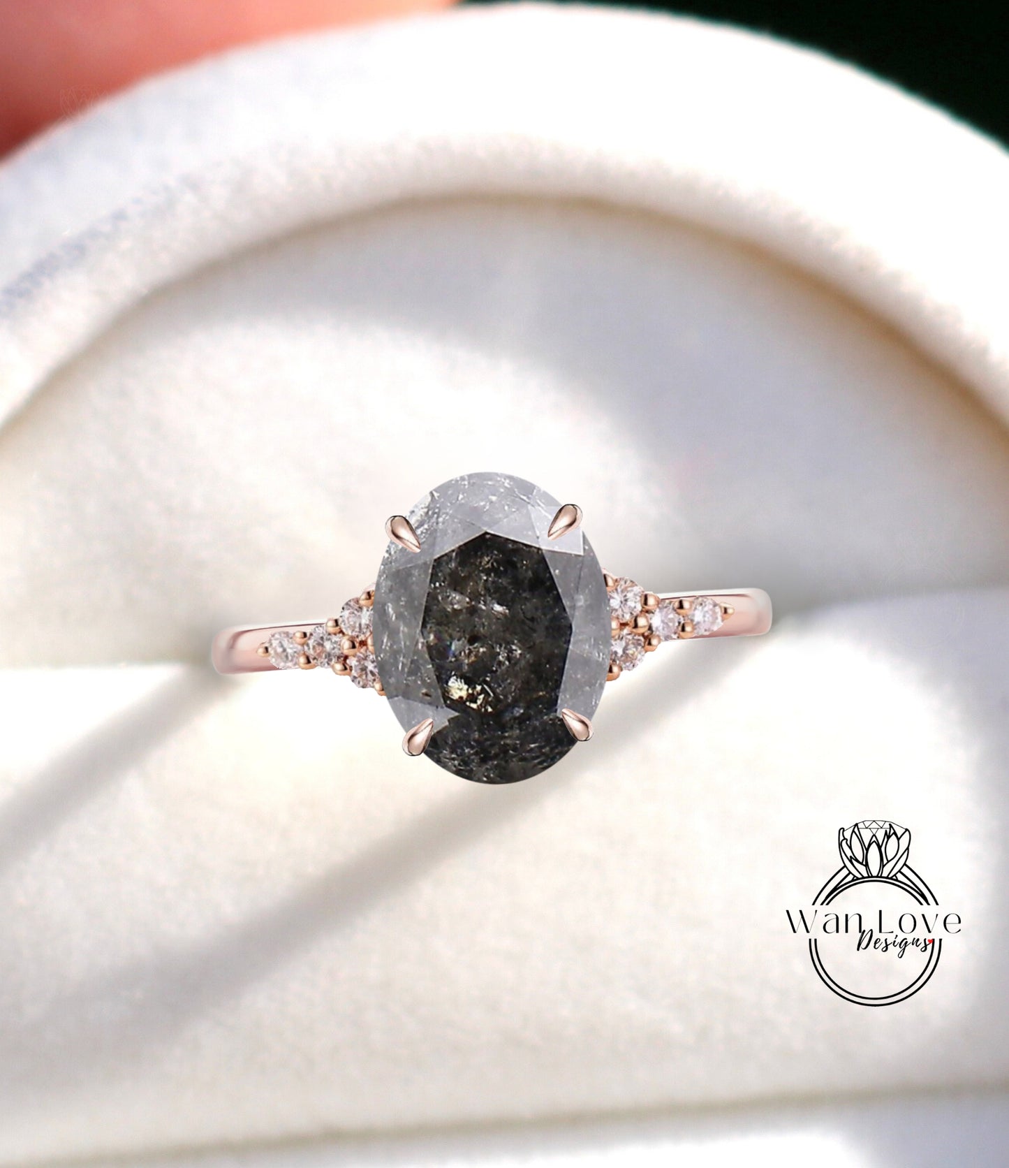 Oval Salt & Pepper Diamond Cluster Engagement Ring, Galaxy Diamond Wedding Ring, Custom Oval Diamond Ring Bridal Promise Ring solid gold