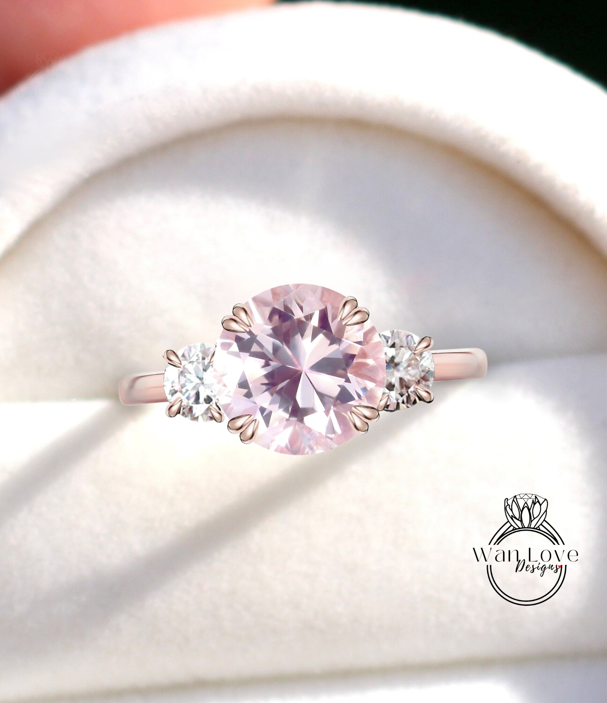 Peach Sapphire & Diamond round 3 Gem stone Engagement Ring 14k 18k White Yellow Rose Gold-Platinum-Custom three gemstone moissanite diamond bridal wedding ring Anniversary Gift