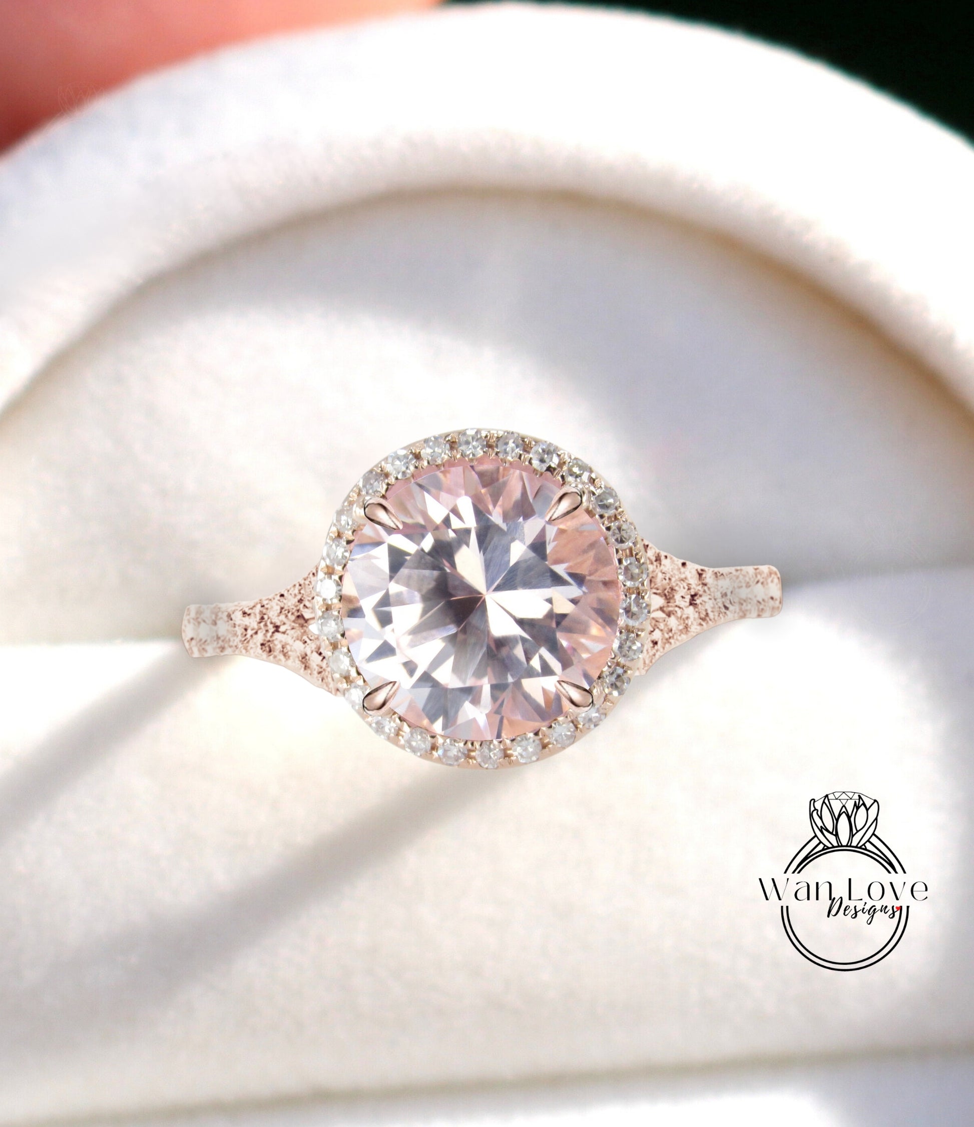 Peach Sapphire & Diamond Round Halo split shank engagement ring rose gold diamond art deco ring anniversary gift