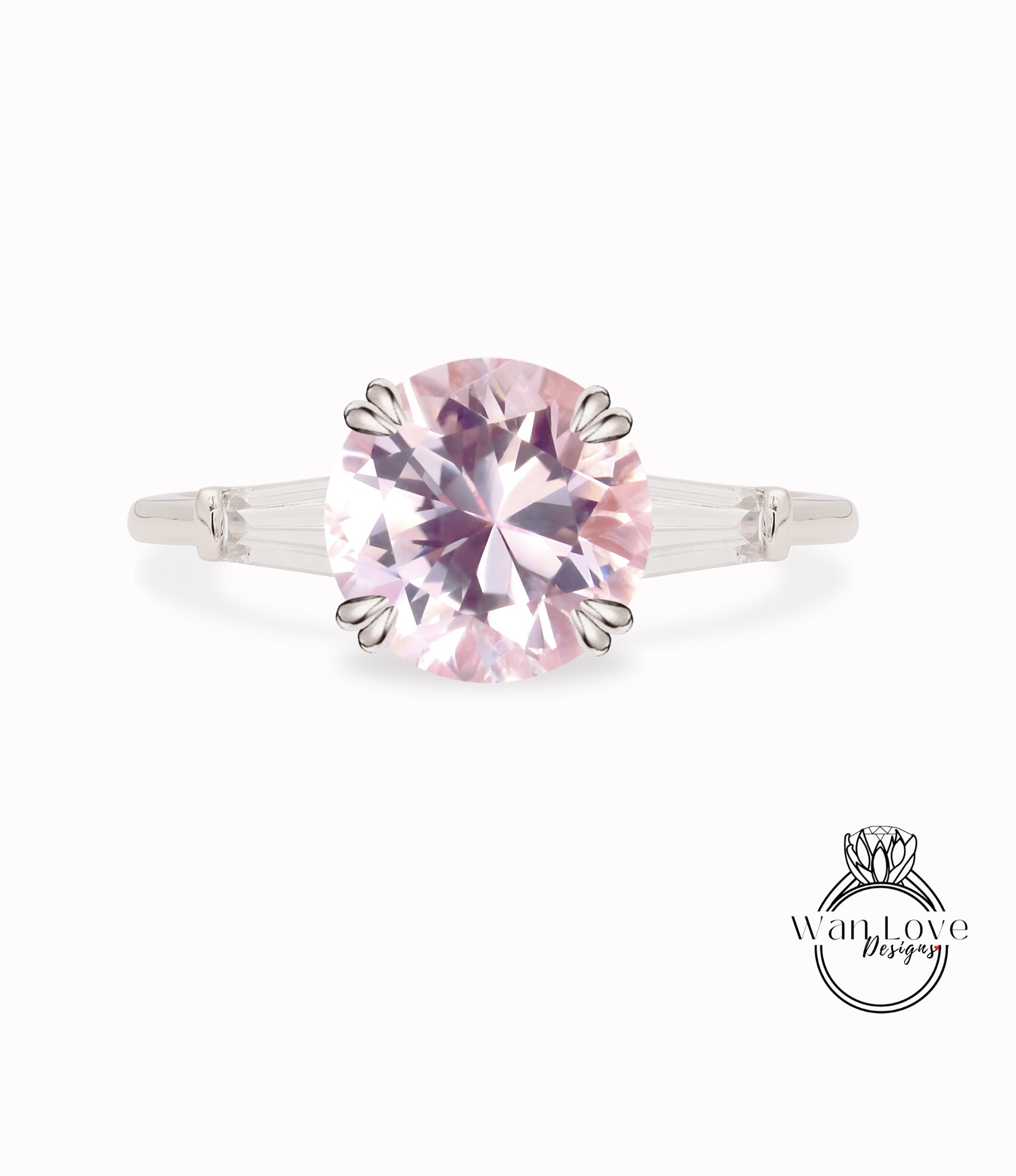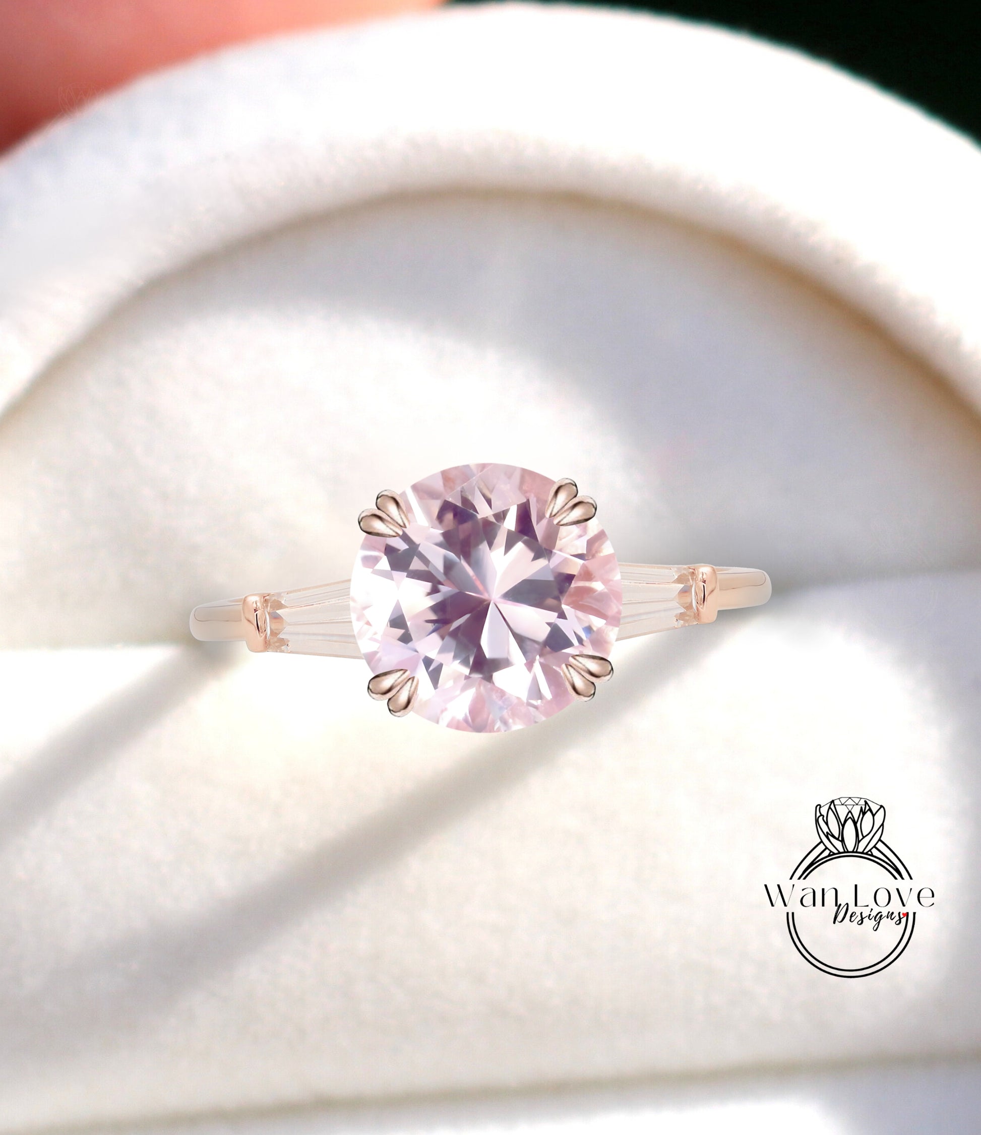 Peach Sapphire & Diamond Round Tapered Baguette 3 gem Engagement Ring, Custom Moissanite lab diamond 14k 18k White Yellow Rose Gold Platinum Wedding bridal ring, Anniversary gift
