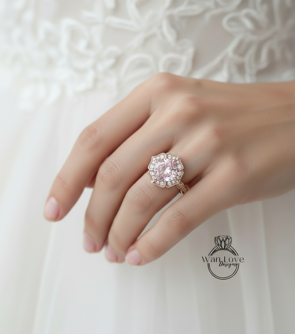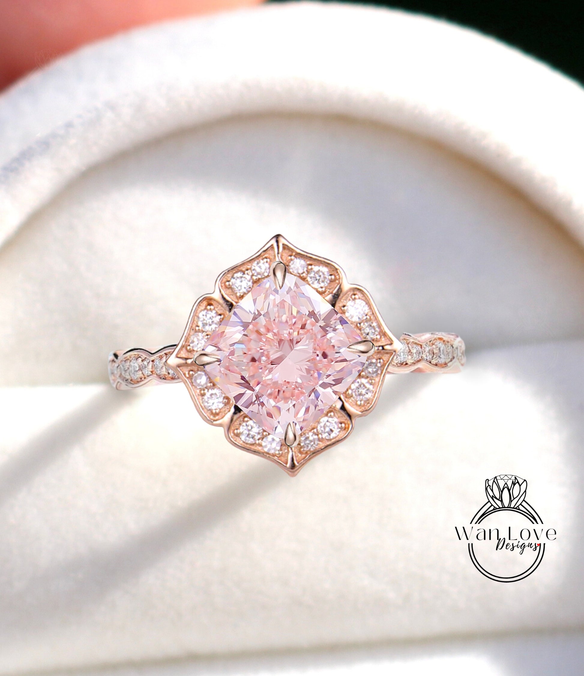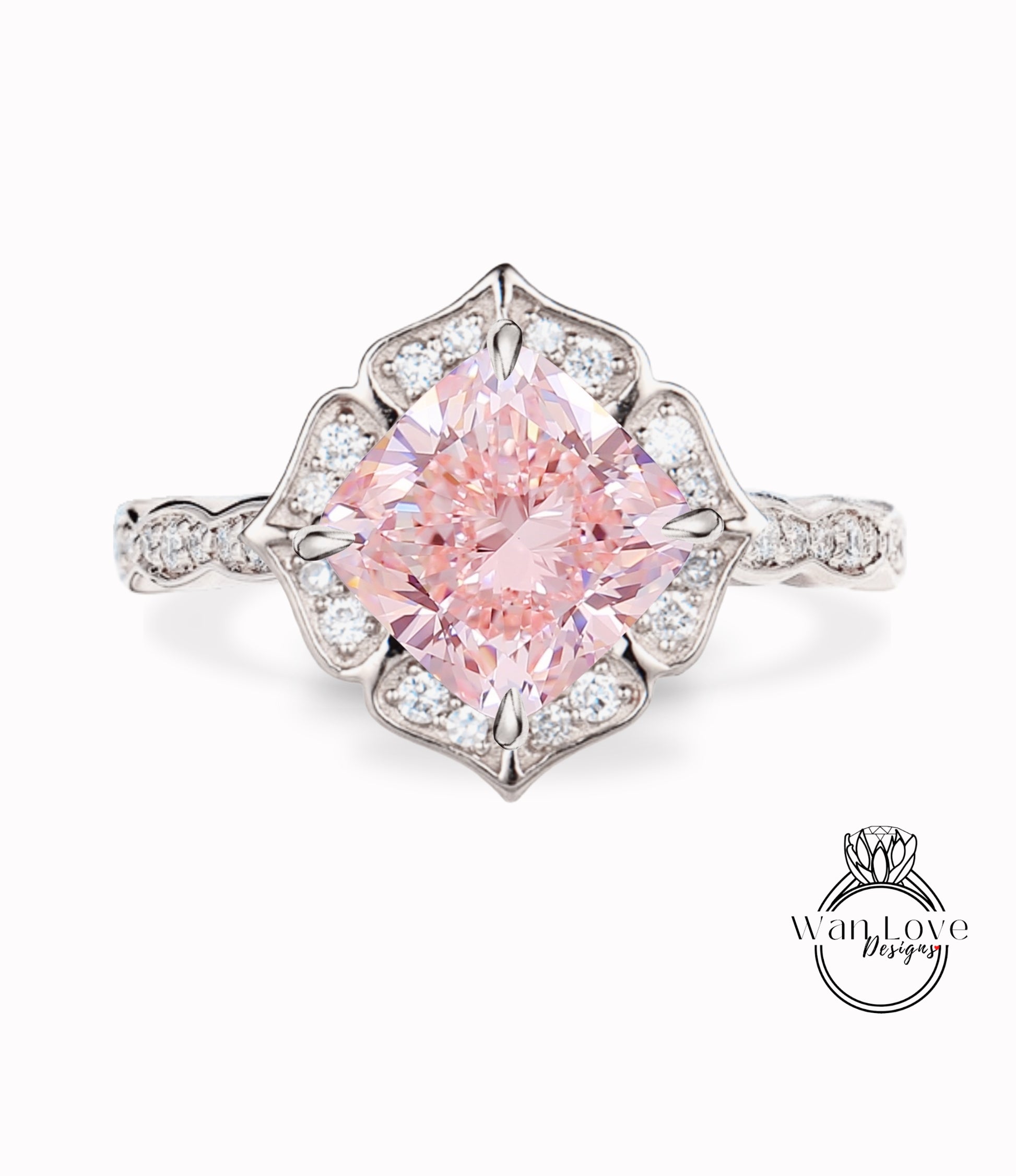 Pink Diamond Scalloped Floral Cushion Halo Leaf Antique Engagement Ring, WITH or WITHOUT Milgrain, 14k 18k Gold, Platinum Anniversary Gift