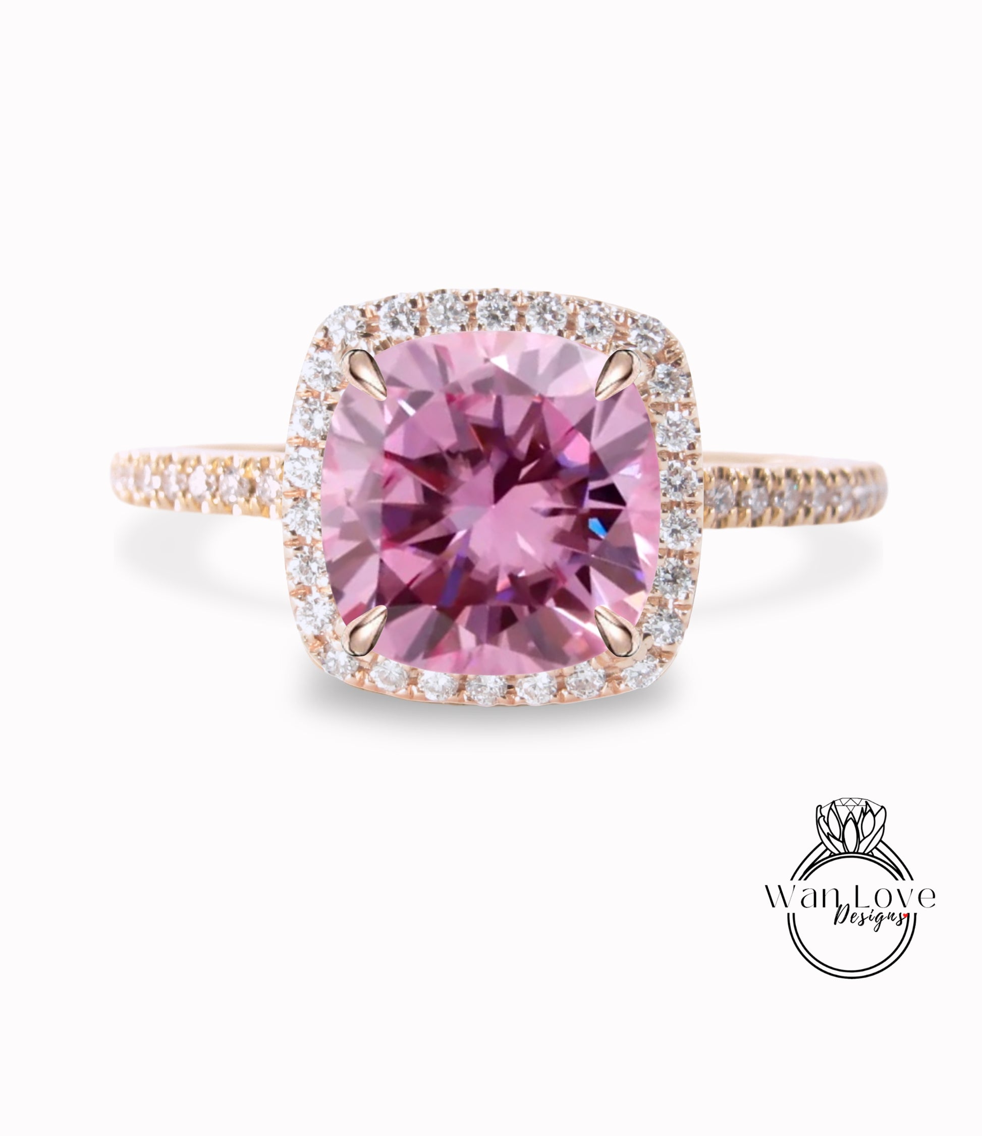 Pink Moissanite & Diamond Cushion Halo Engagement Ring, Half Eternity Rose White Gold ring Custom, Bridal Wedding ring, Anniversary Gift
