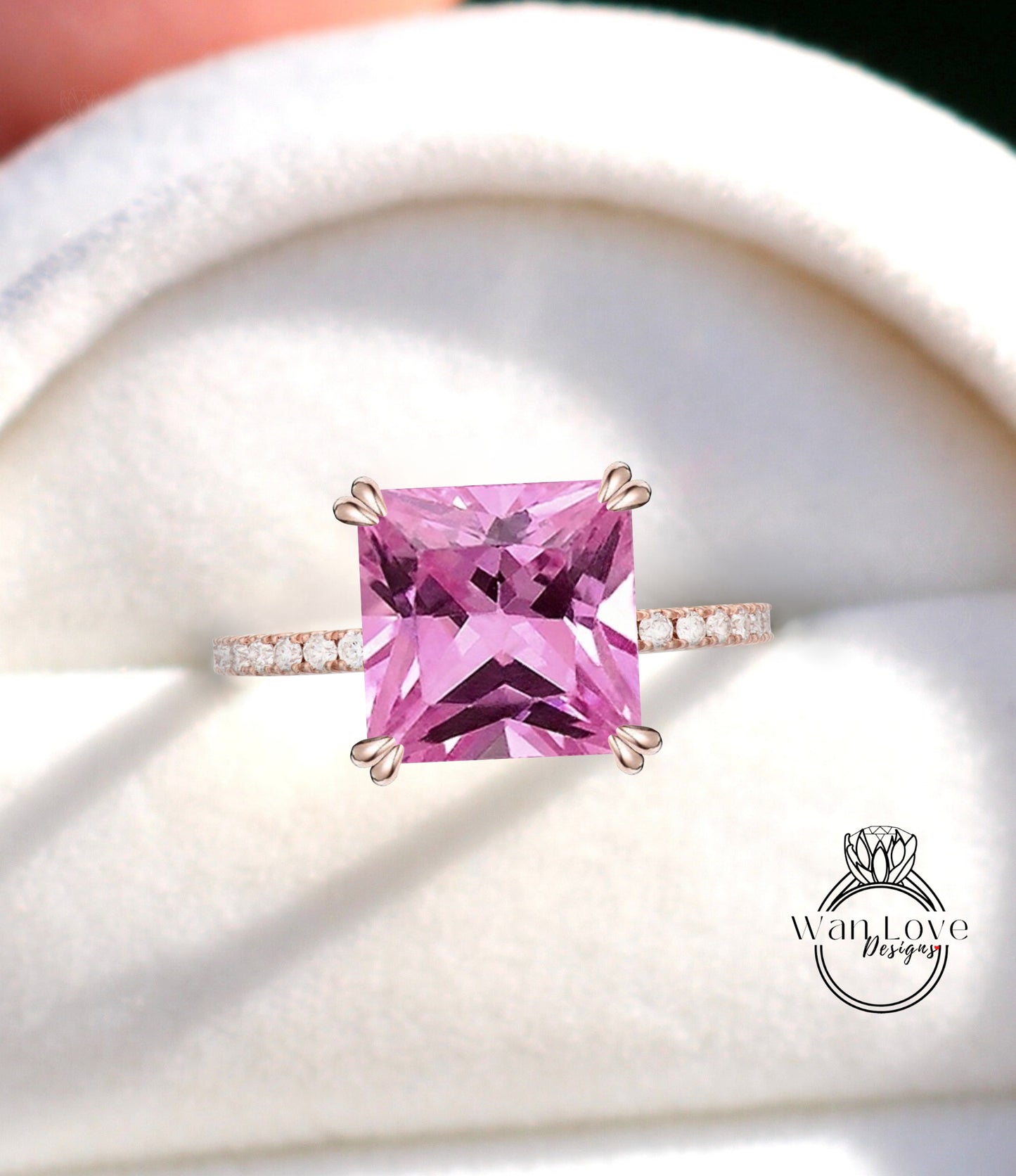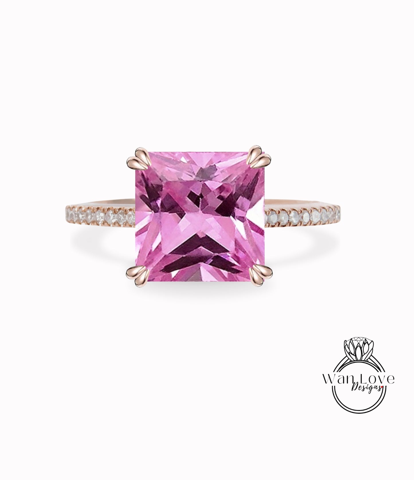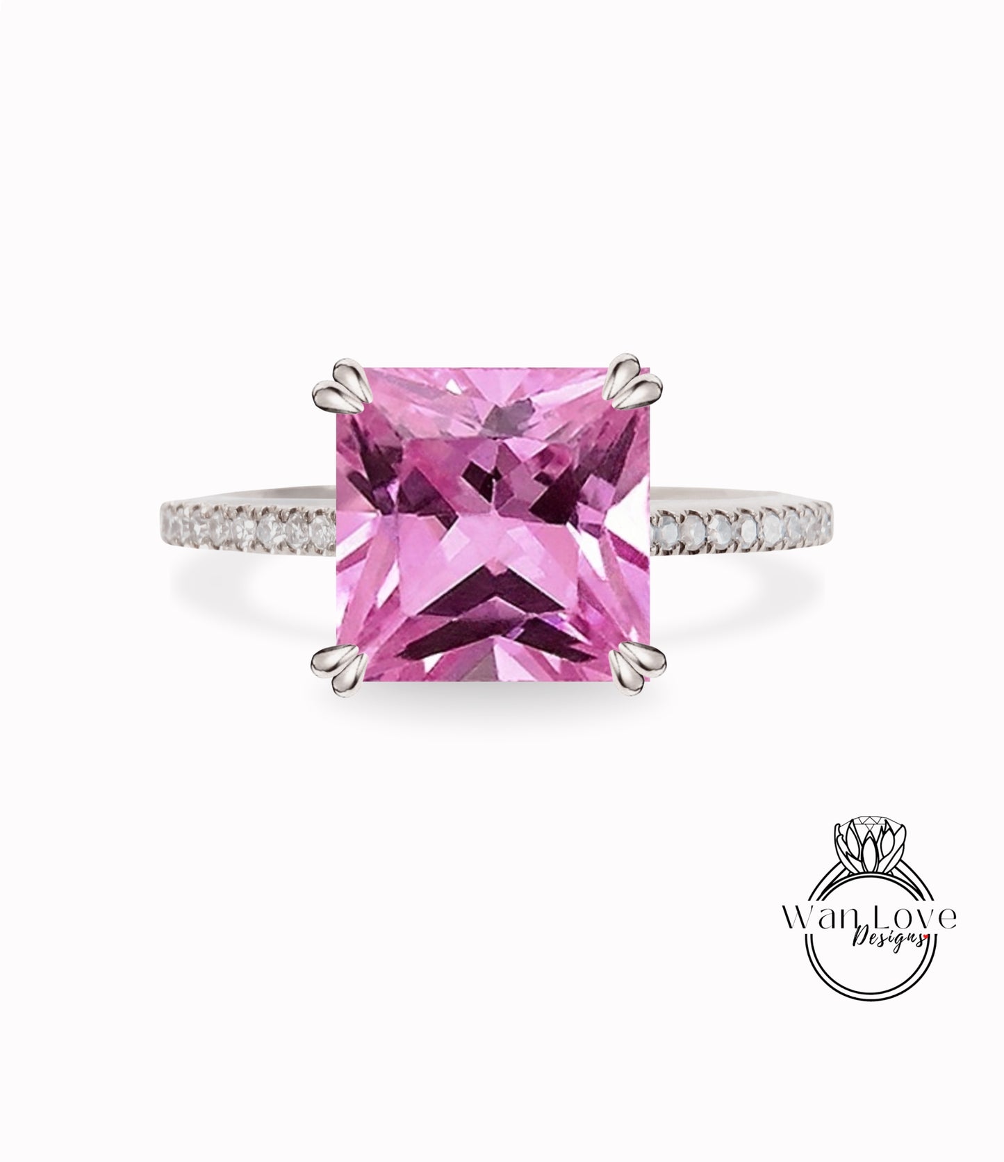 Pink Sapphire & Diamond Princess Engagement Ring, Cathedral Basket 14kt 18kt Gold-Platinum-Custom-Wedding, WanLoveDesigns