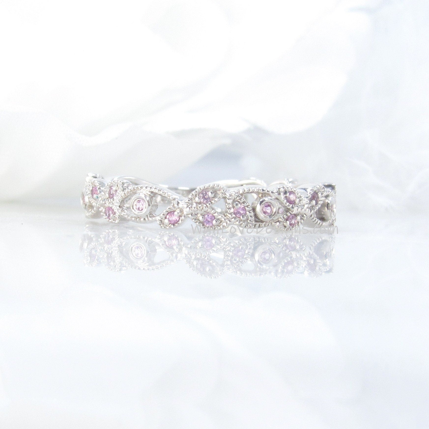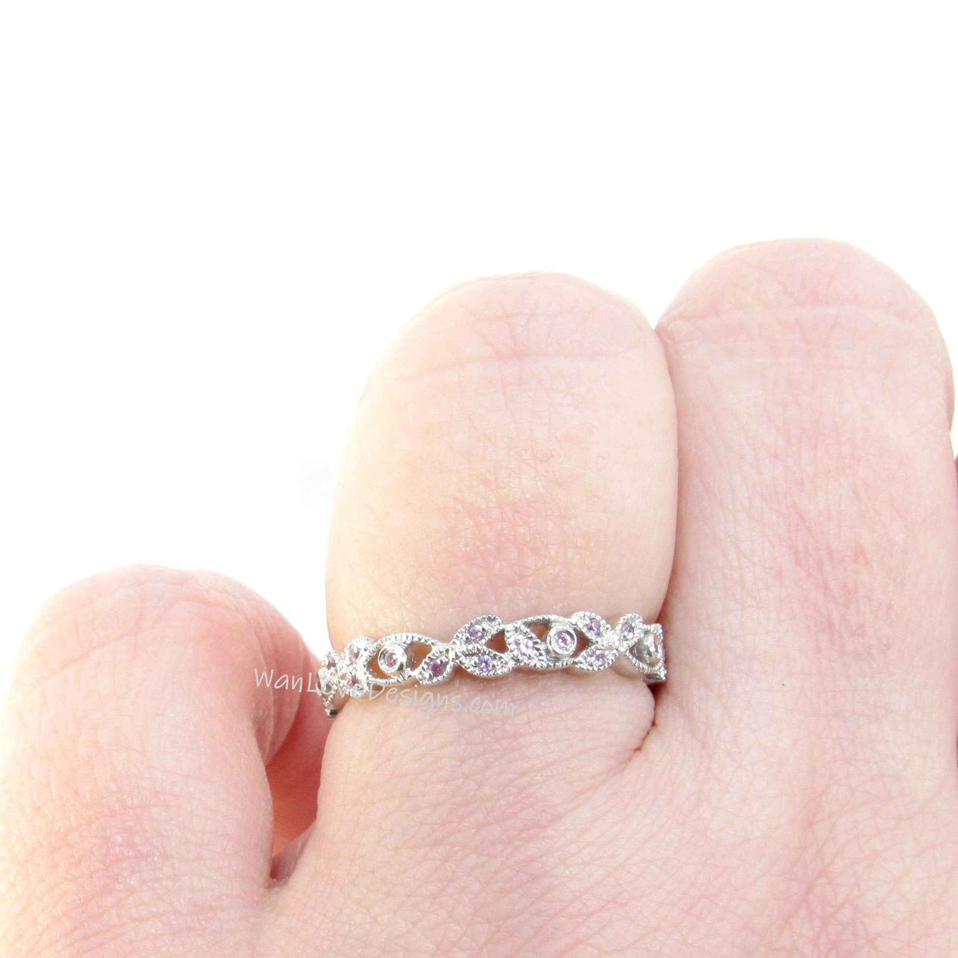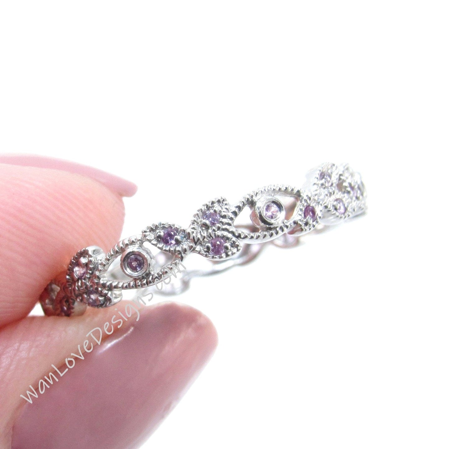 Pink Sapphire Leaf Band, Milgrain Leaves Wedding Ring, Floral Vine Ring, 14k 18k White Yellow Rose Gold Platinum, Custom