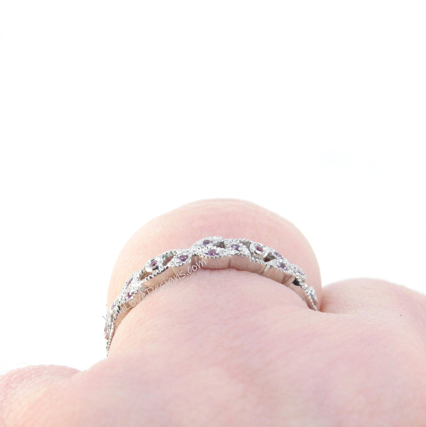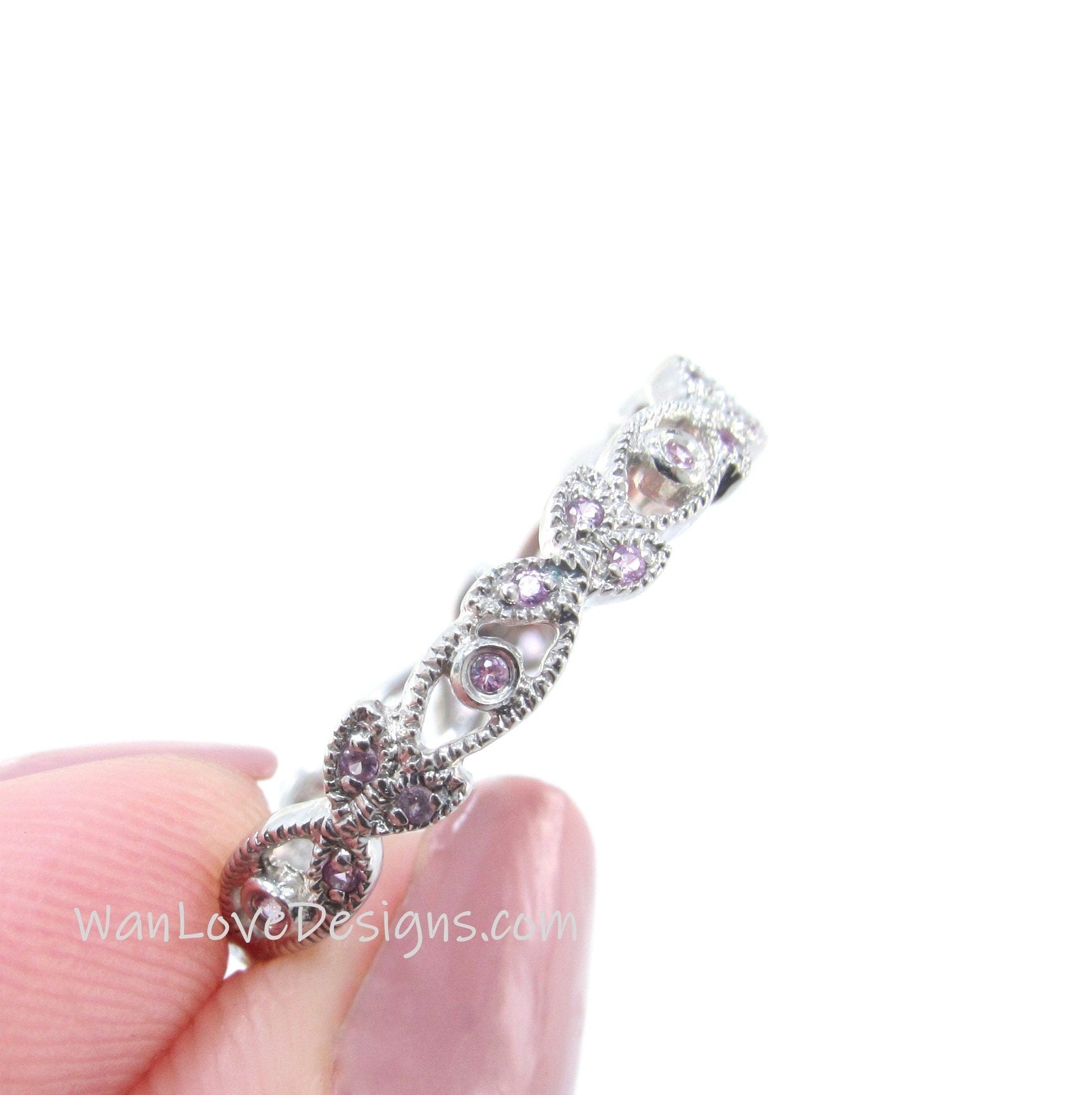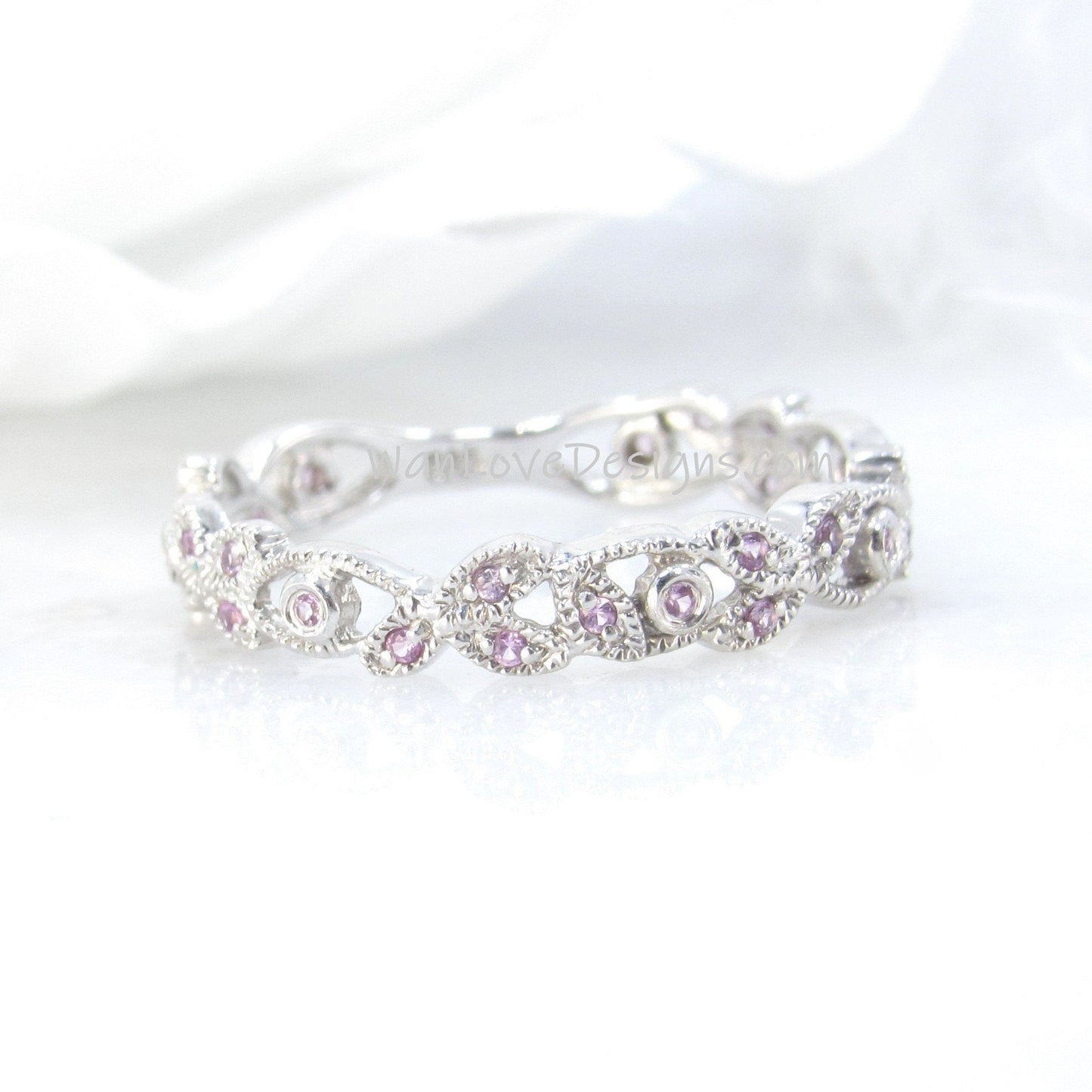 Pink Sapphire Leaf Band, Milgrain Leaves Wedding Ring, Floral Vine Ring, 14k 18k White Yellow Rose Gold Platinum, Custom
