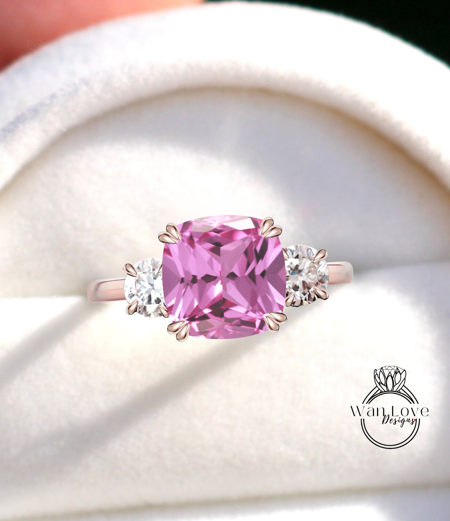 Pink Sapphire Moissanite 3 Gem Stone Engagement Ring,Cushion,Round,3ct 8mm 1ct 6mm,Custom,Wedding,Anniversary,14k 18k White Rose Yellow Gold