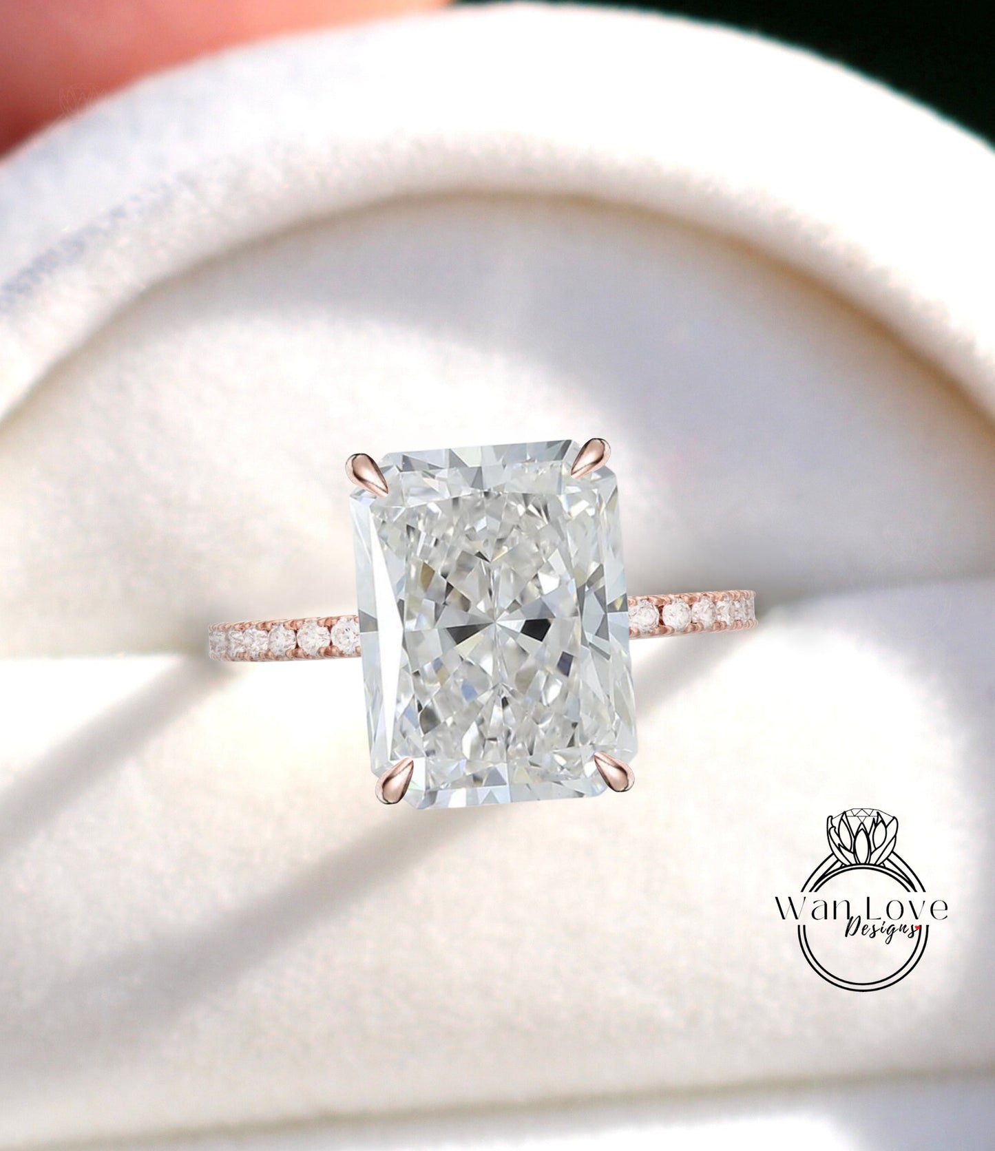 Radiant Cut Diamond Side Halo half halfway eternity Engagement Ring, Emerald cut Pave Rim wedding bridal ring 14kt 18kt Solid Gold Anniversary Gift