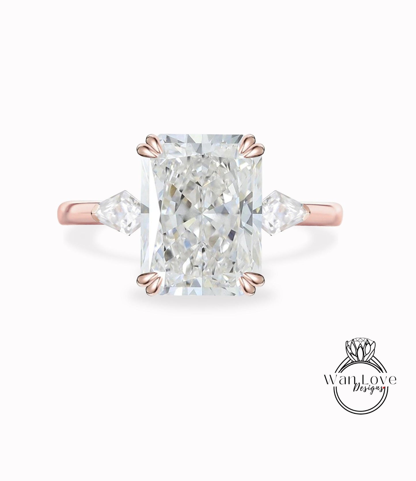 Radiant diamond engagement ring, Radiant cut diamond ring with side kite diamonds, three stone ring, wedding Bridal ring, Anniversary gift