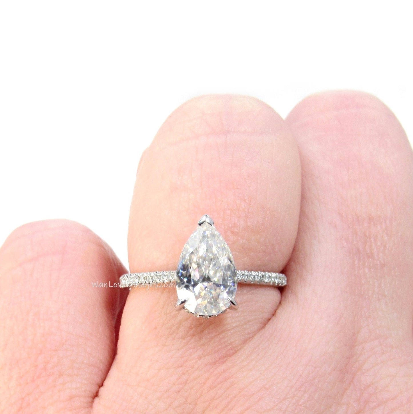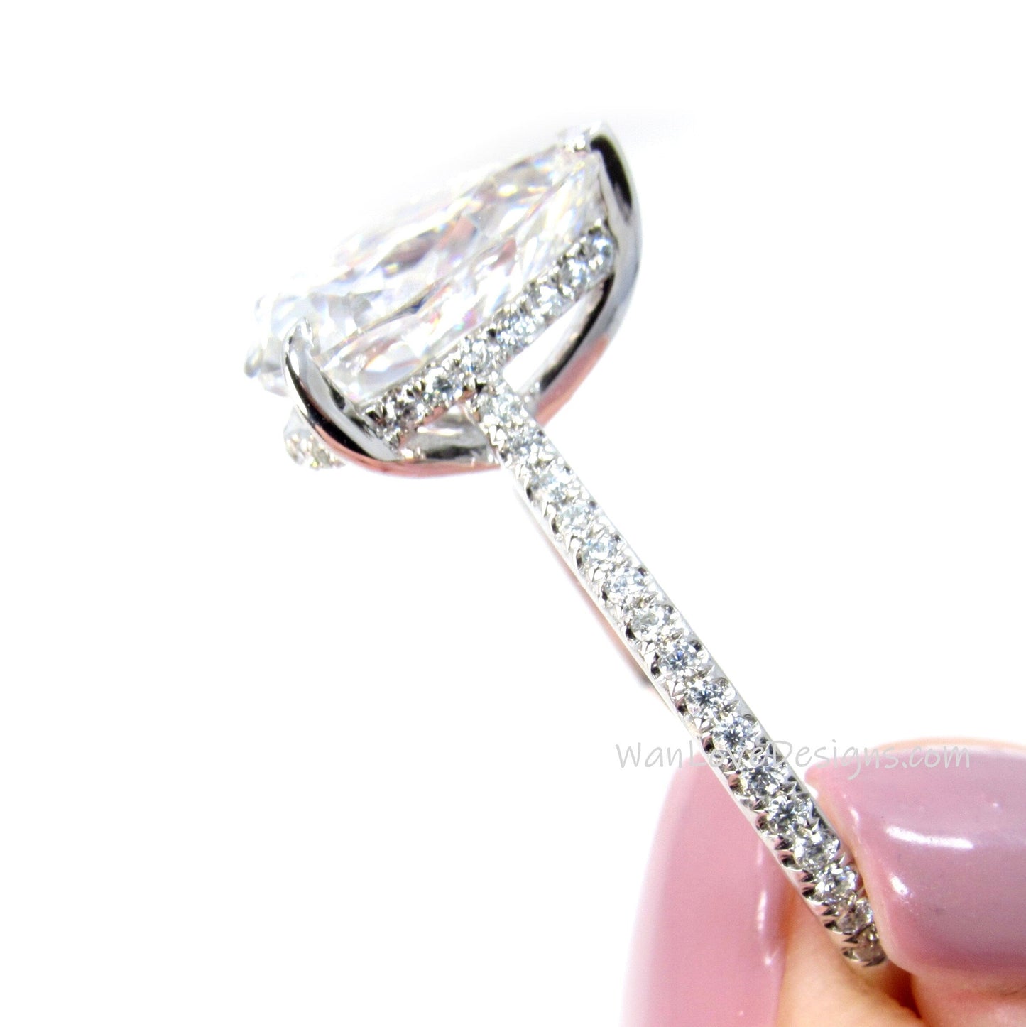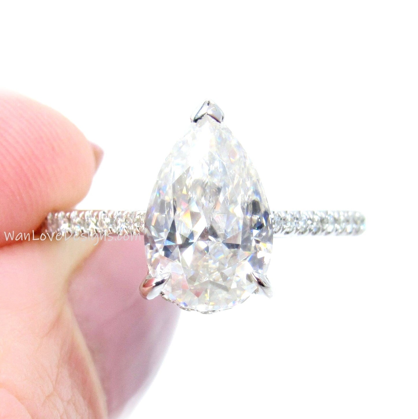 Ready to ship 3ct Moissanite Hidden Side Halo Pear Engagement Ring 14k White Gold, Almost Eternity 3/4 Band Shank, WanLoveDesigns