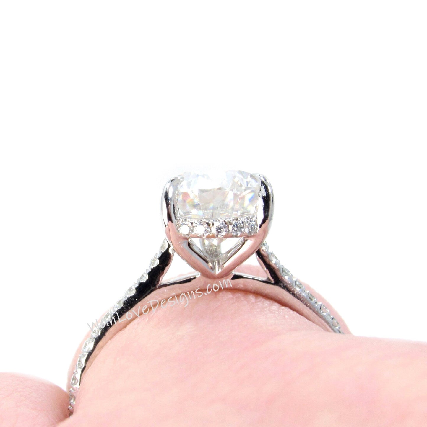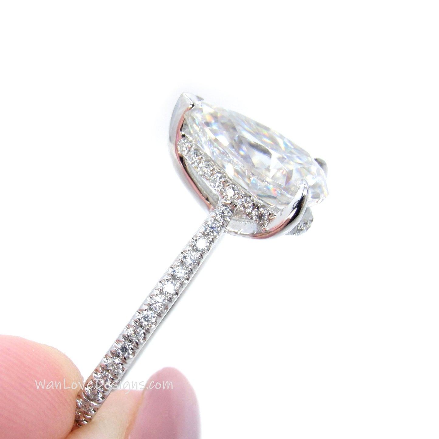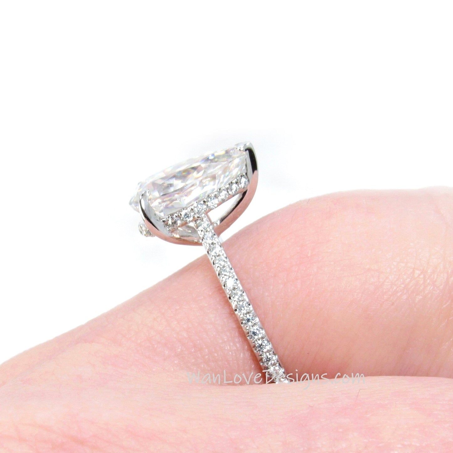 Ready to ship 3ct Moissanite Hidden Side Halo Pear Engagement Ring 14k White Gold, Almost Eternity 3/4 Band Shank, WanLoveDesigns