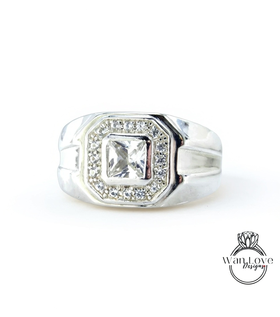 Ready to Ship White Sapphire Mens Wedding Ring Bands Ring Princess Halo .5ct Custom vintage Unique engagement ring mens wedding ring band