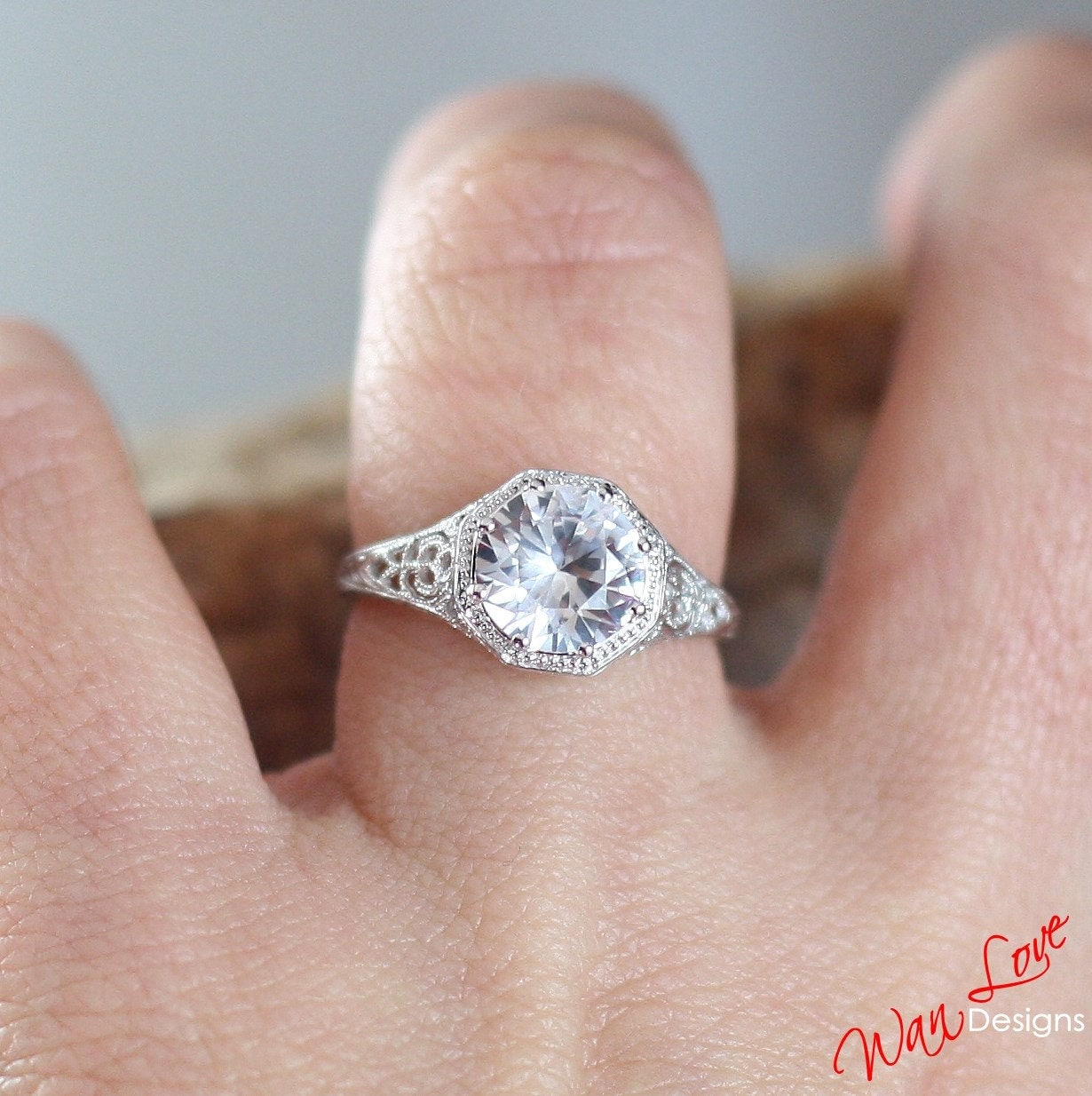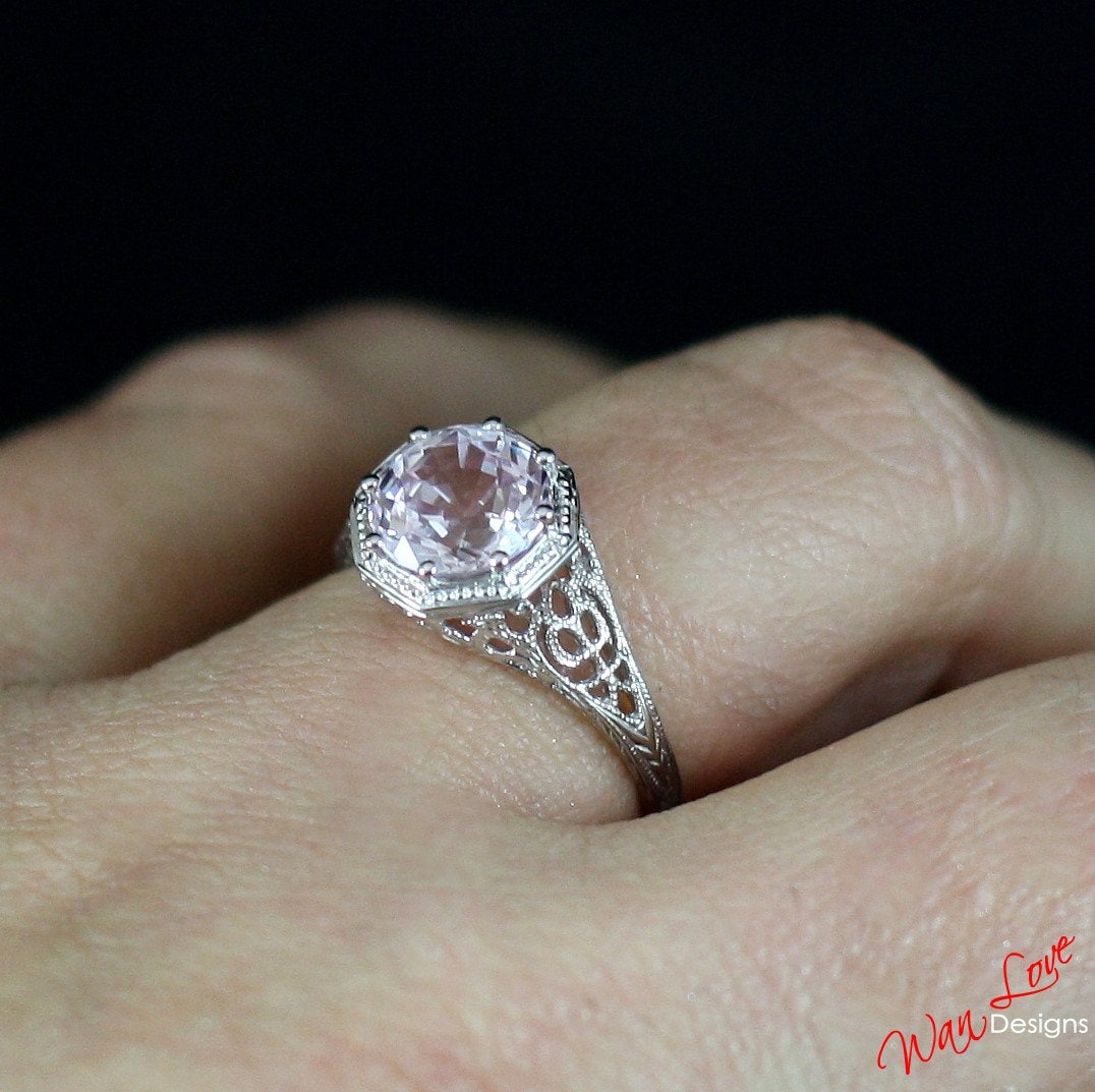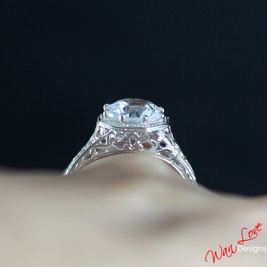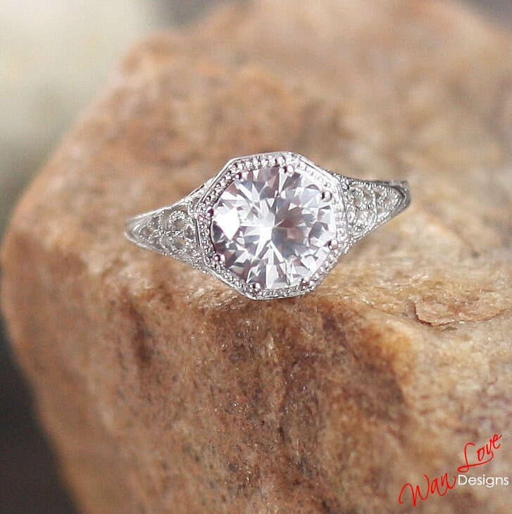 Ready to ship White Sapphire Milgrain Filigree Solitaire Round cut Engagement Ring 8 prongs 2ct 8mm Silver Rhodium Wedding Anniversary Gift.