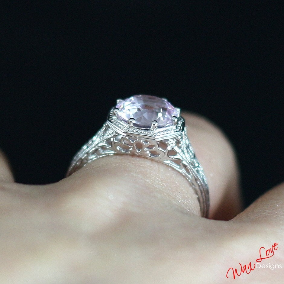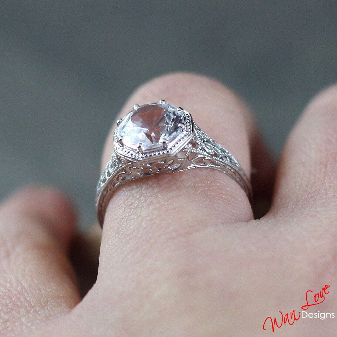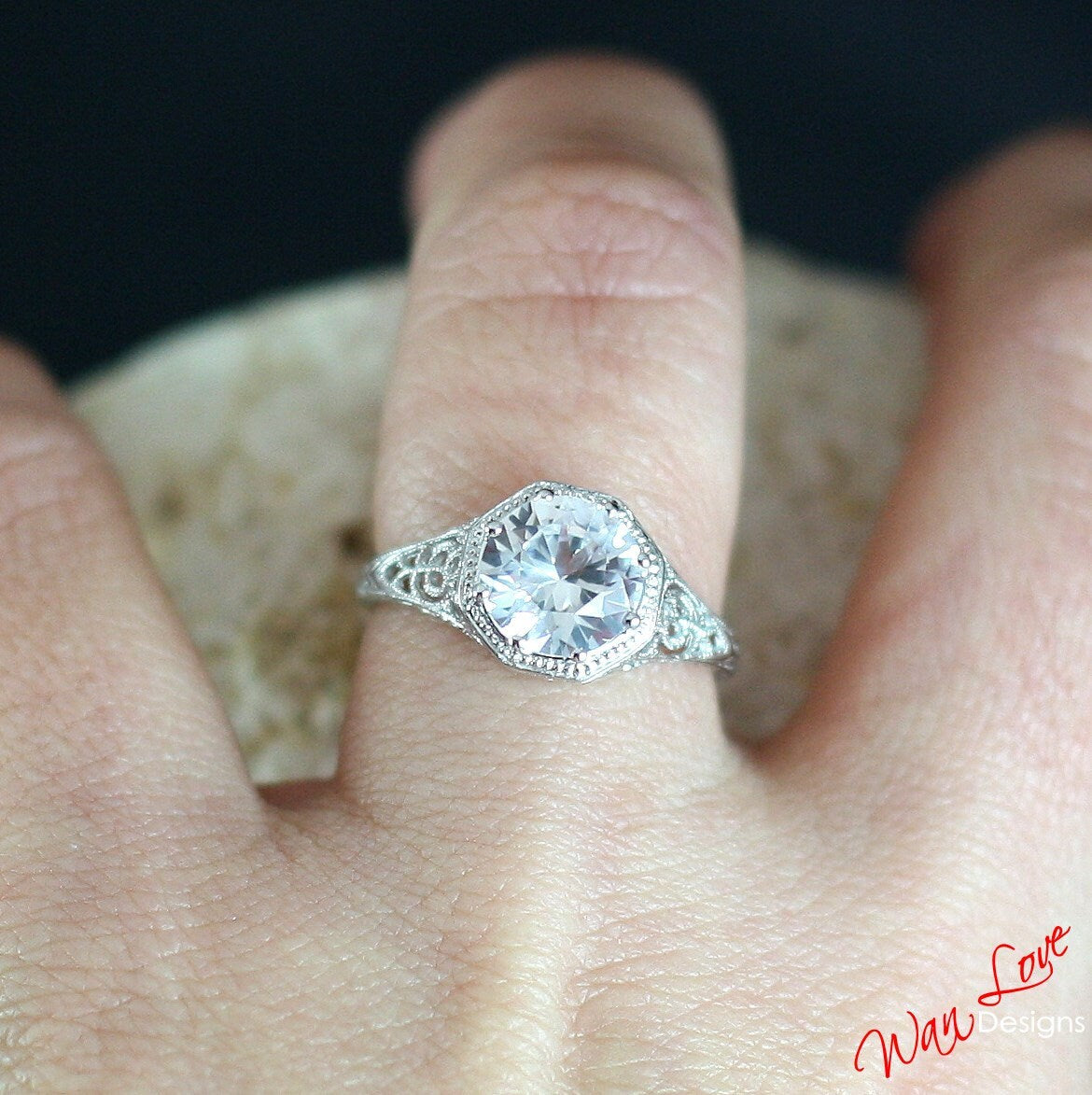 Ready to ship White Sapphire Milgrain Filigree Solitaire Round cut Engagement Ring 8 prongs 2ct 8mm Silver Rhodium Wedding Anniversary Gift.