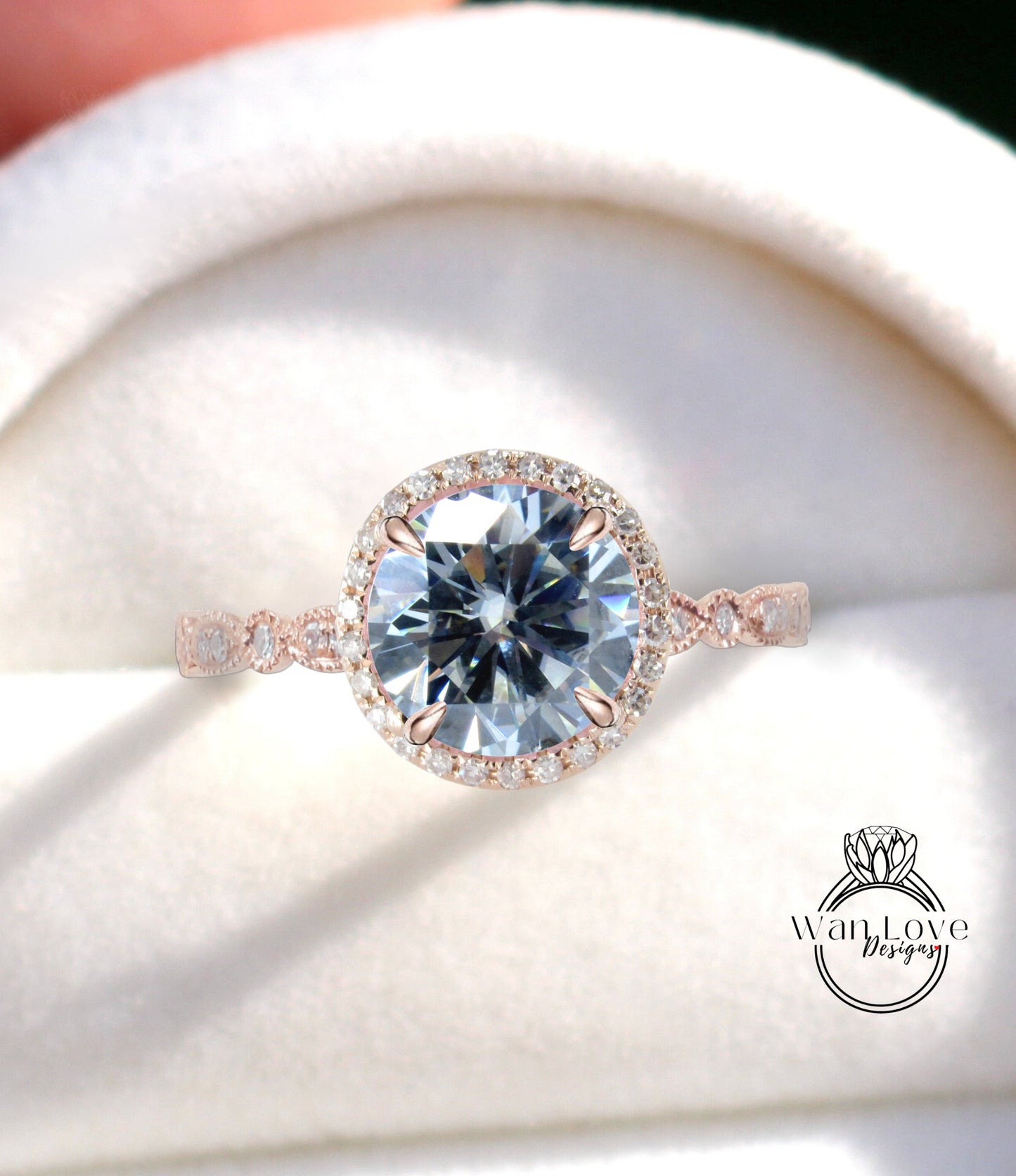 Round Halo Gray Moissanite Engagement Ring, Diamond/Moissanite Halo Wedding Ring, Scalloped Leaf Diamond Milgrain Shank Band Custom Ring, 14k/18k Gold